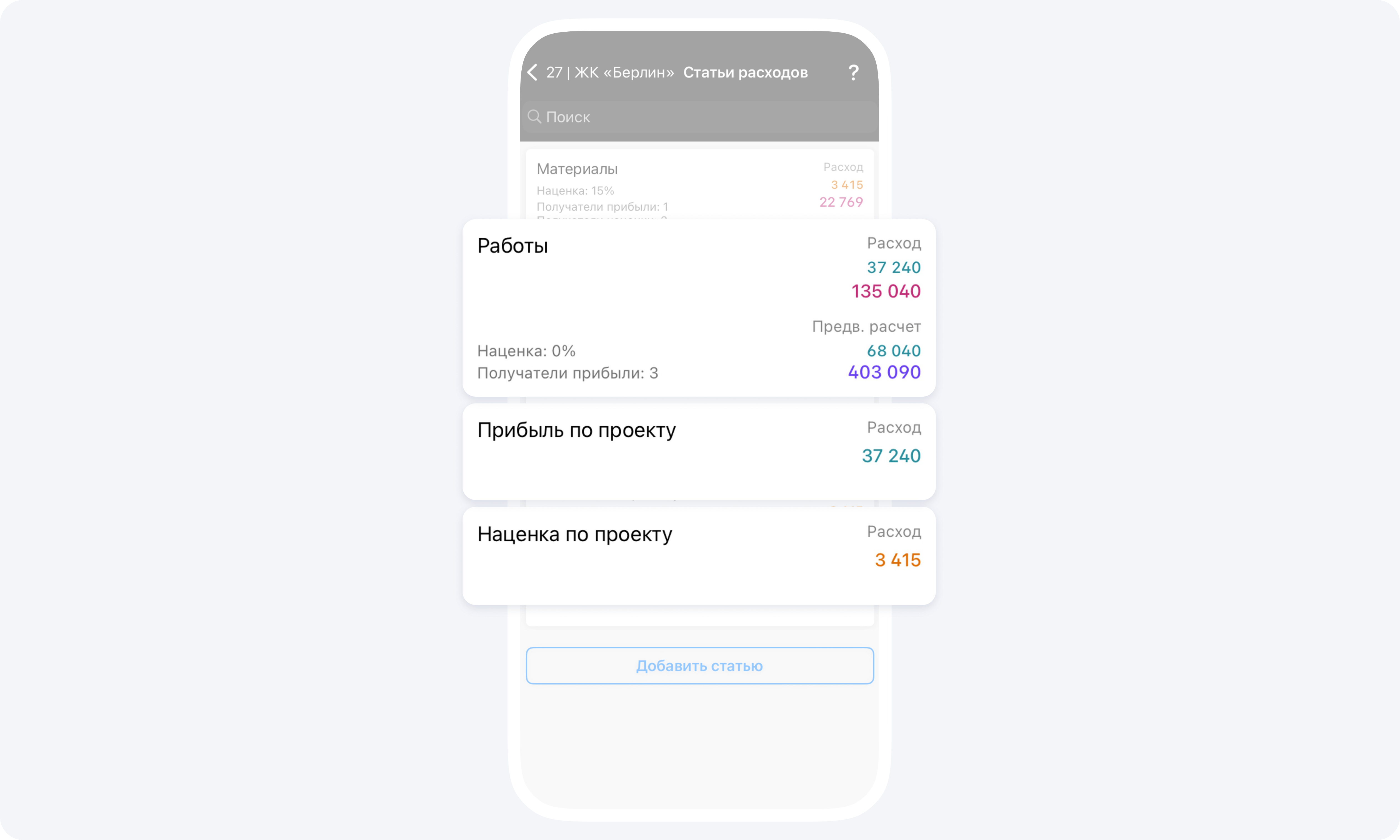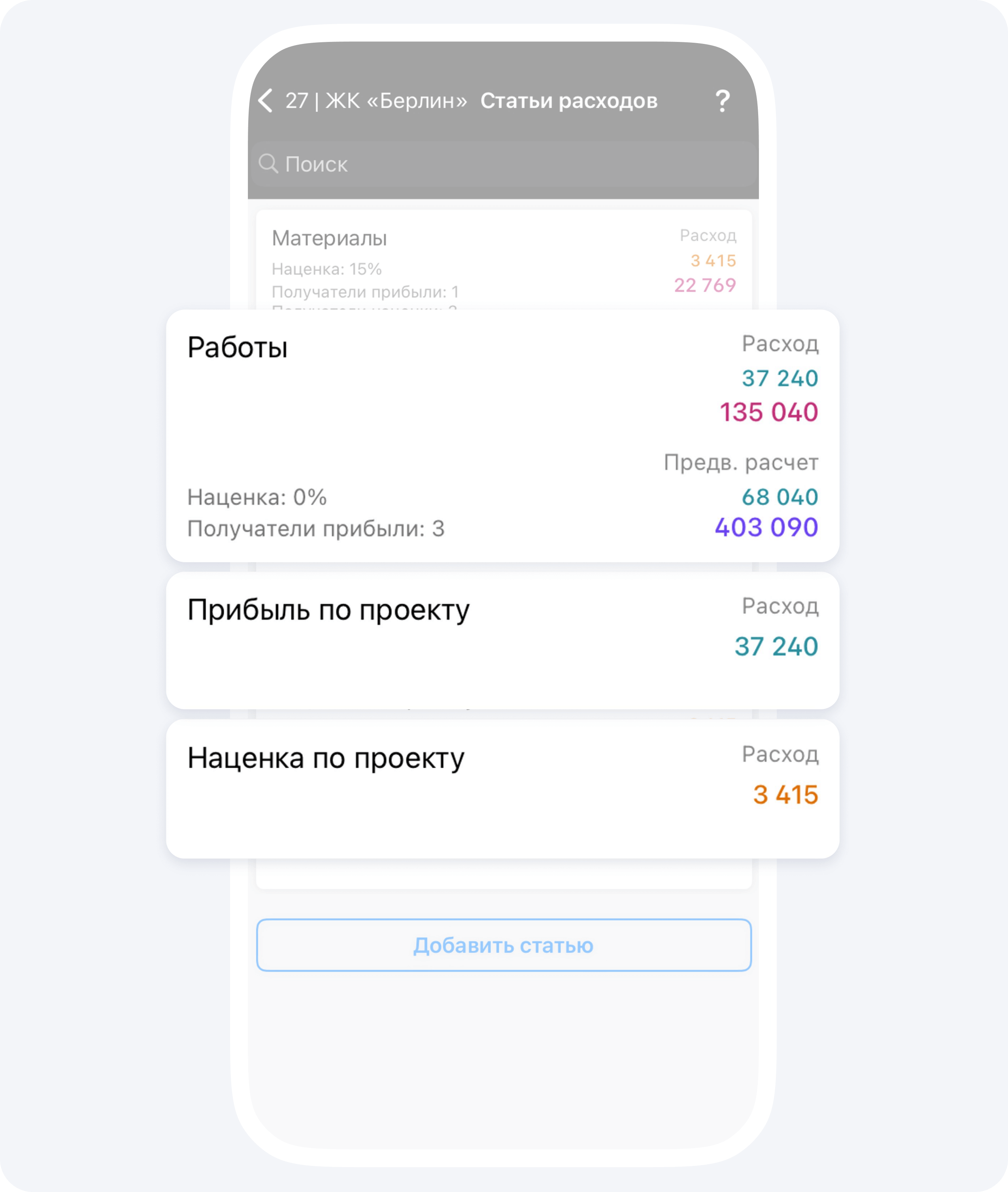 В карточке Статьи расхода отображается сумма всех событий Предварительный расчёт по данной статье. Последние две карточки в данном разделе на экране показывают общую наценку и общую прибыль по проекту.