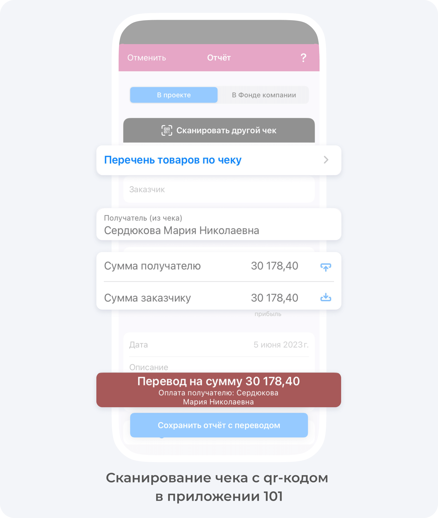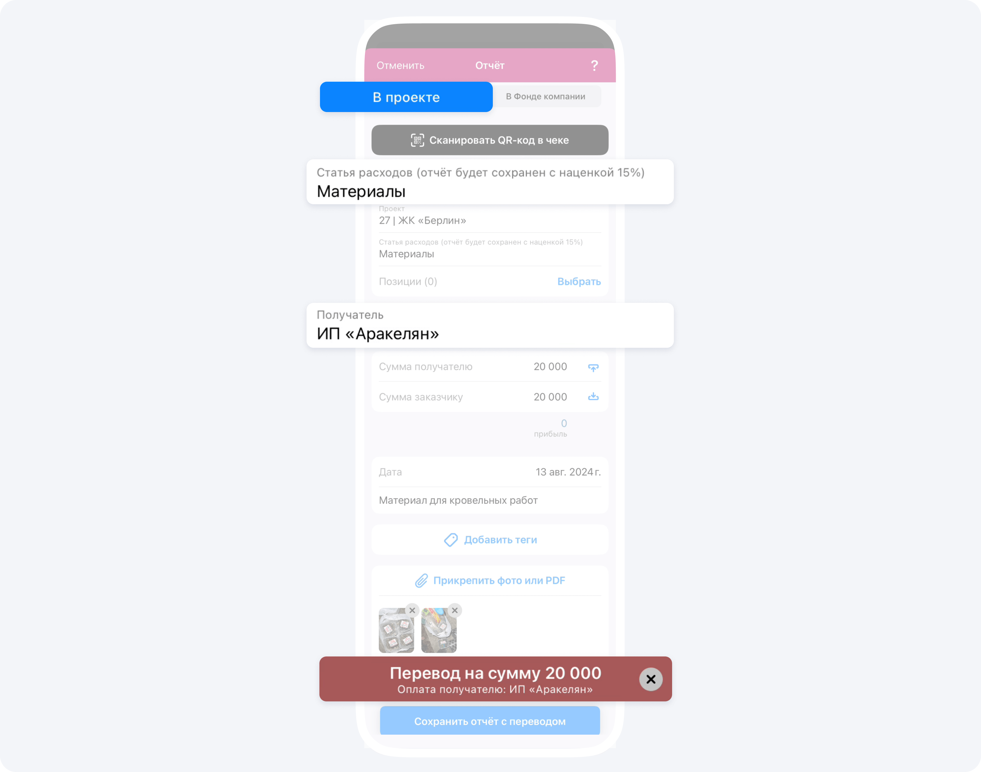 При сканировании чека с QR-кодом Перечень товаров по чеку, Получатель — поставщик, у которого вы закупили материал, суммы получателю и заказчику, а также событие Перевод (оплата контрагенту) добавляются в событие Отчёт автоматически. Все данные берутся из ФНС.