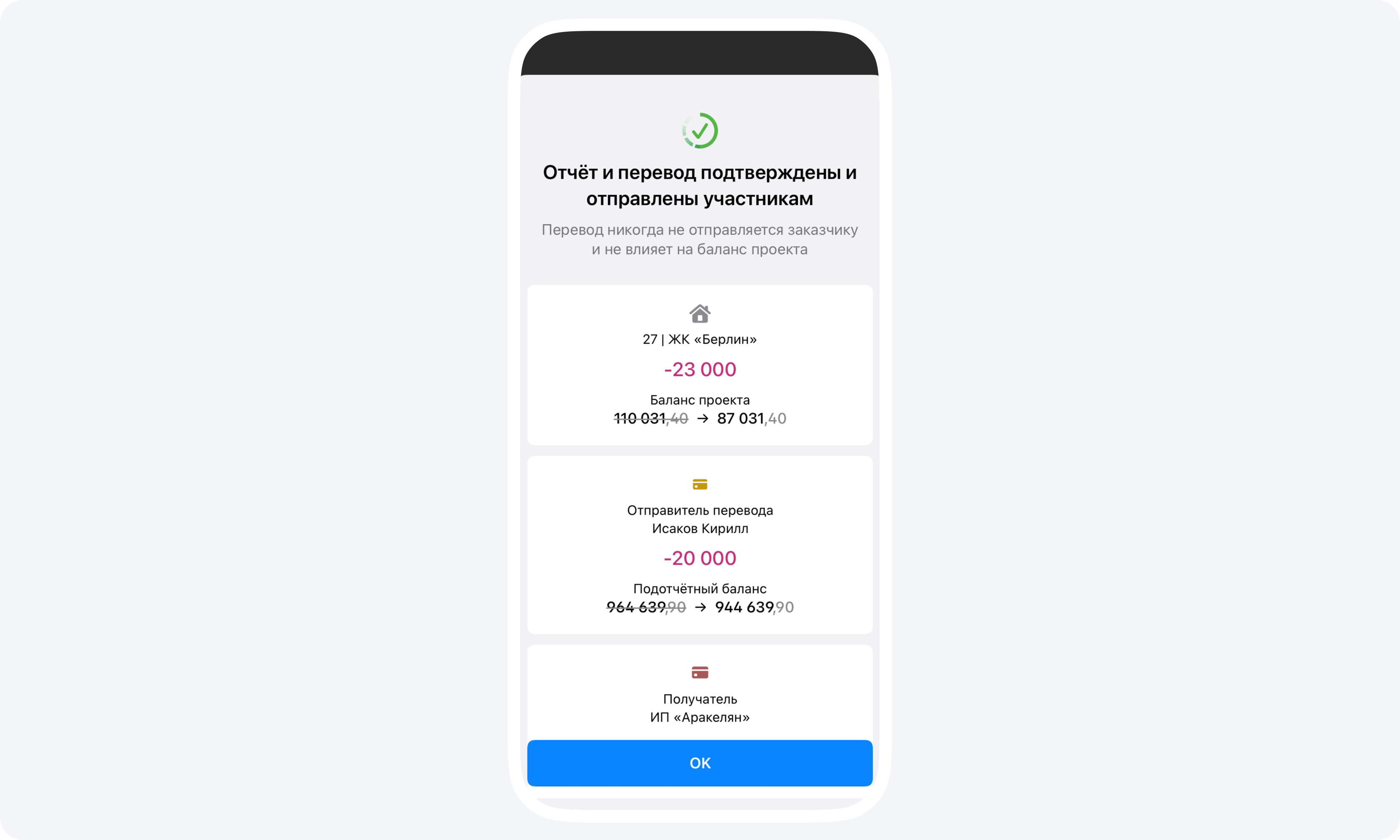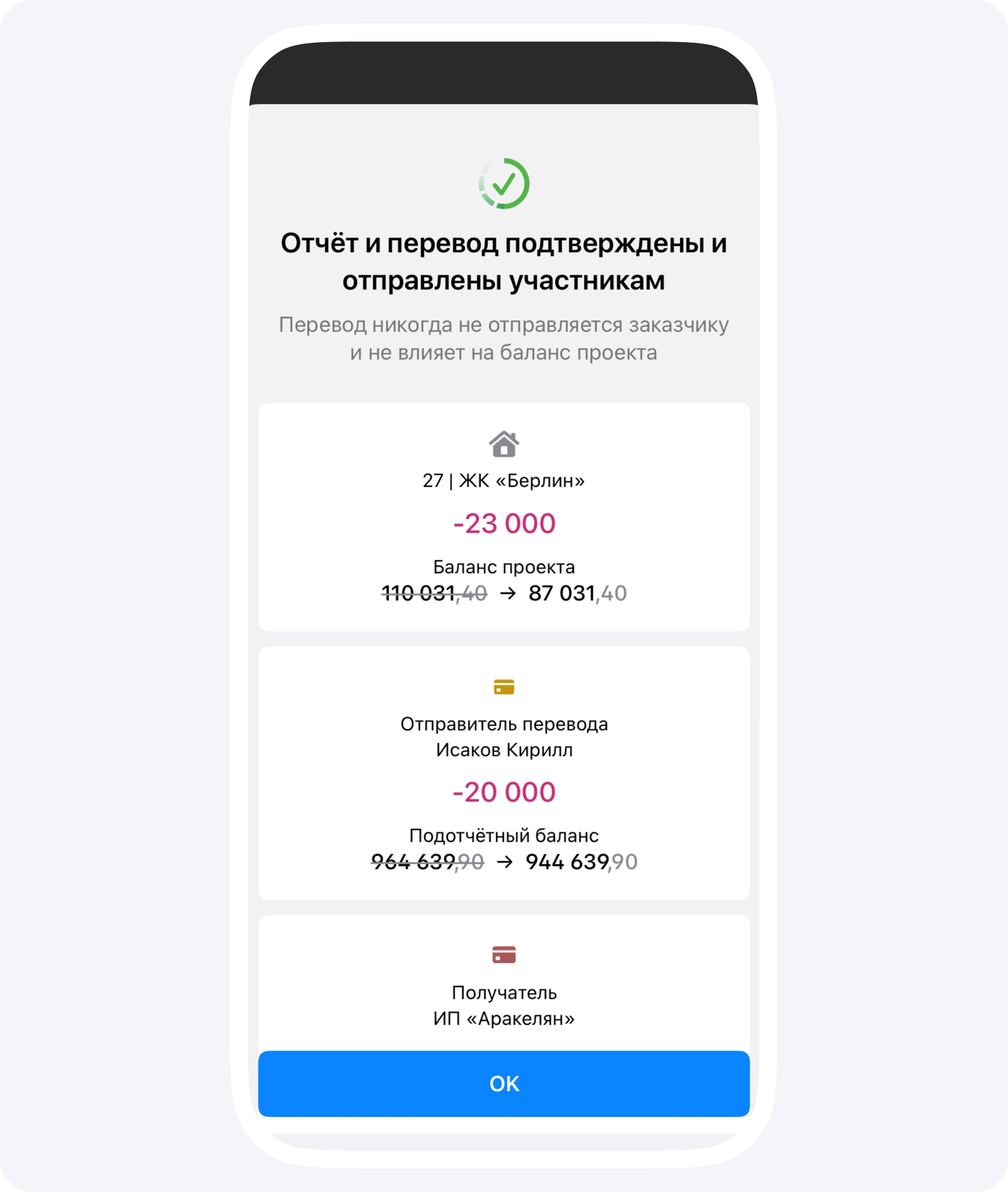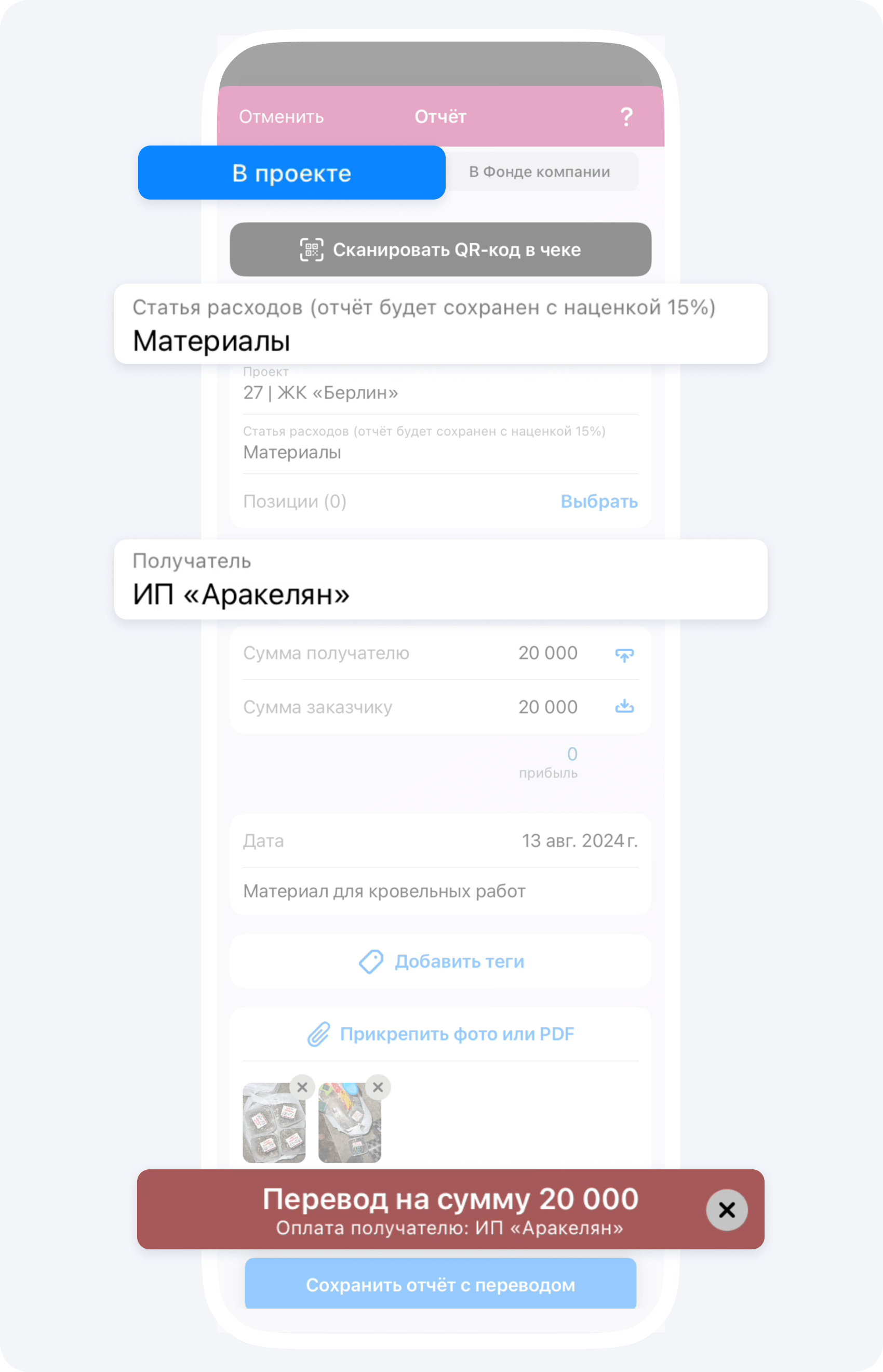 Если вы рассчитались с поставщиком за материал, нажмите Добавить оплату получателю — все данные в событие Перевод подтягиваются автоматически из события Отчёт.