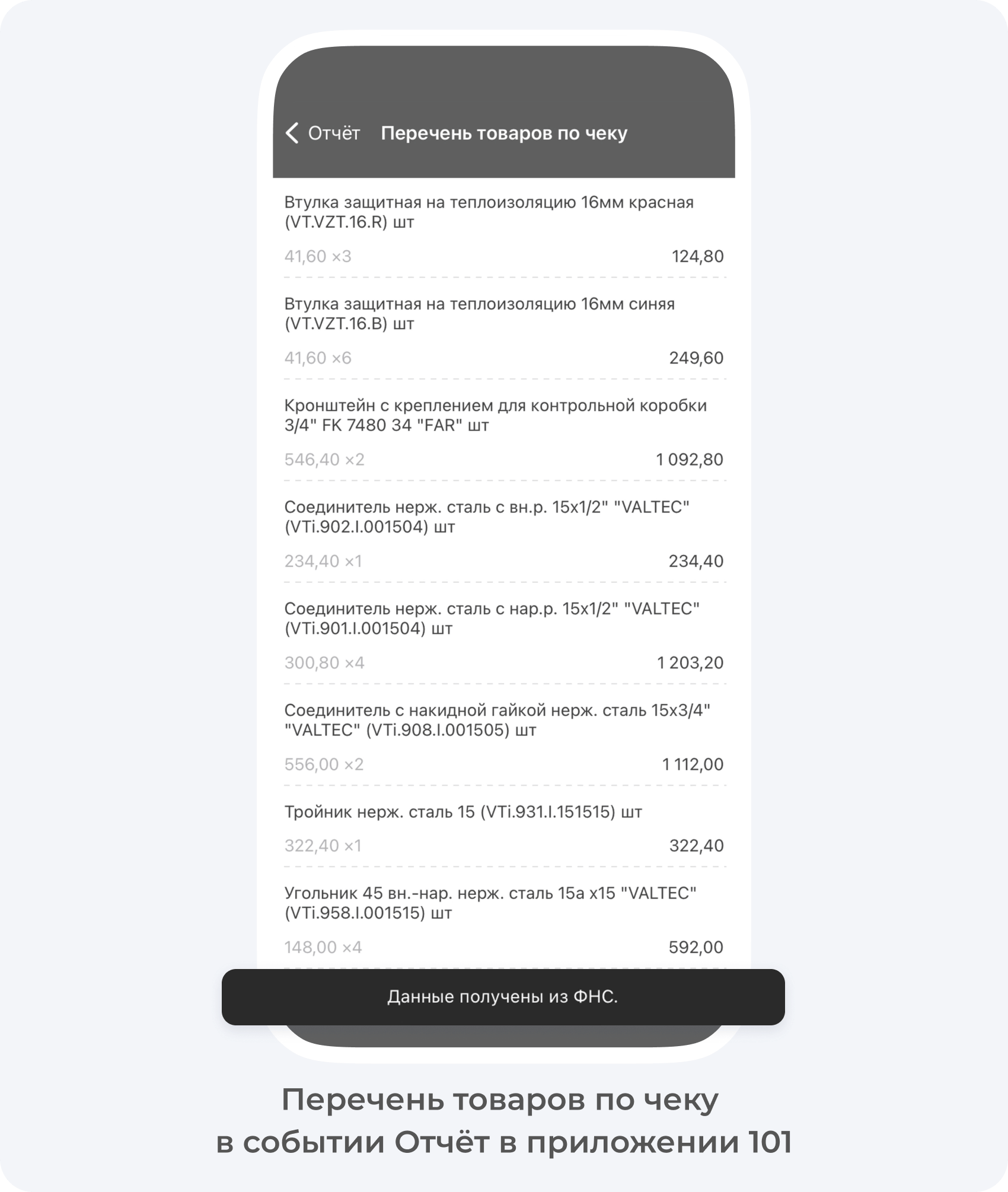 Подробнее о том, как внести перечень товаров в событие Отчёт, если у вас нет чека с QR-кодом, но вы хотите отразить подробный перечень материалов для заказчика.