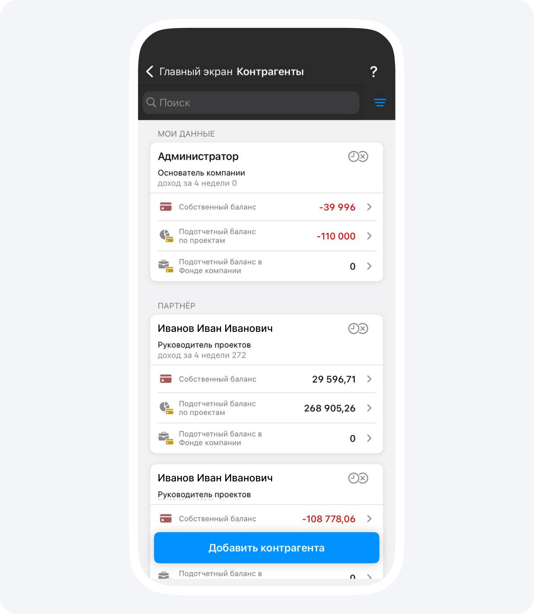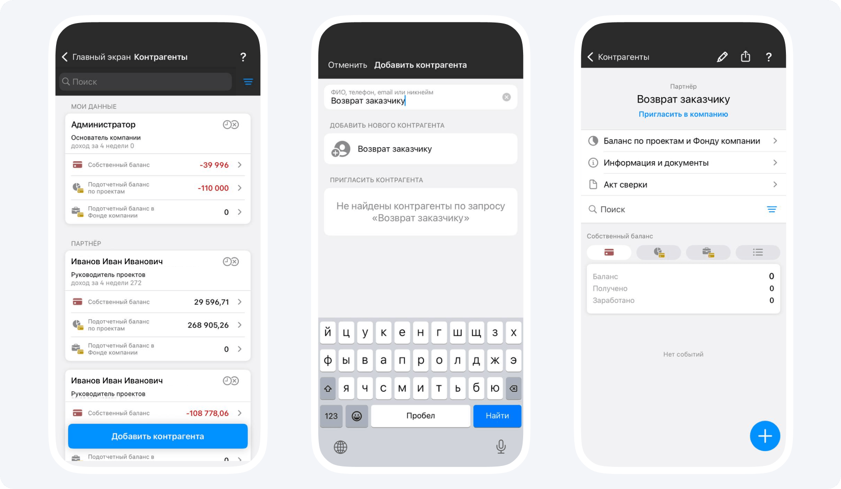 1. Создайте контрагента и назовите его «Возврат заказчику». Его вы сможете использовать для внутренней бухгалтерии на разных проектах.