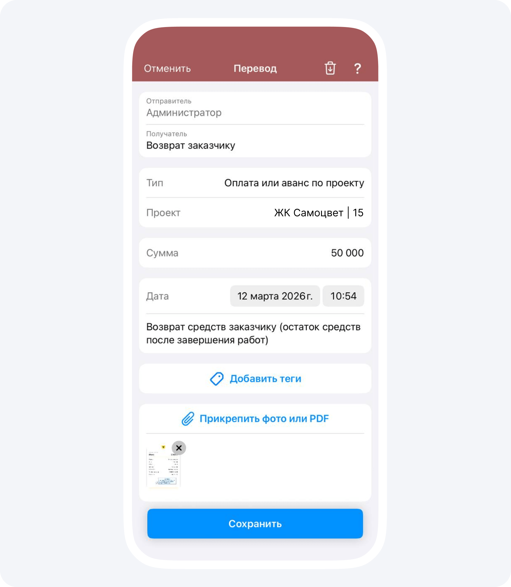 Не забудьте прикрепить к этому отчету чек о переводе средств или платежное поручение. Затем подтвердите событие, чтобы балансы изменились.