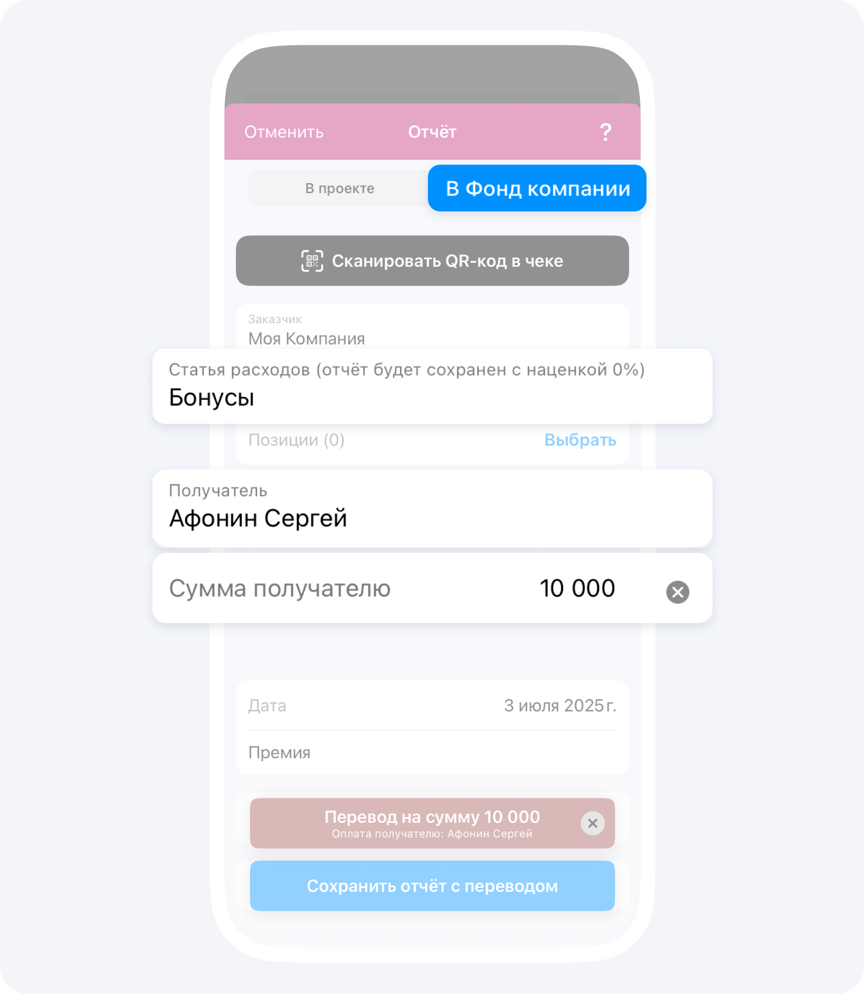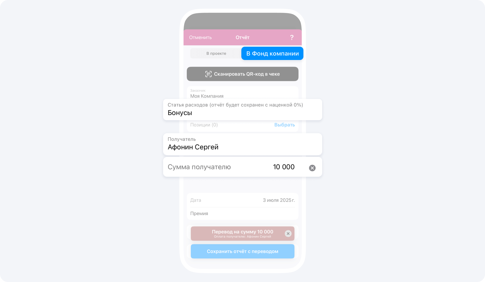 - Добавьте оплату получателю и сохраните отчёт с переводом.