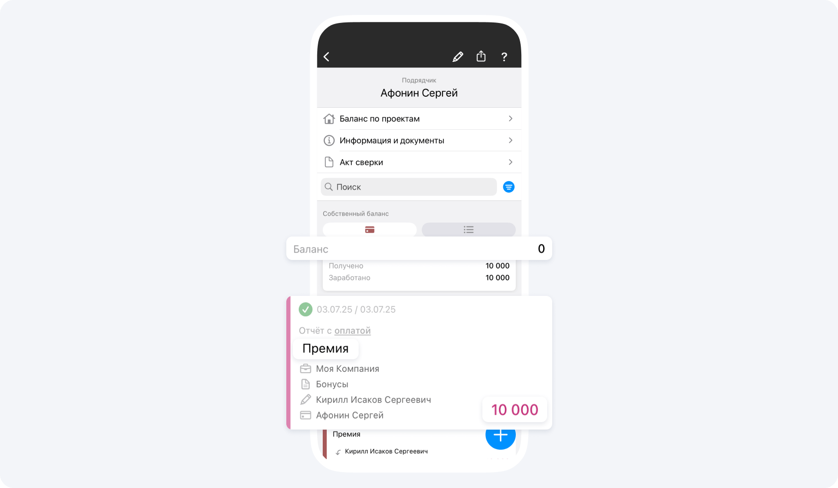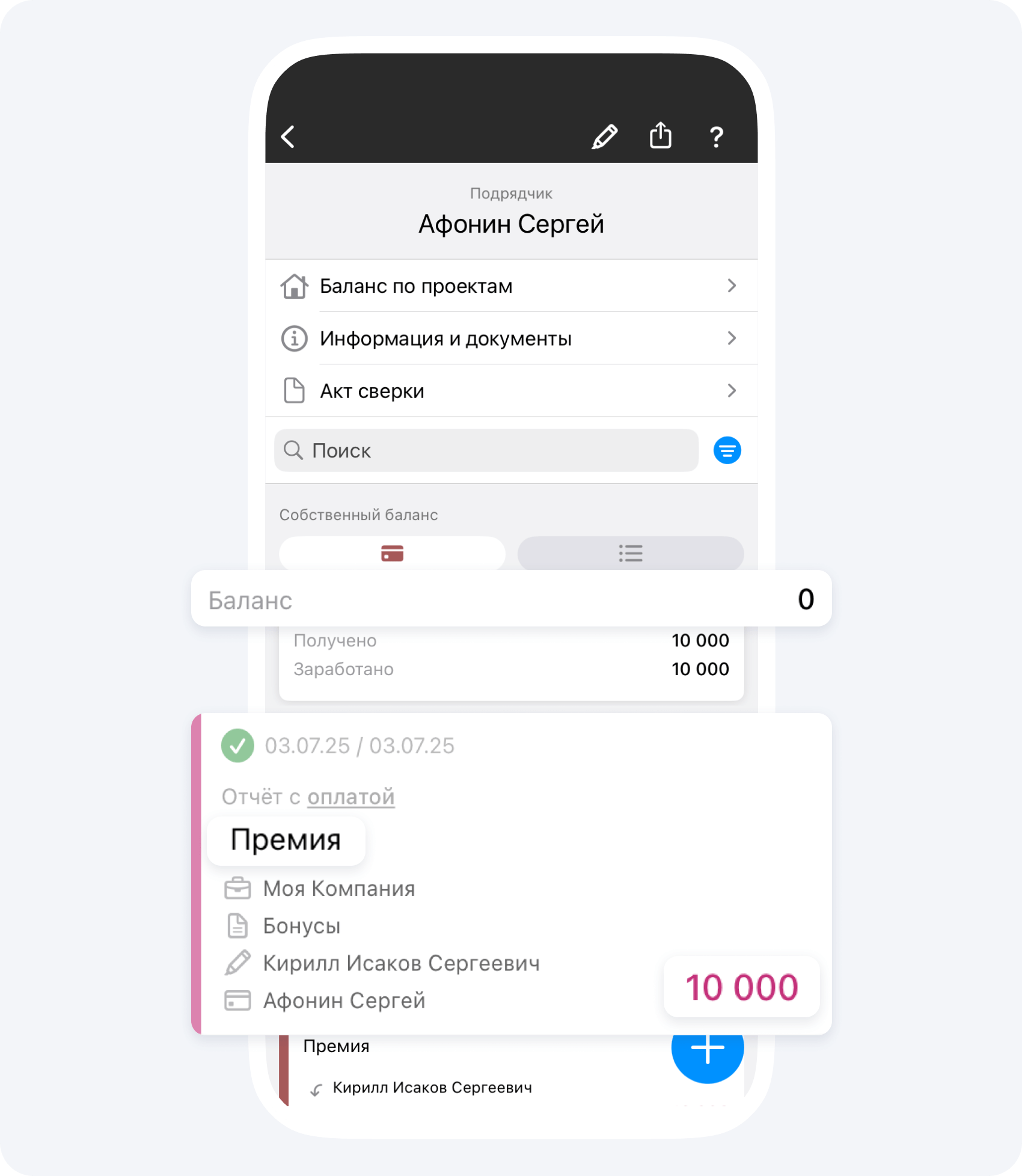 После подтверждения событий Отчёт и Перевод контрагент будет в расчёте, а указанная сумма будет списана с вашего подотчётного баланса в Фонде компании событием «Перевод».