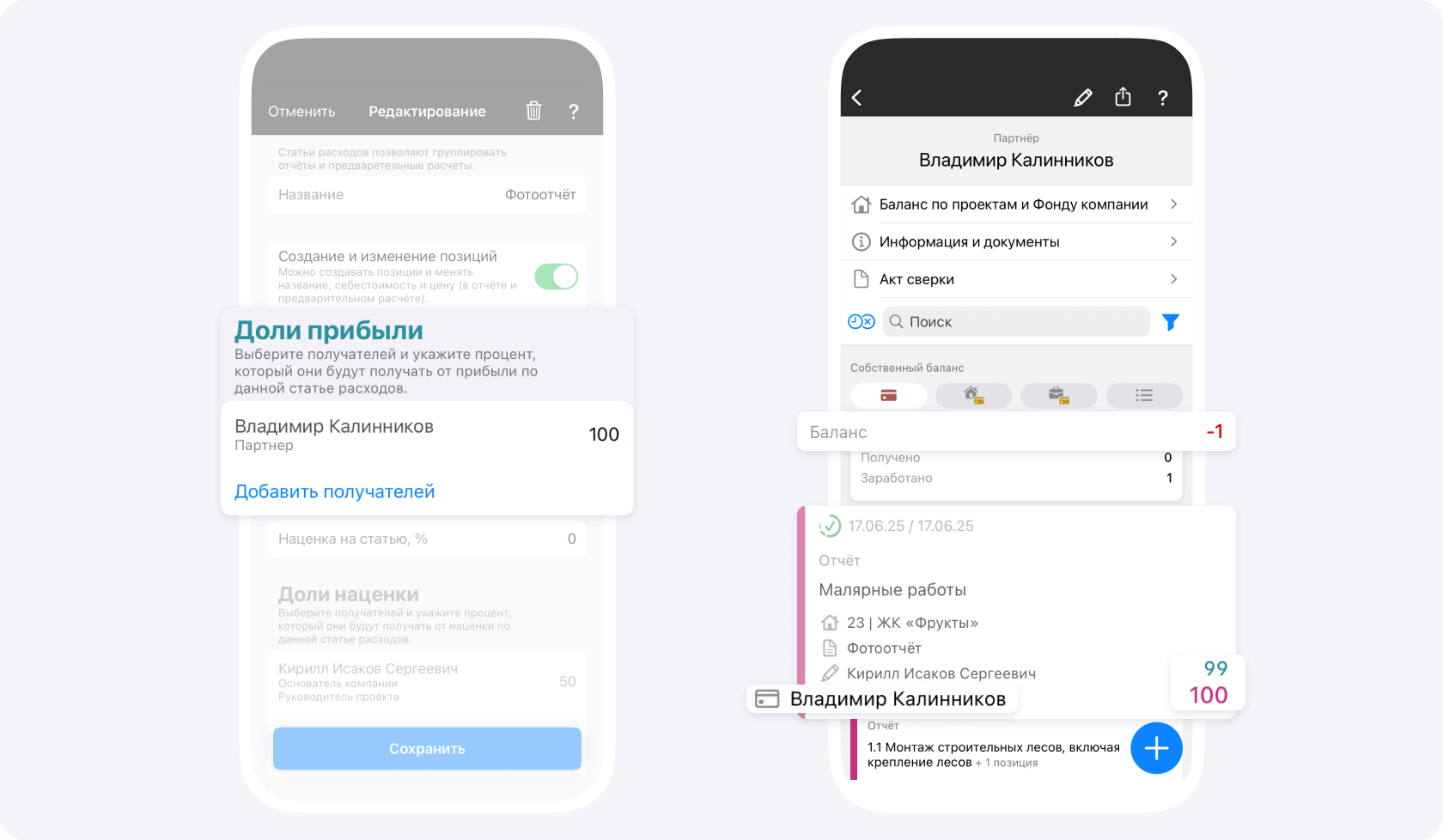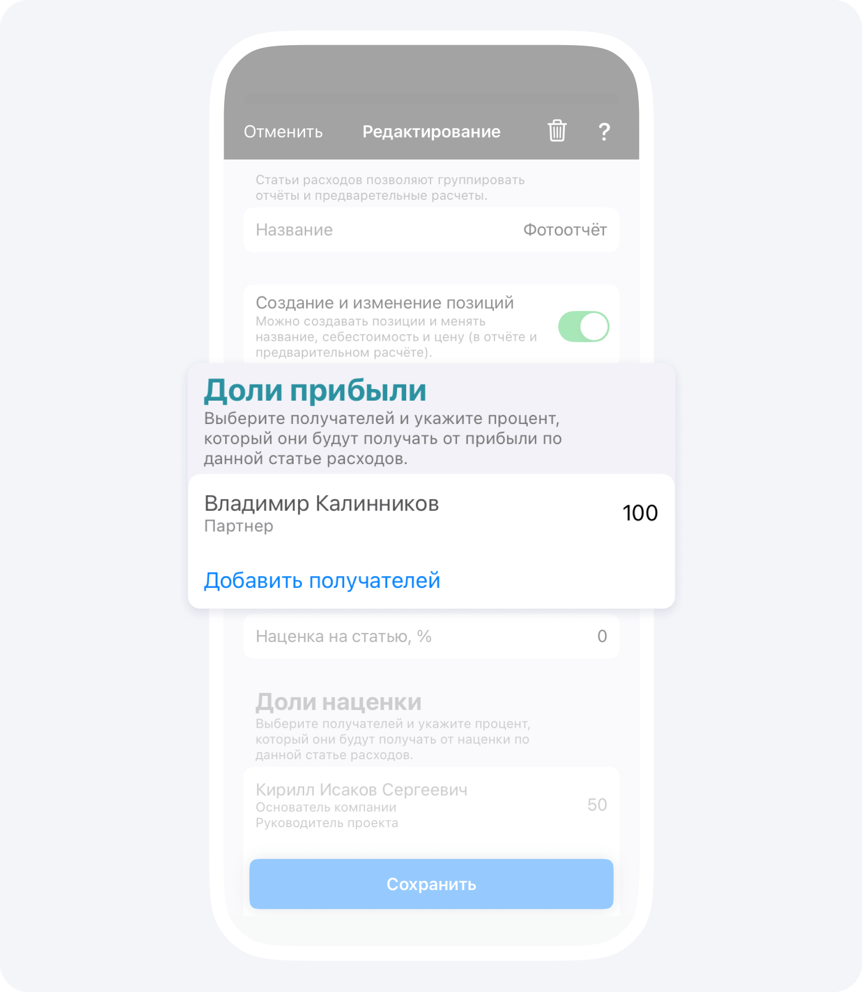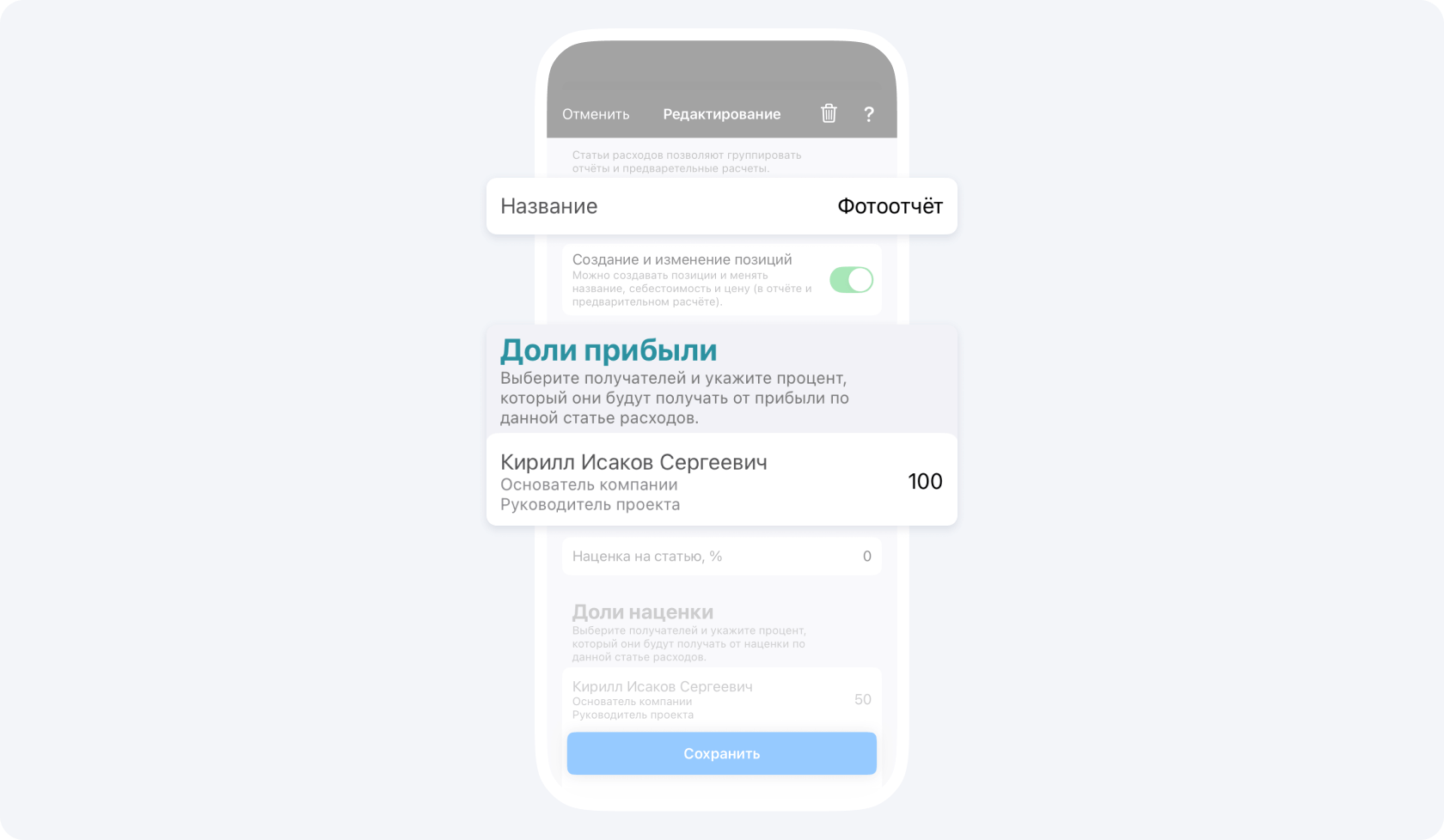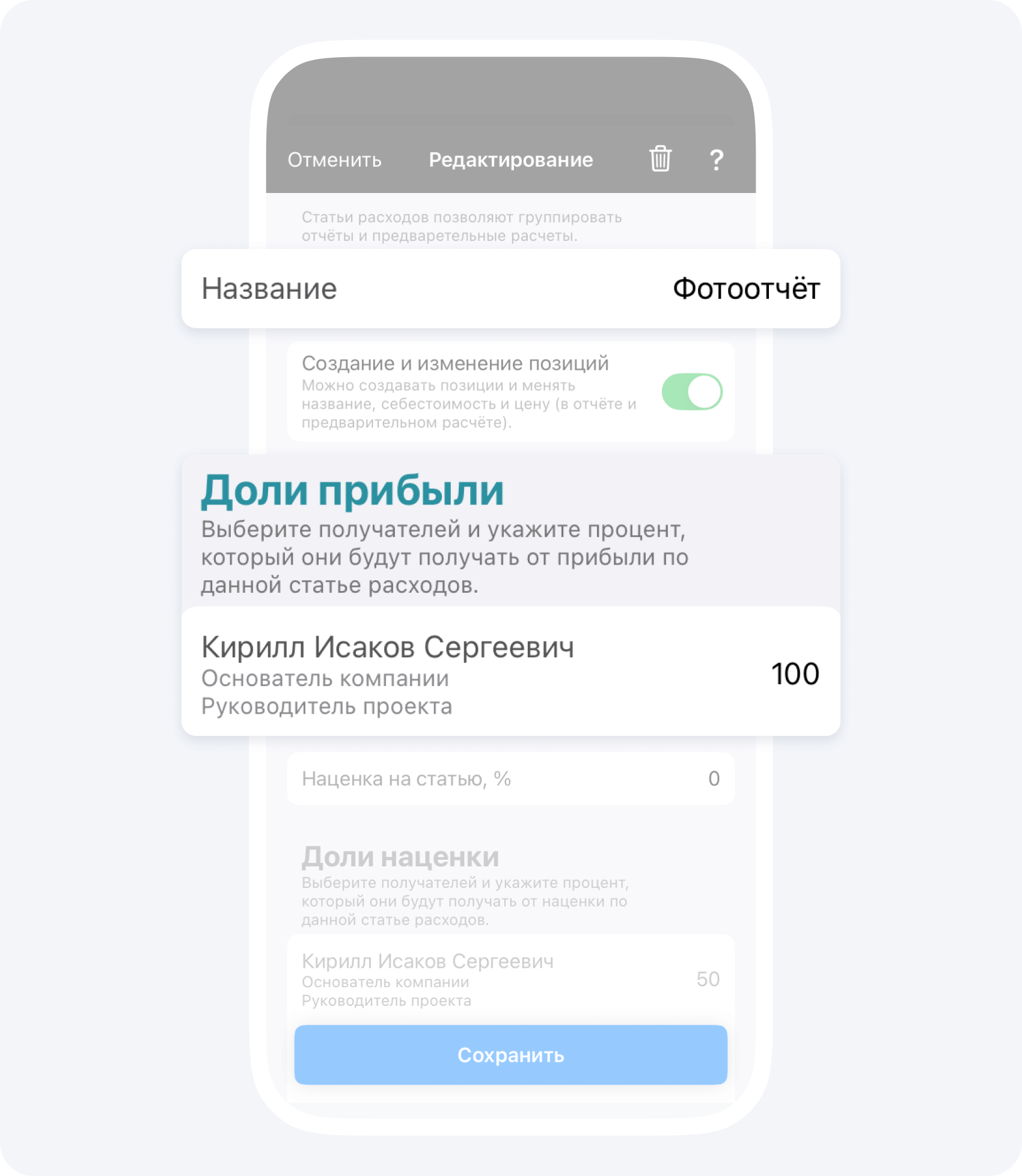 Если вы не хотите выделять прорабу мотивацию за ведение ежедневных фотоотчётов по проекту, в статье расхода «Фотоотчёт» в распределение долей прибыли добавьте прораба либо другого контрагента, отвечающего за предоставление фотоотчёта — 100% получателем прибыли и его же укажите получателем в событии Отчёт.