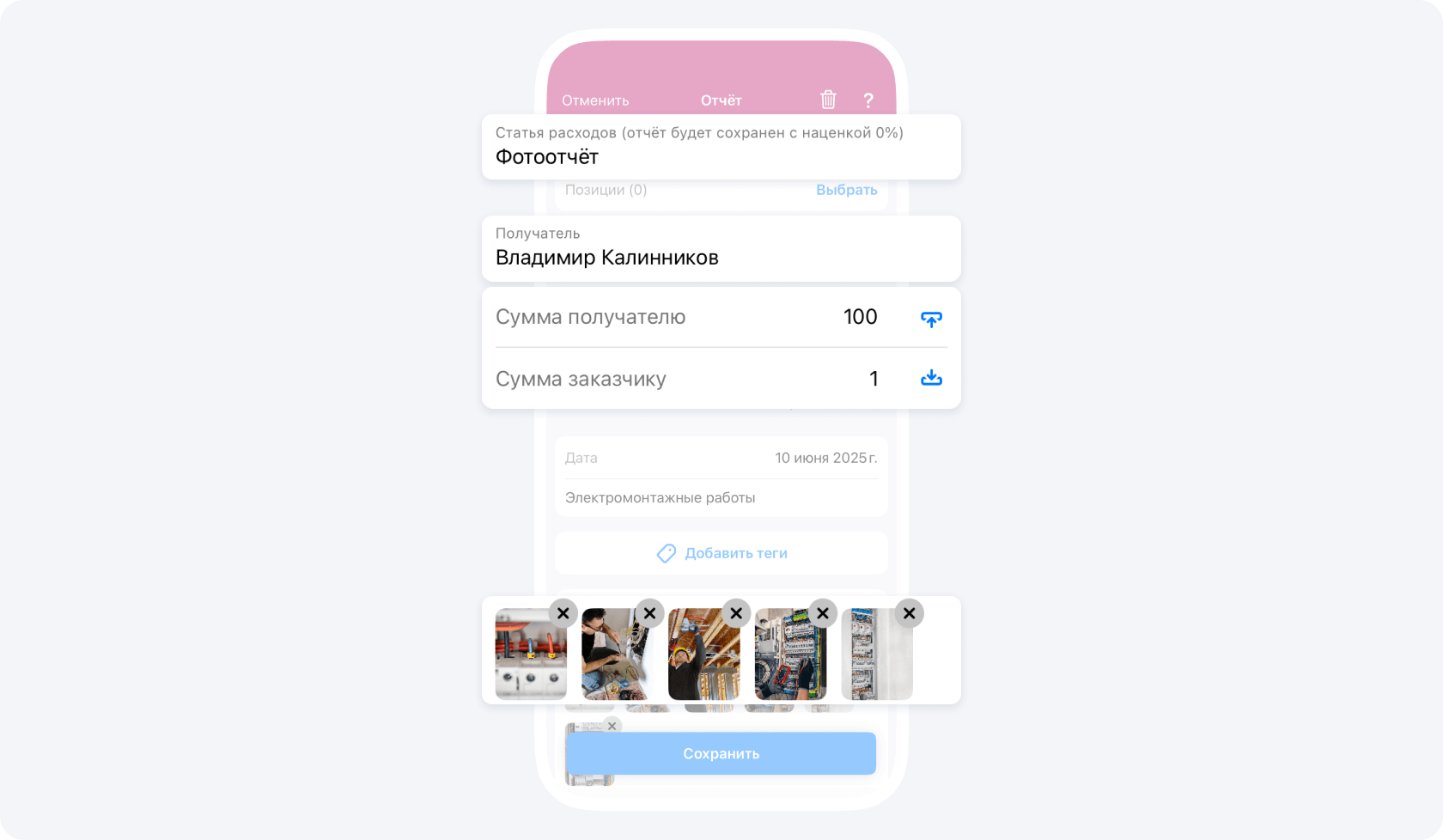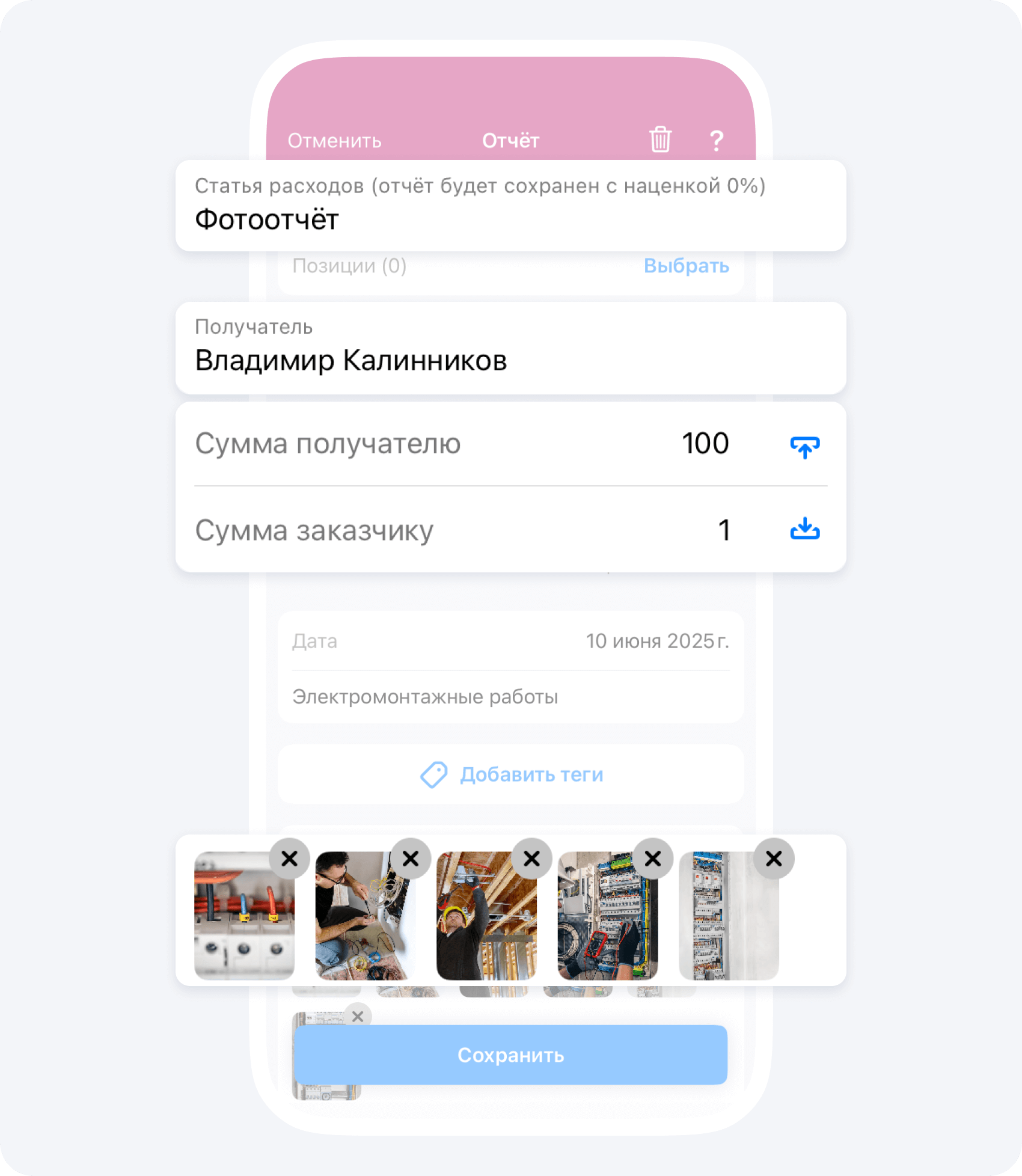 - Получатель — Прораб либо другой контрагент, отвечающий за предоставление фотоотчёта.