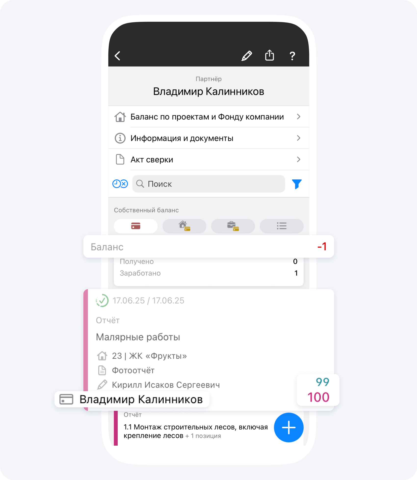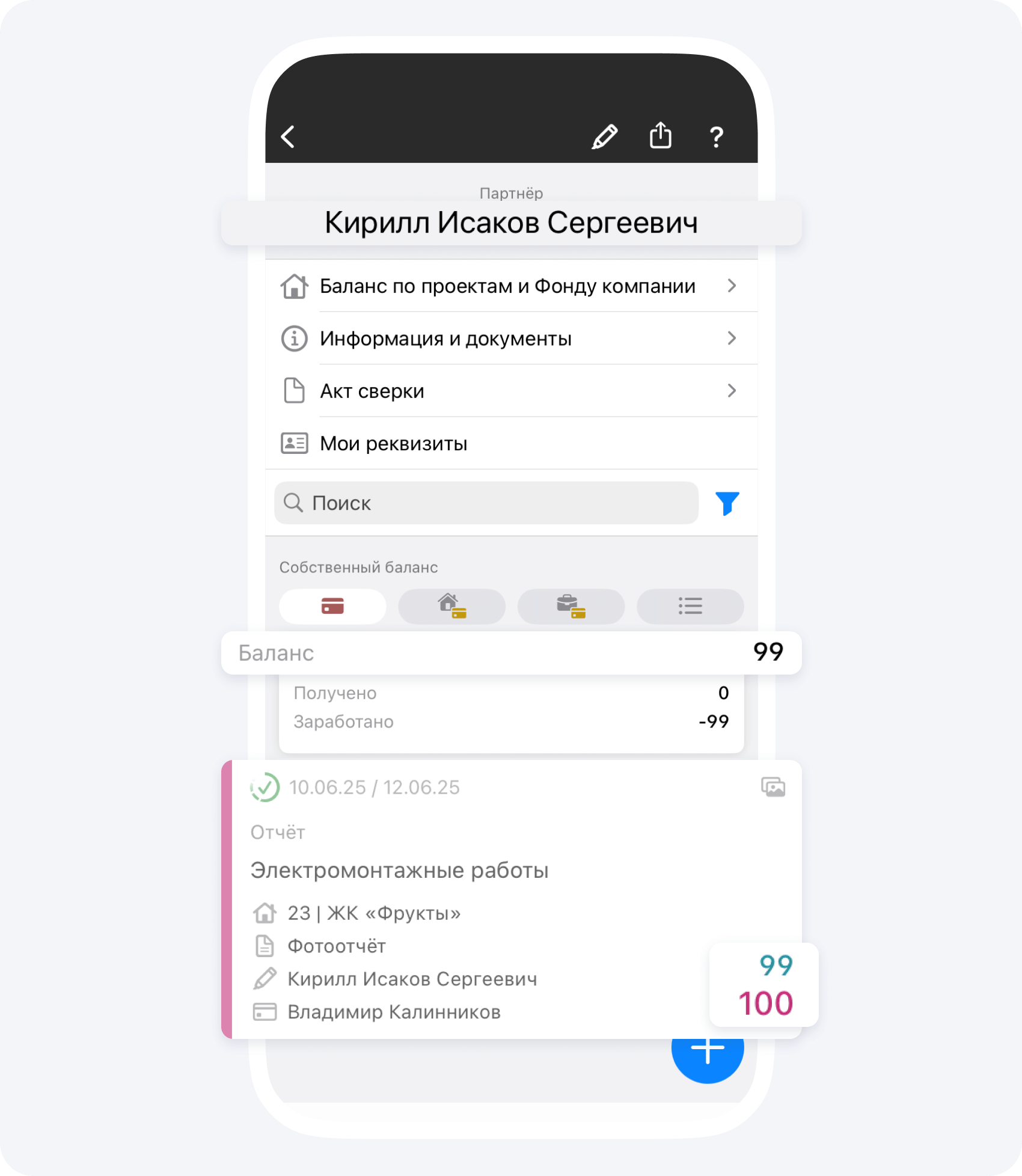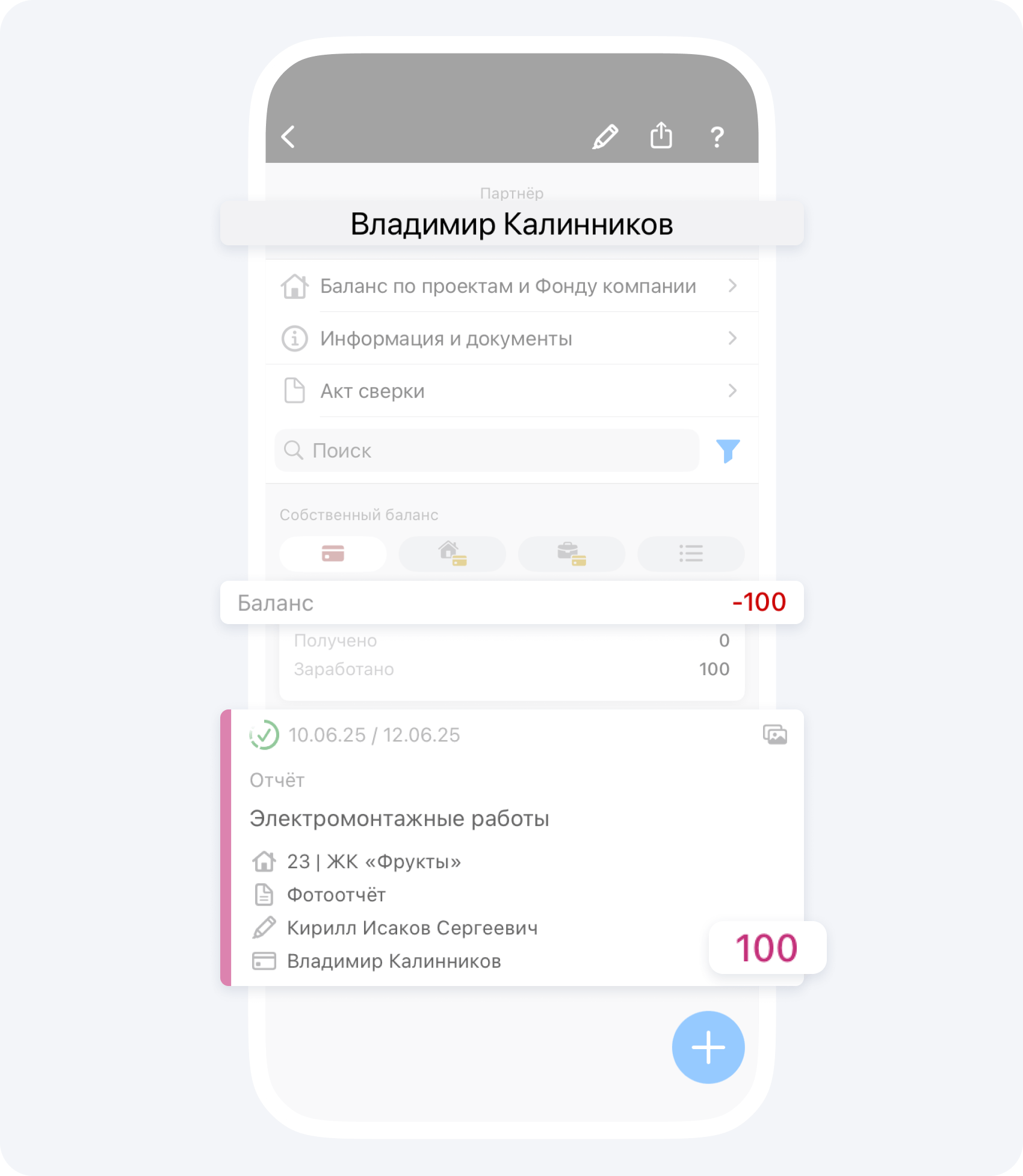 - Прораб получает мотивацию — прибыль 100₽ с каждого Отчёта;