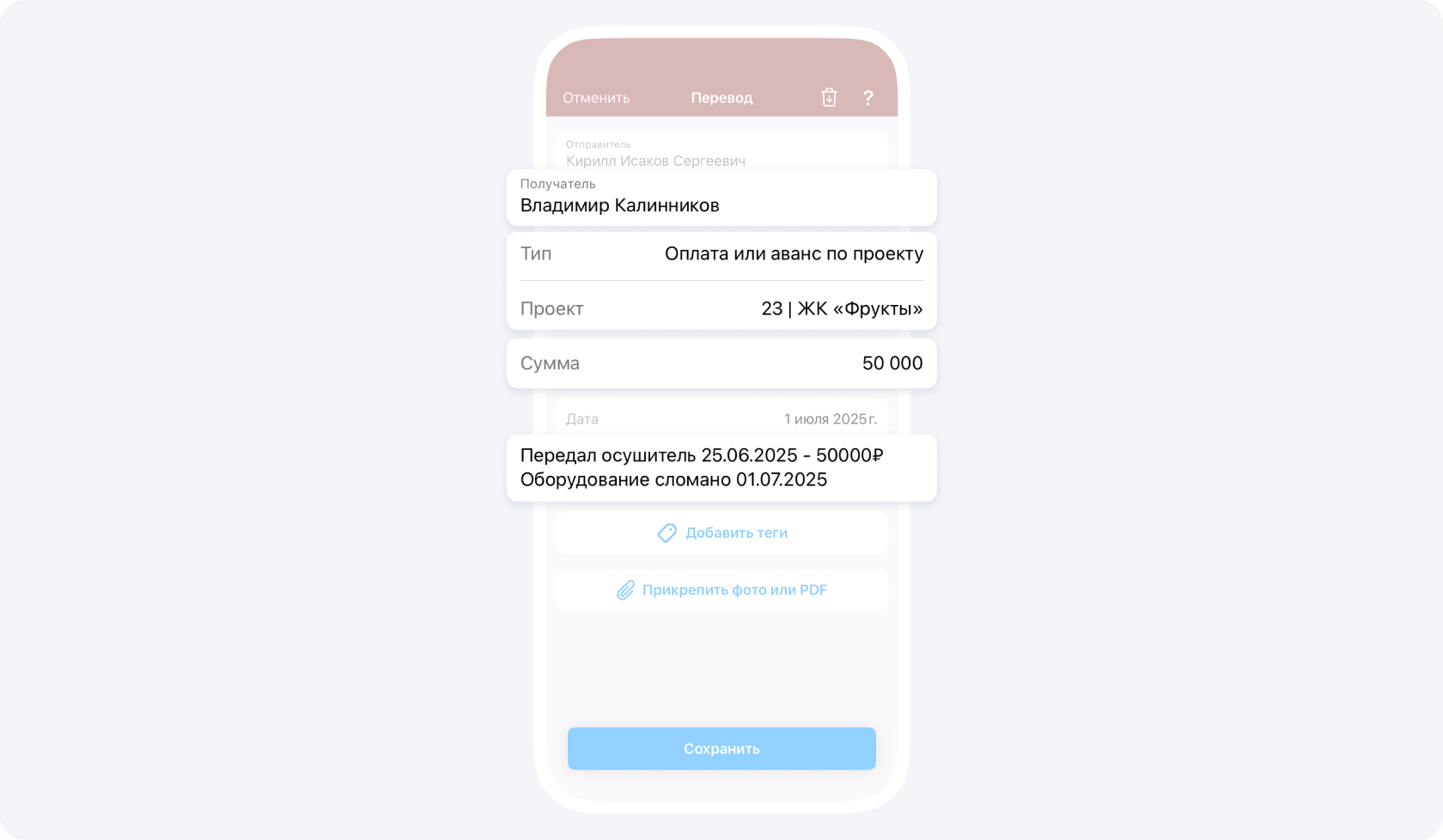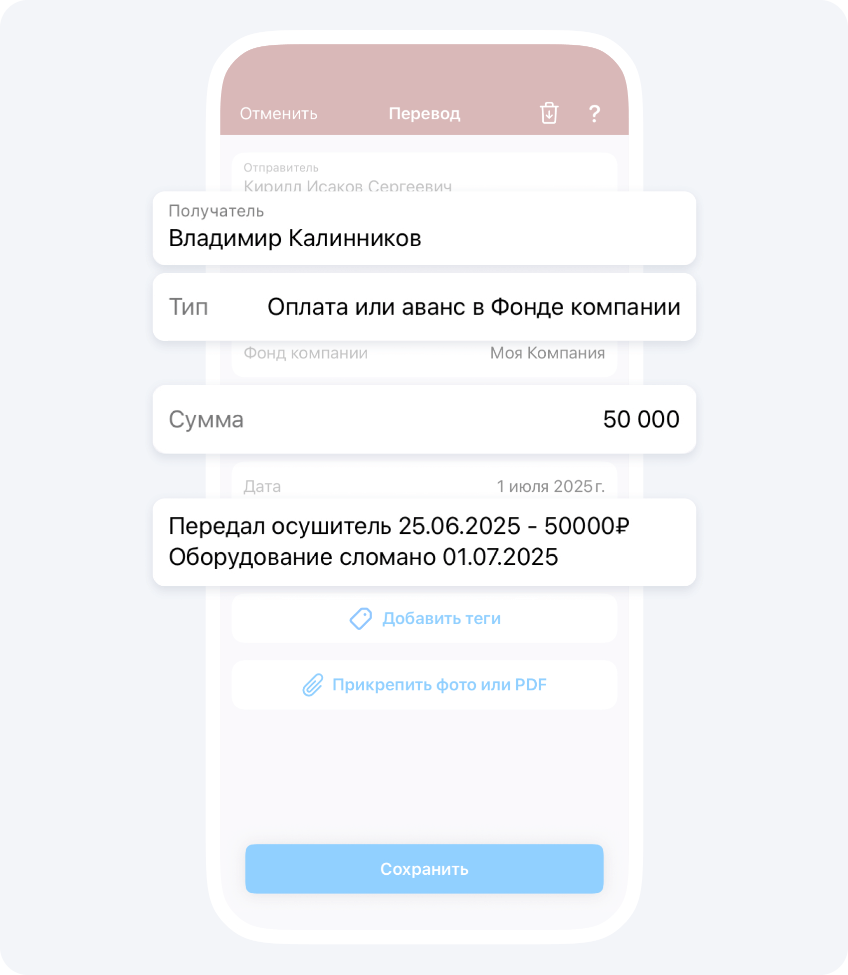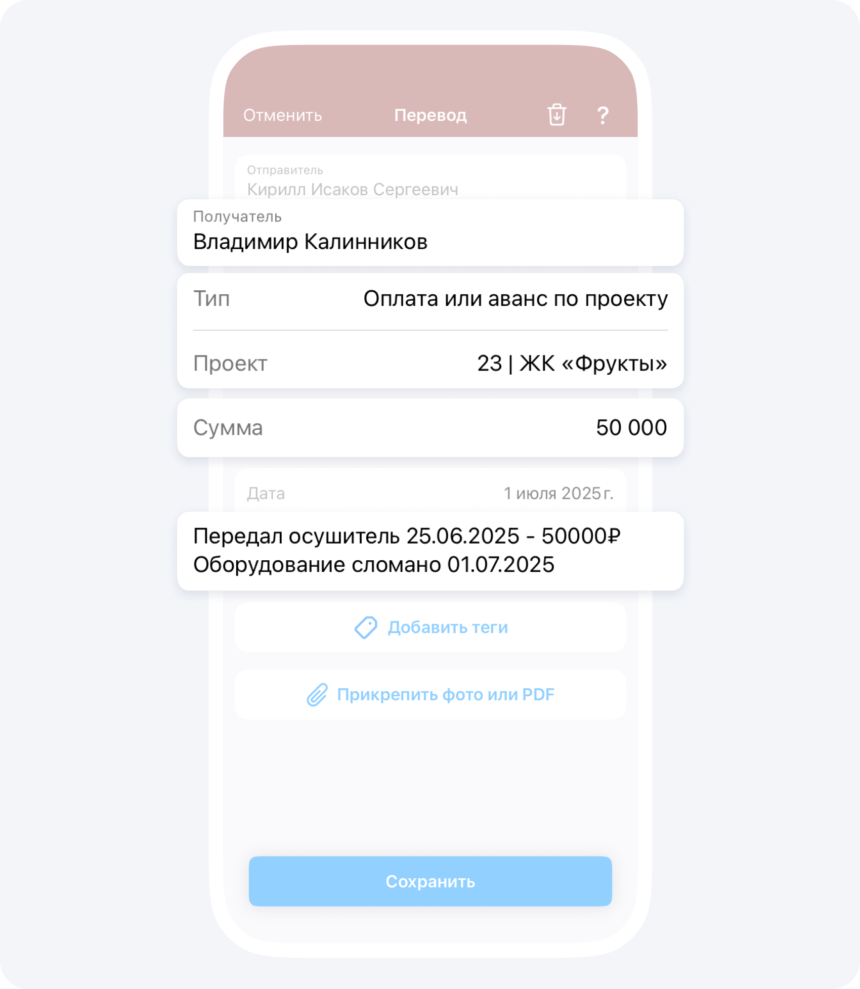 Обязательно ведите историю перемещений в описании события Перевод, например, Иванов 10.04 → Петрову 01.06 → Сергееву 10.06 = 50 000₽.