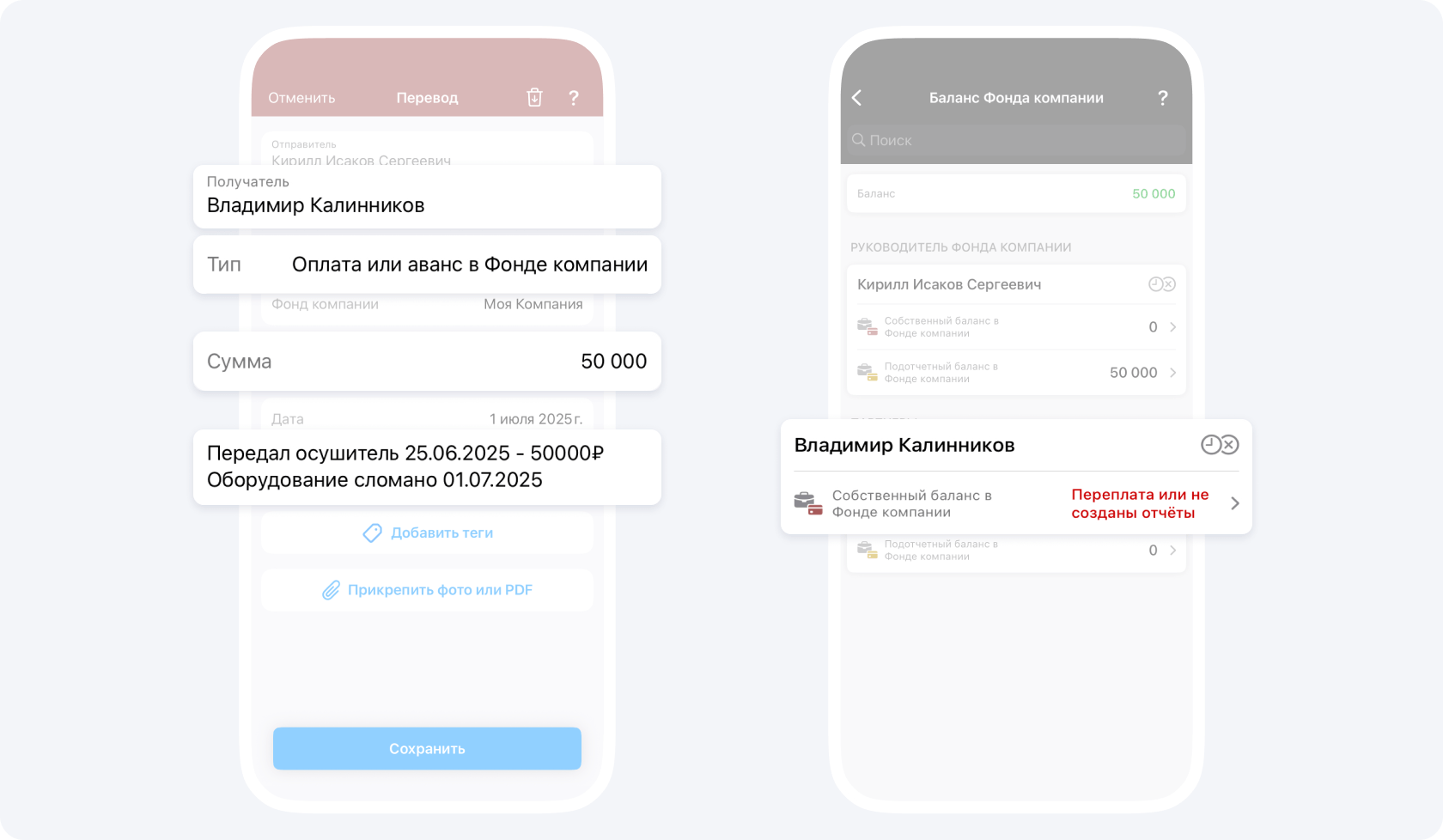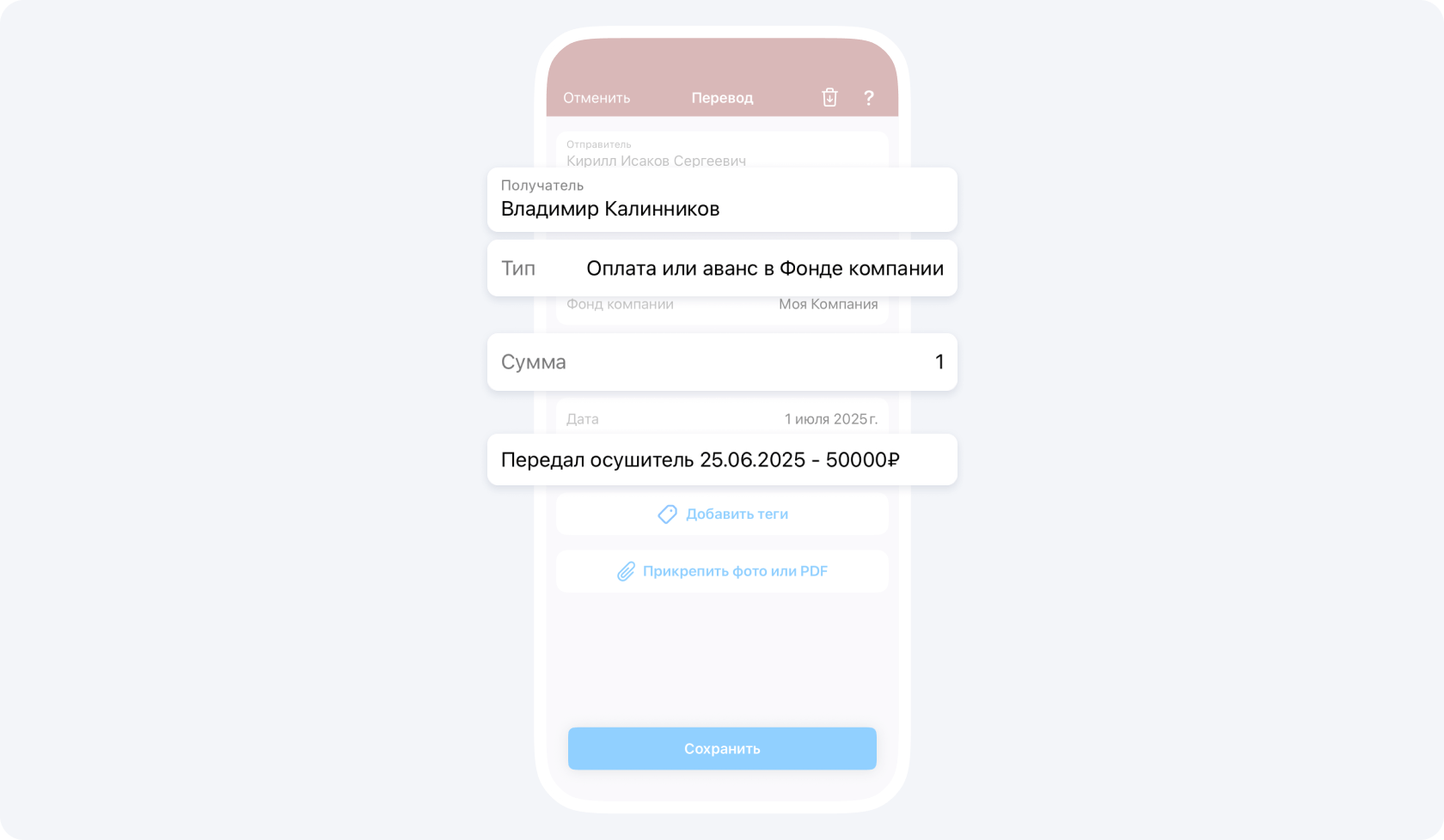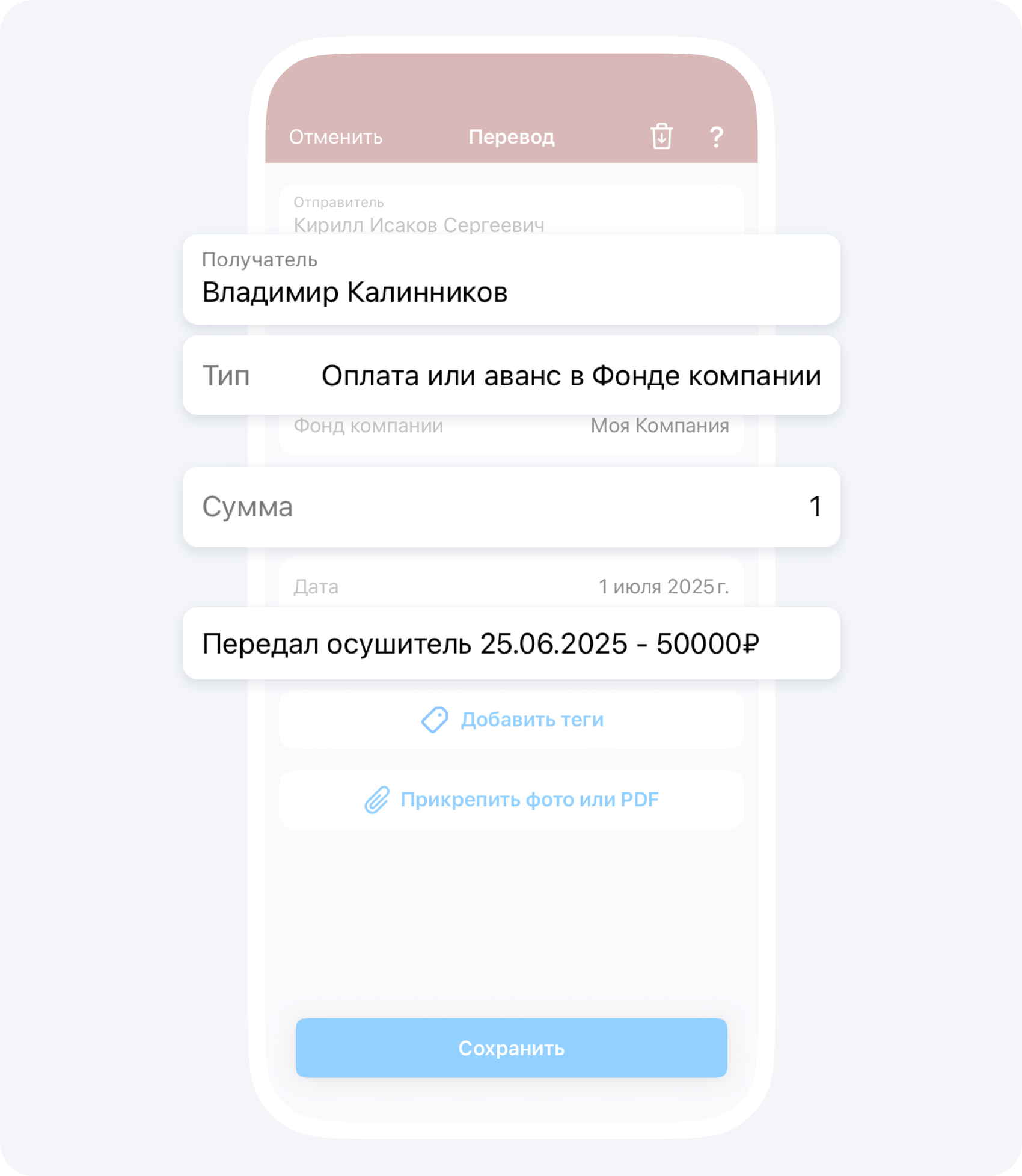 Обязательно ведите историю перемещений в описании события Перевод, например, Иванов 10.04 → Петрову 01.06 → Сергееву 10.06 = 50 000₽.