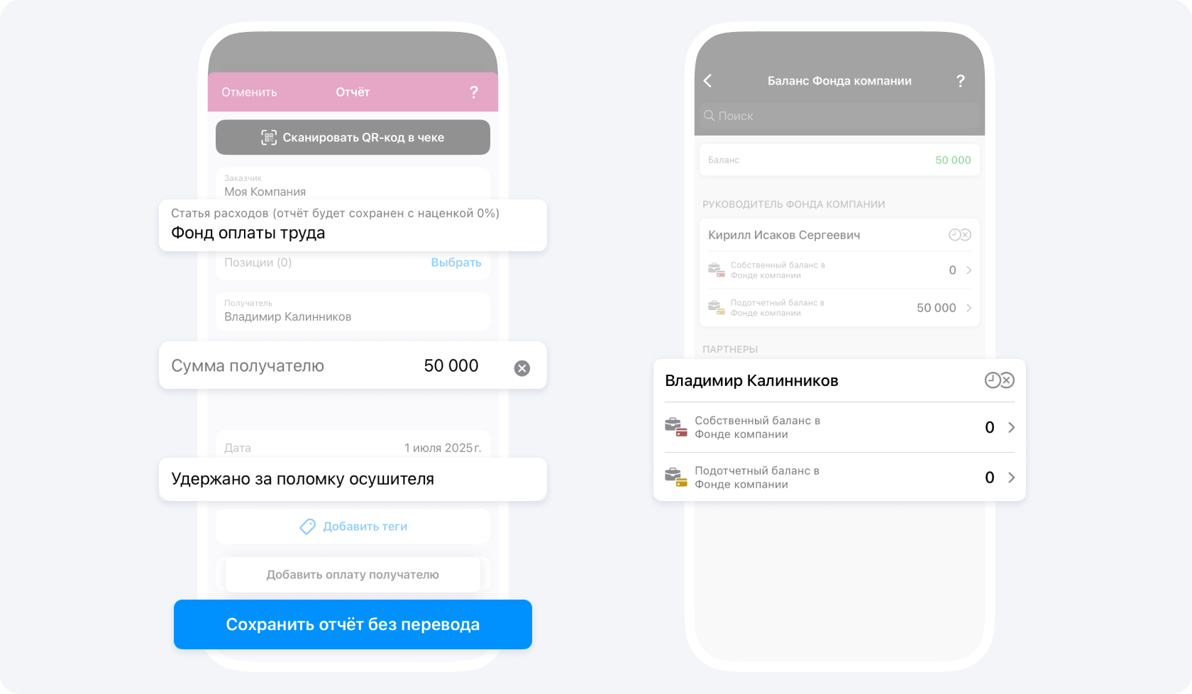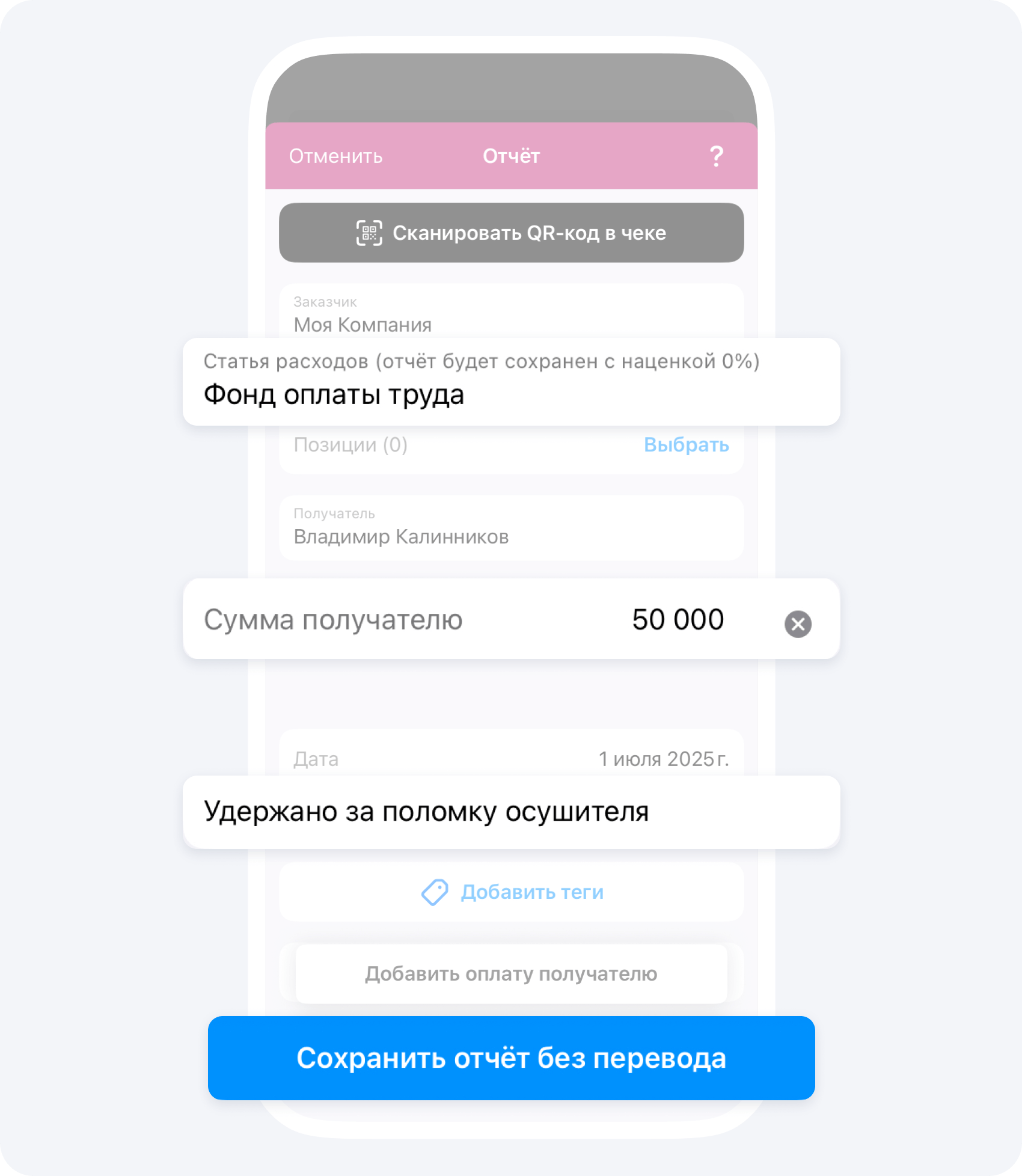 Внутри Фонда компании, если человек получает оклад, создайте событие Отчёт: