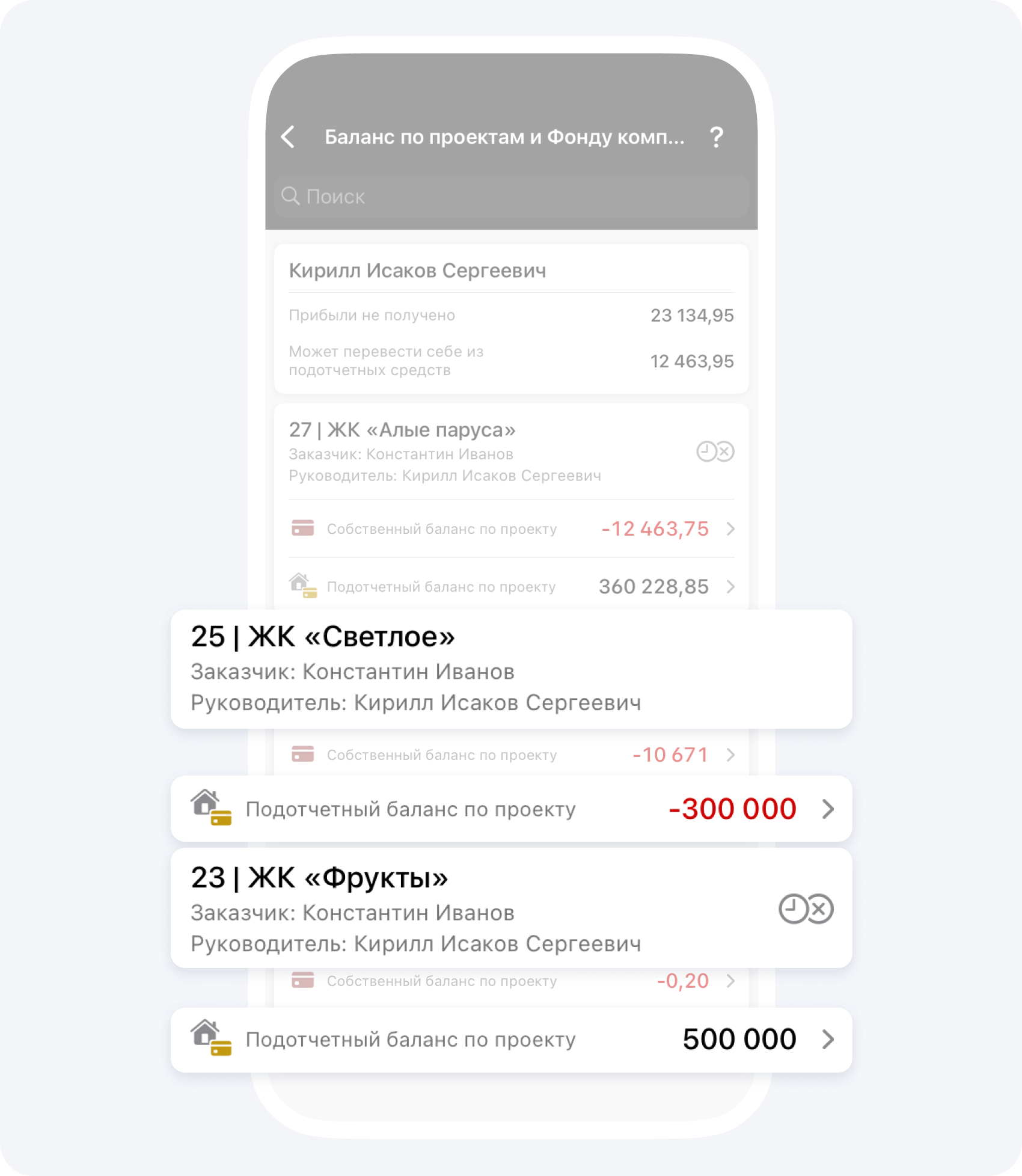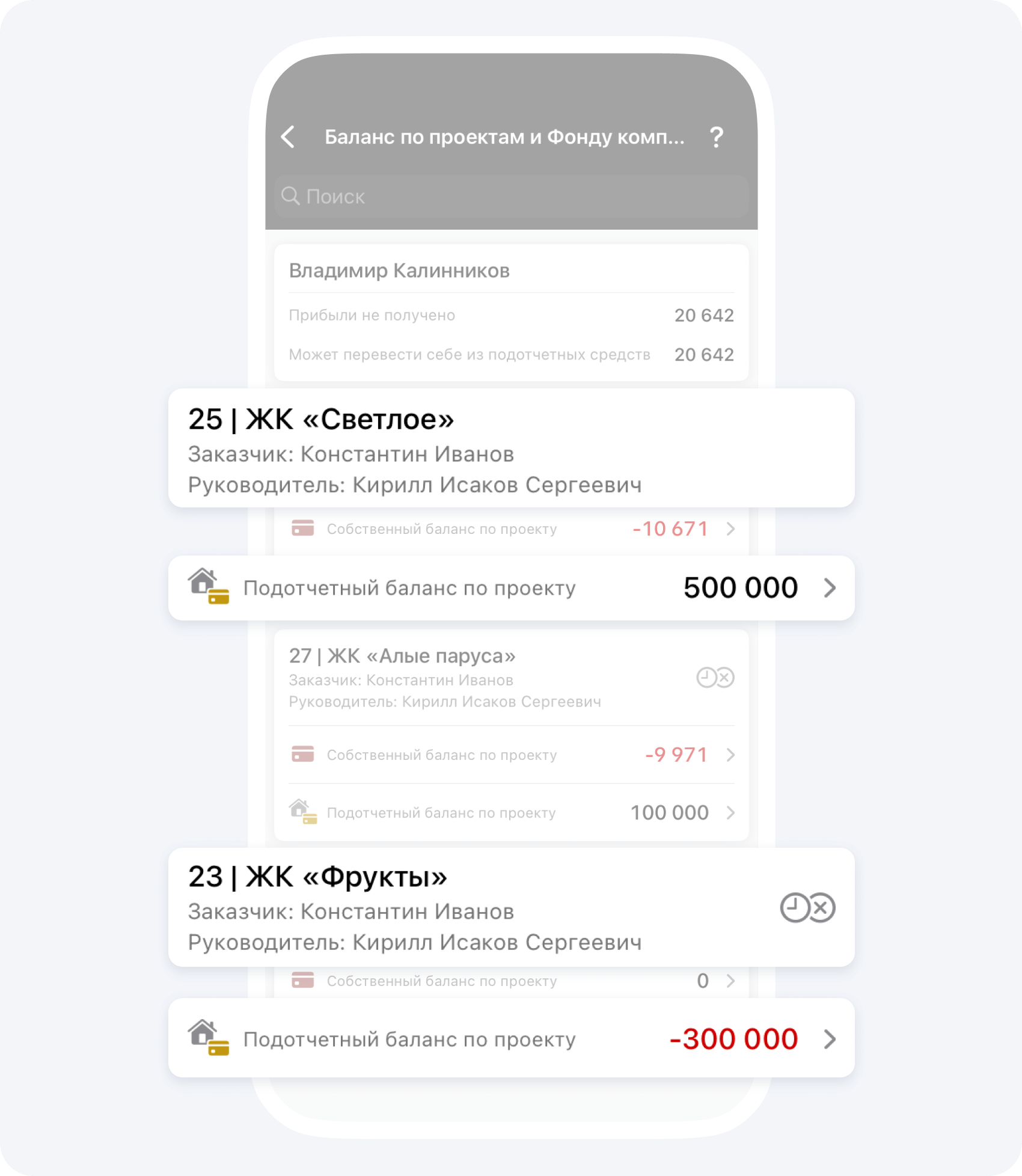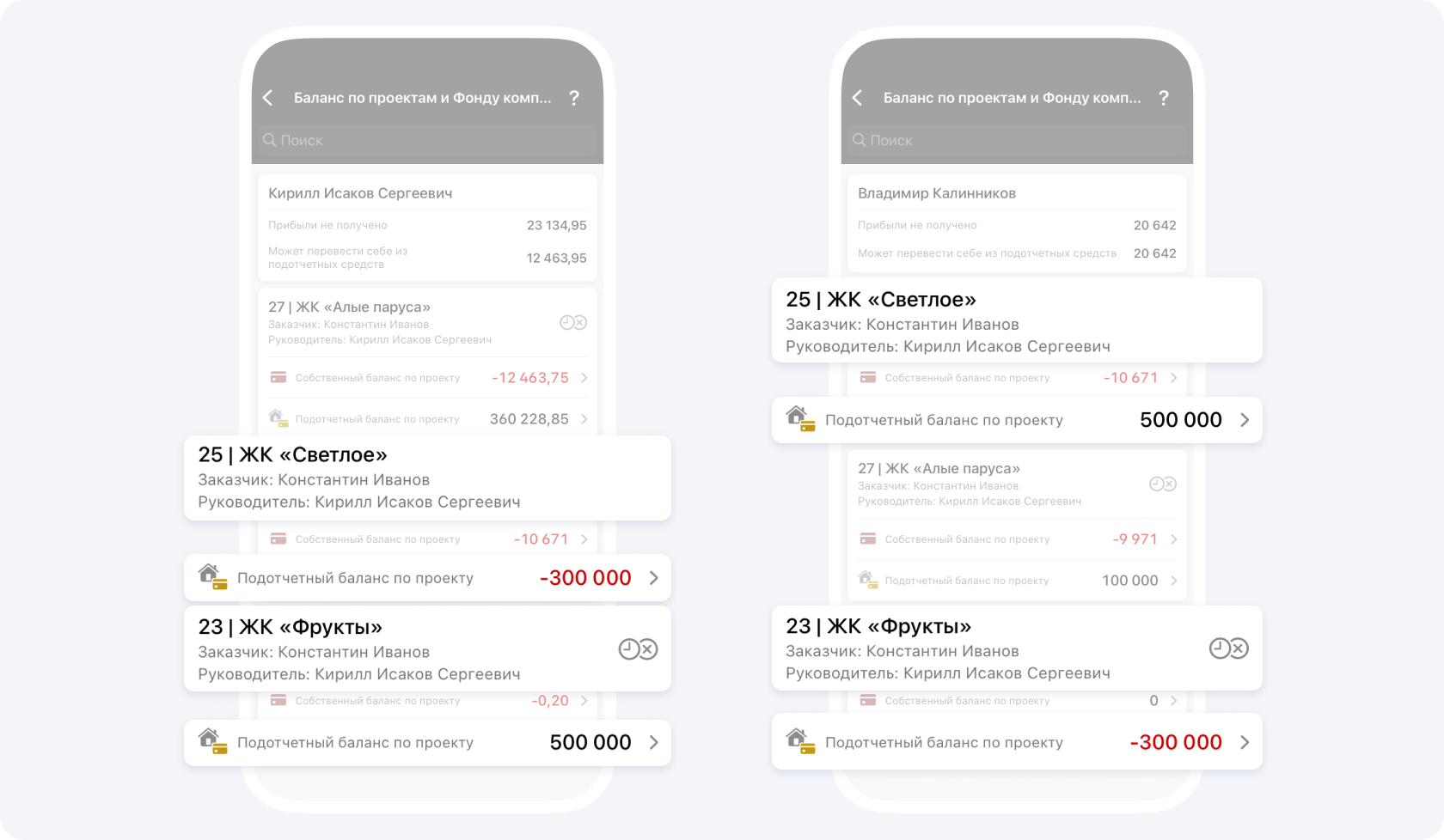 - Проект 25 | ЖК «Светлое»: подотчётный баланс −300 000 ₽.