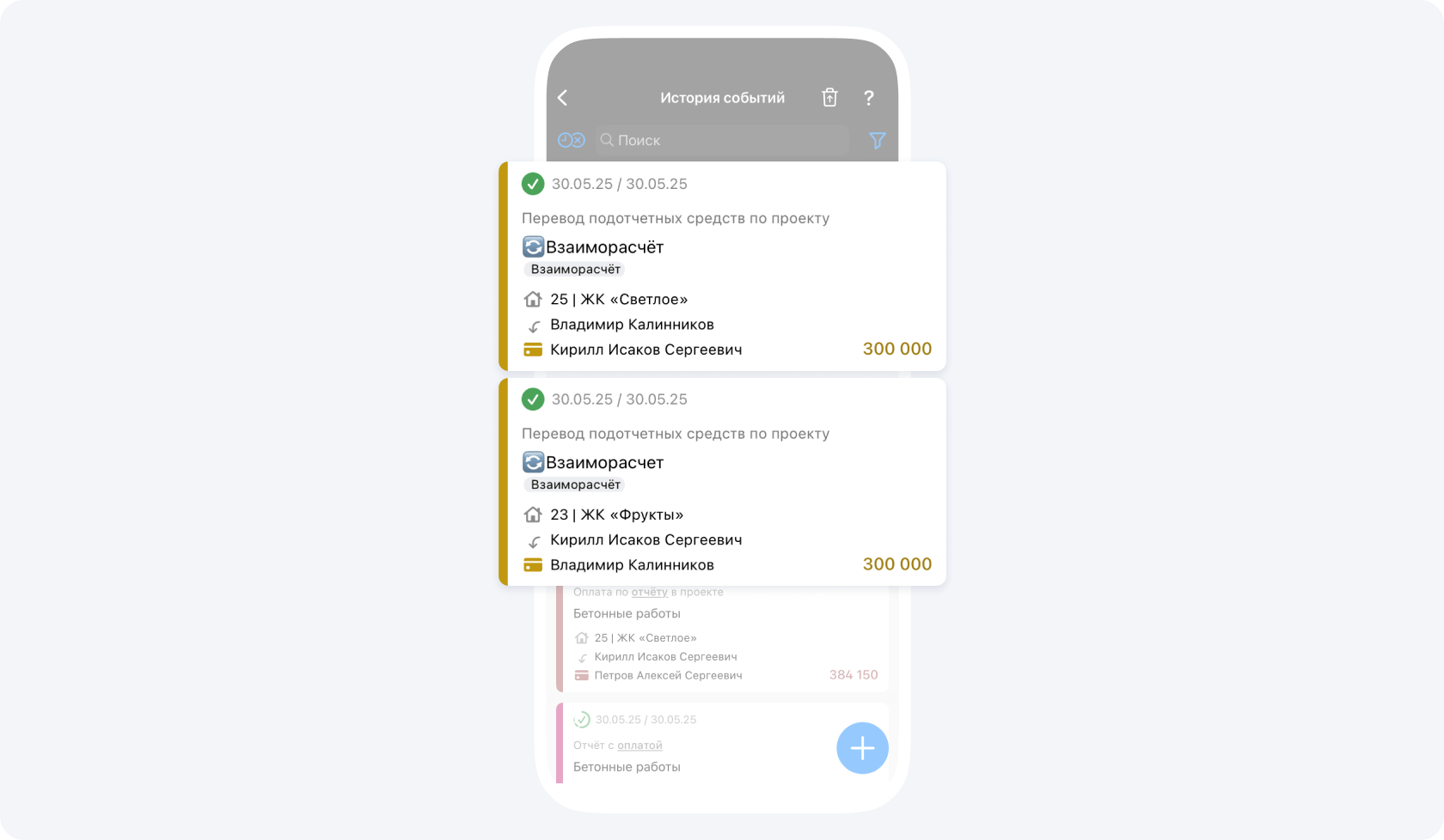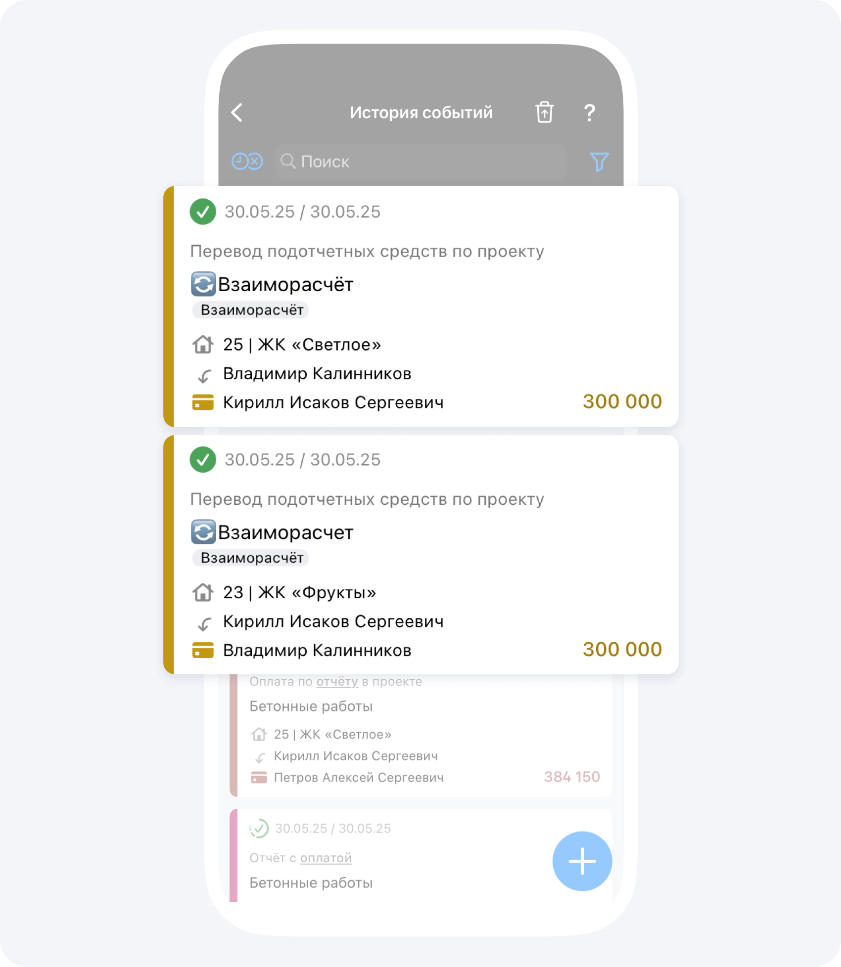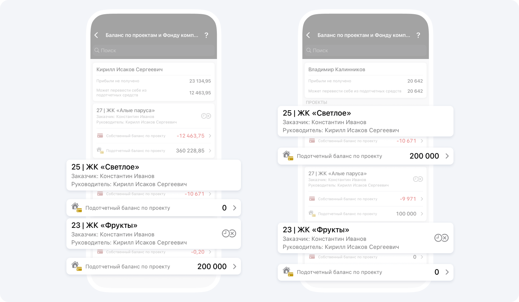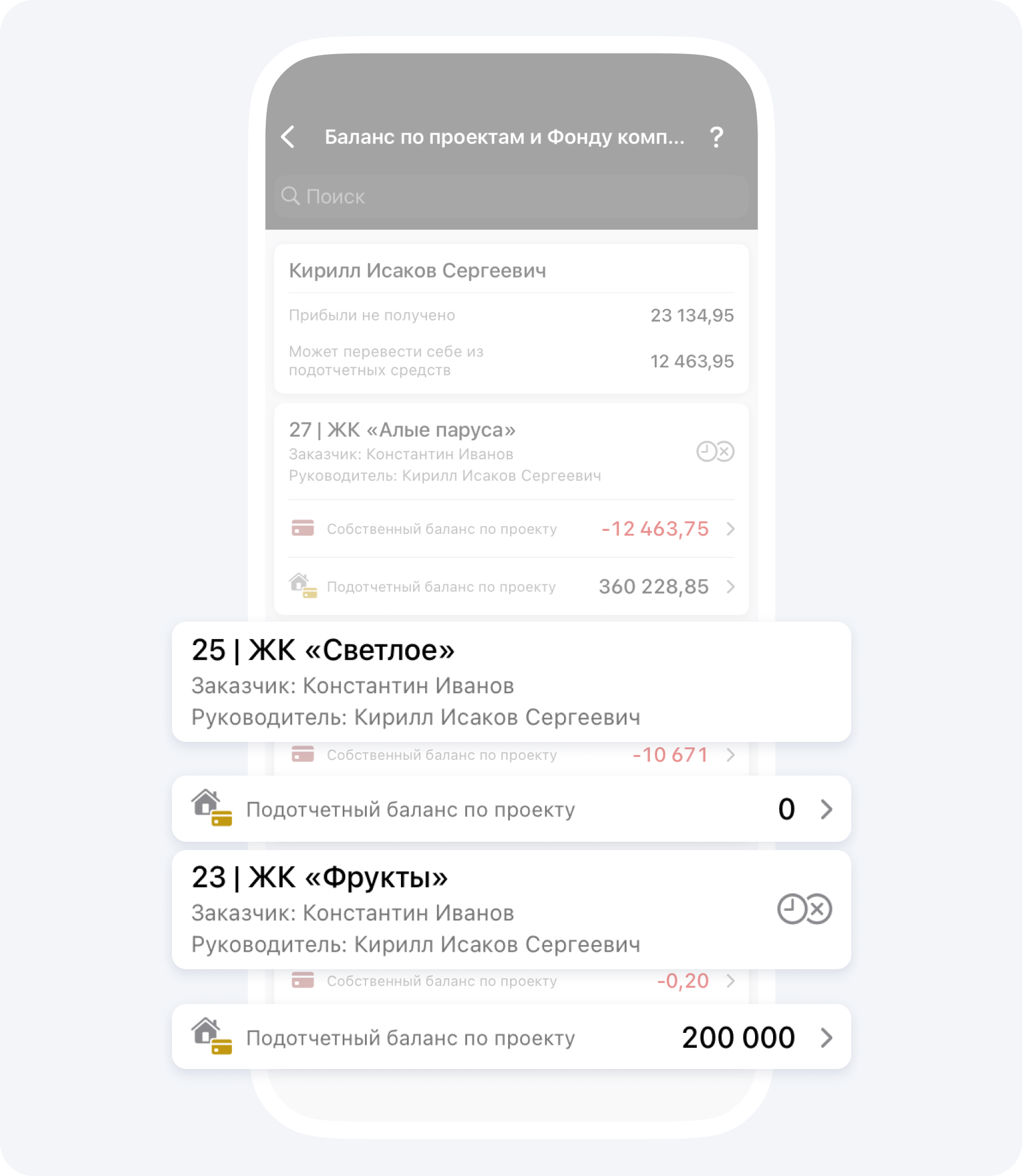 - Проект 25 | ЖК «Светлое»: подотчётный баланс −300 000 ₽.