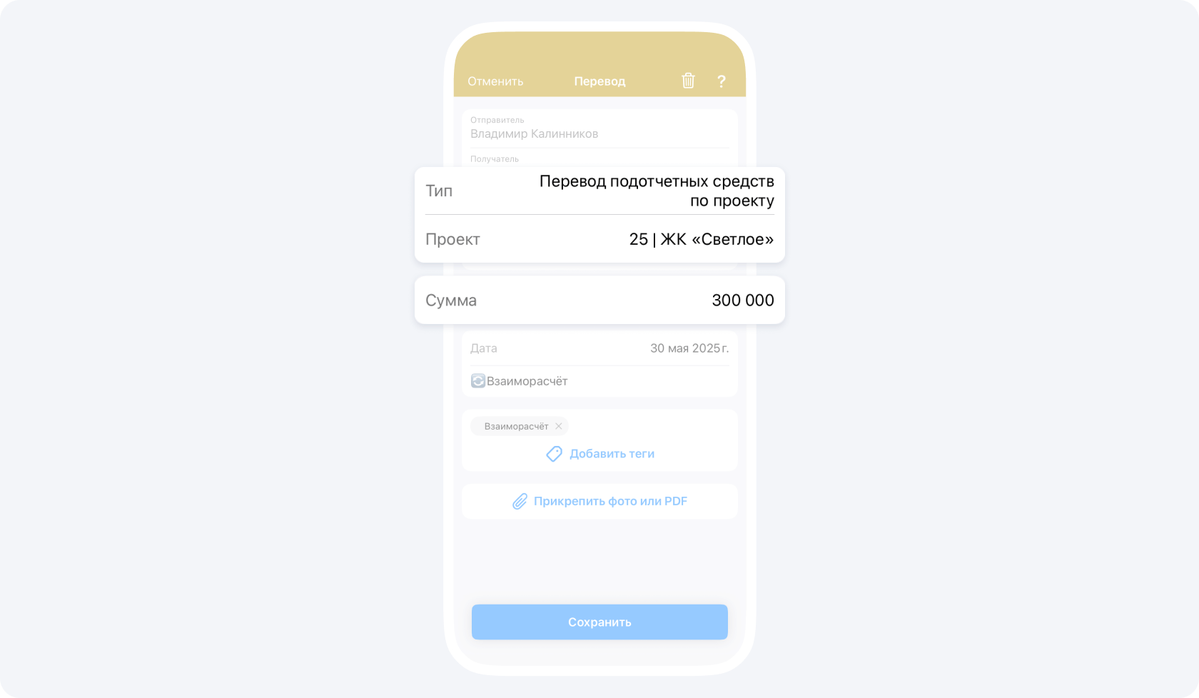 - Партнёр, в свою очередь, создаёт событие Перевод в подотчёт основателю компании по проекту 25 | ЖК «Светлое» на сумму его текущего минуса в подотчётном балансе по данному проекту.