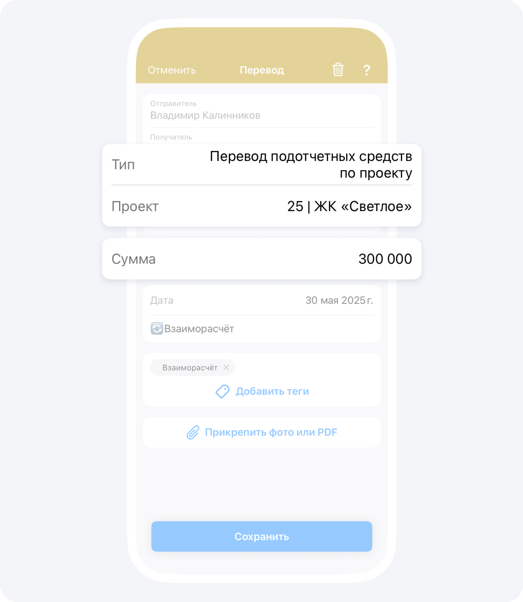 - Проект 25 | ЖК «Светлое»: подотчётный баланс +500 000 ₽.
