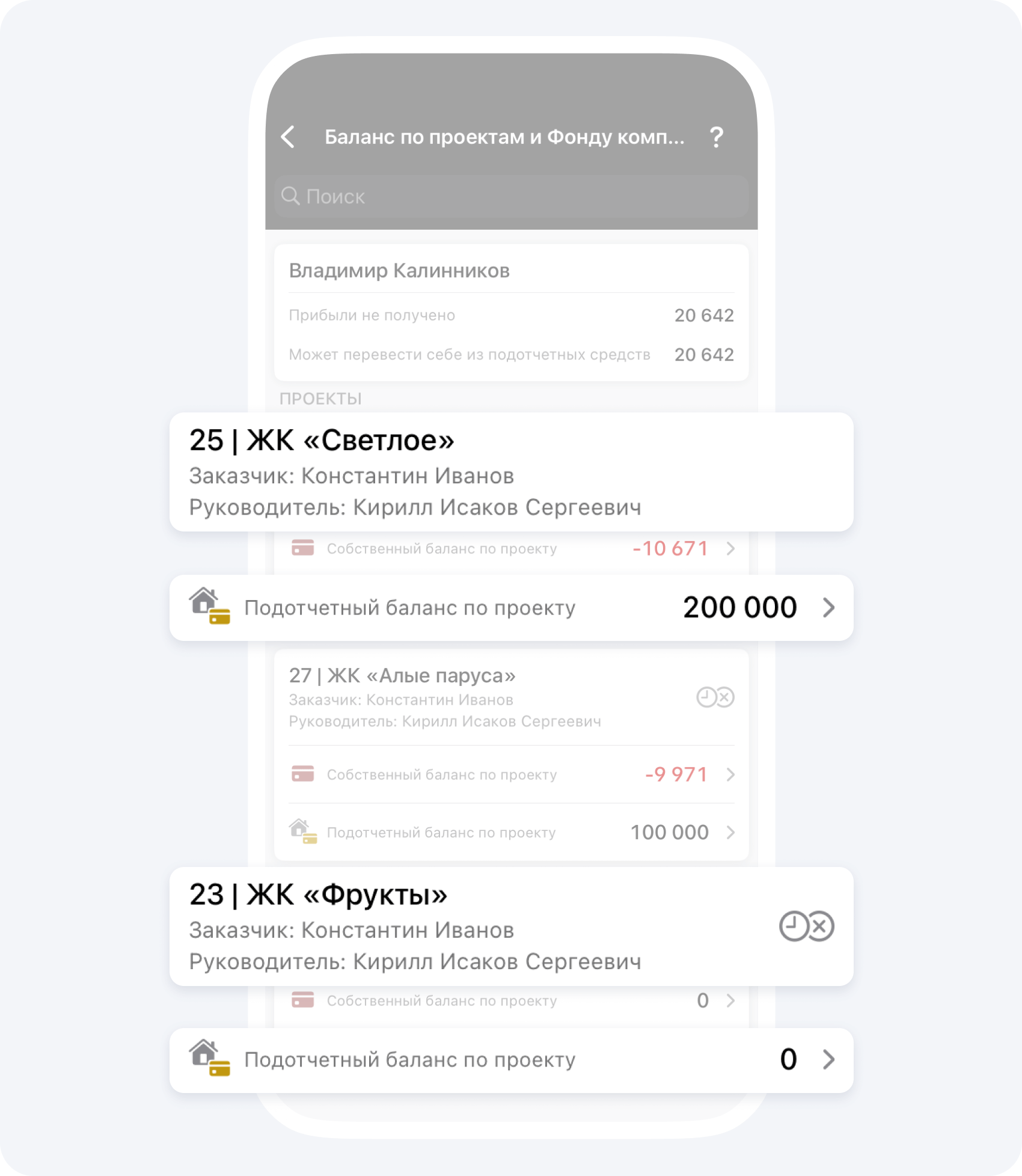 - Проект 23 | ЖК «Фрукты»: подотчётный баланс −300 000 ₽.