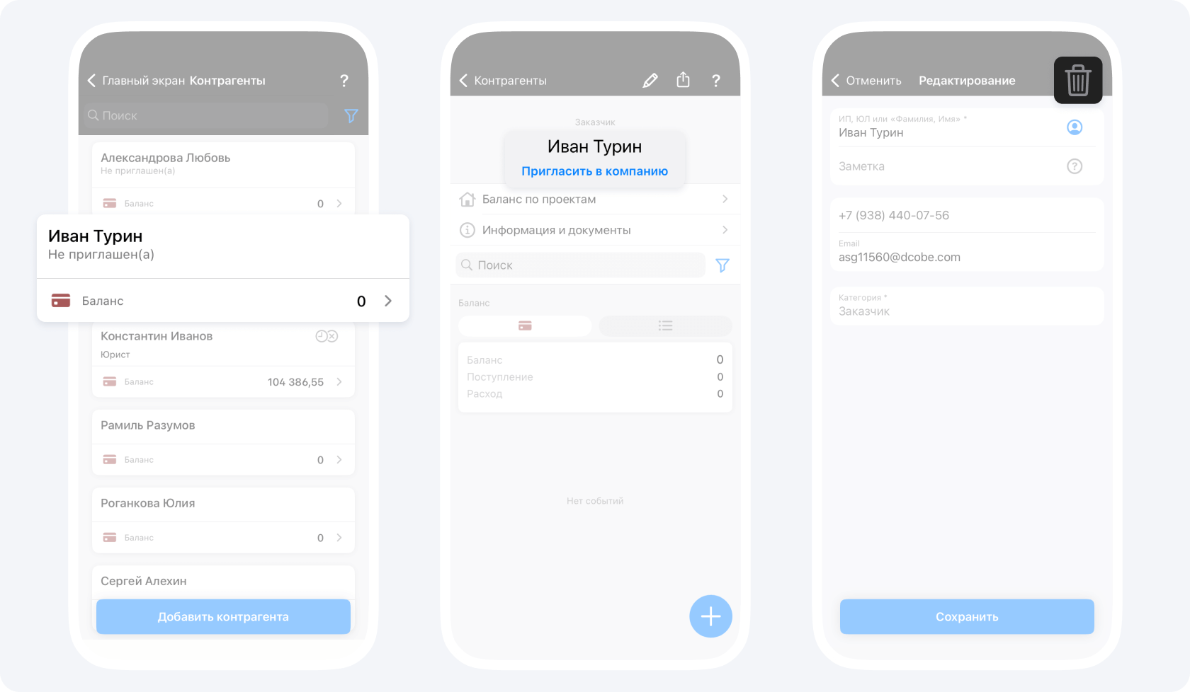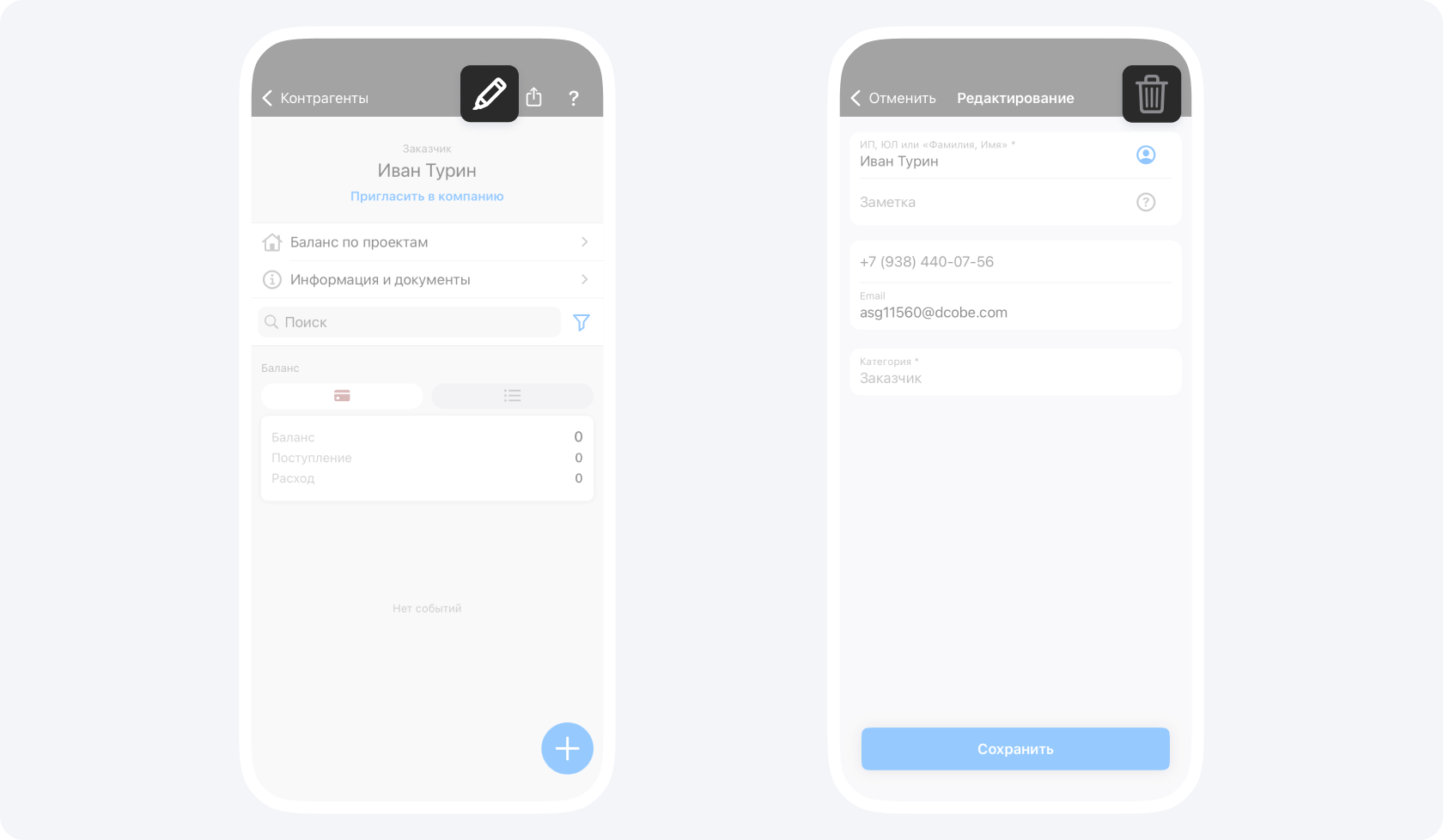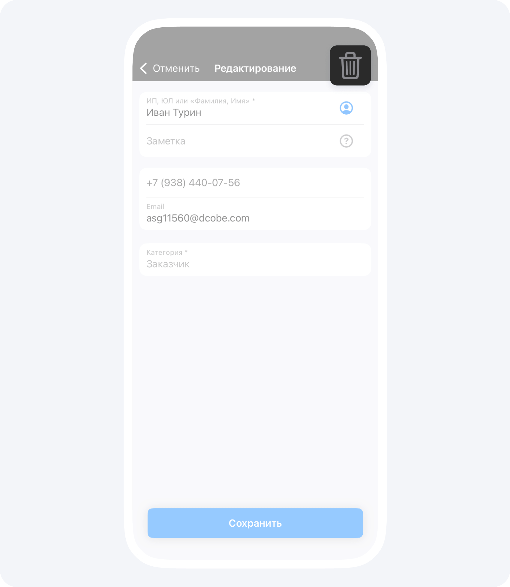 - Перейдите в профиль контрагента, далее в режим редактирования, после чего нажмите на символ удаления и подтвердите удаление контрагента.