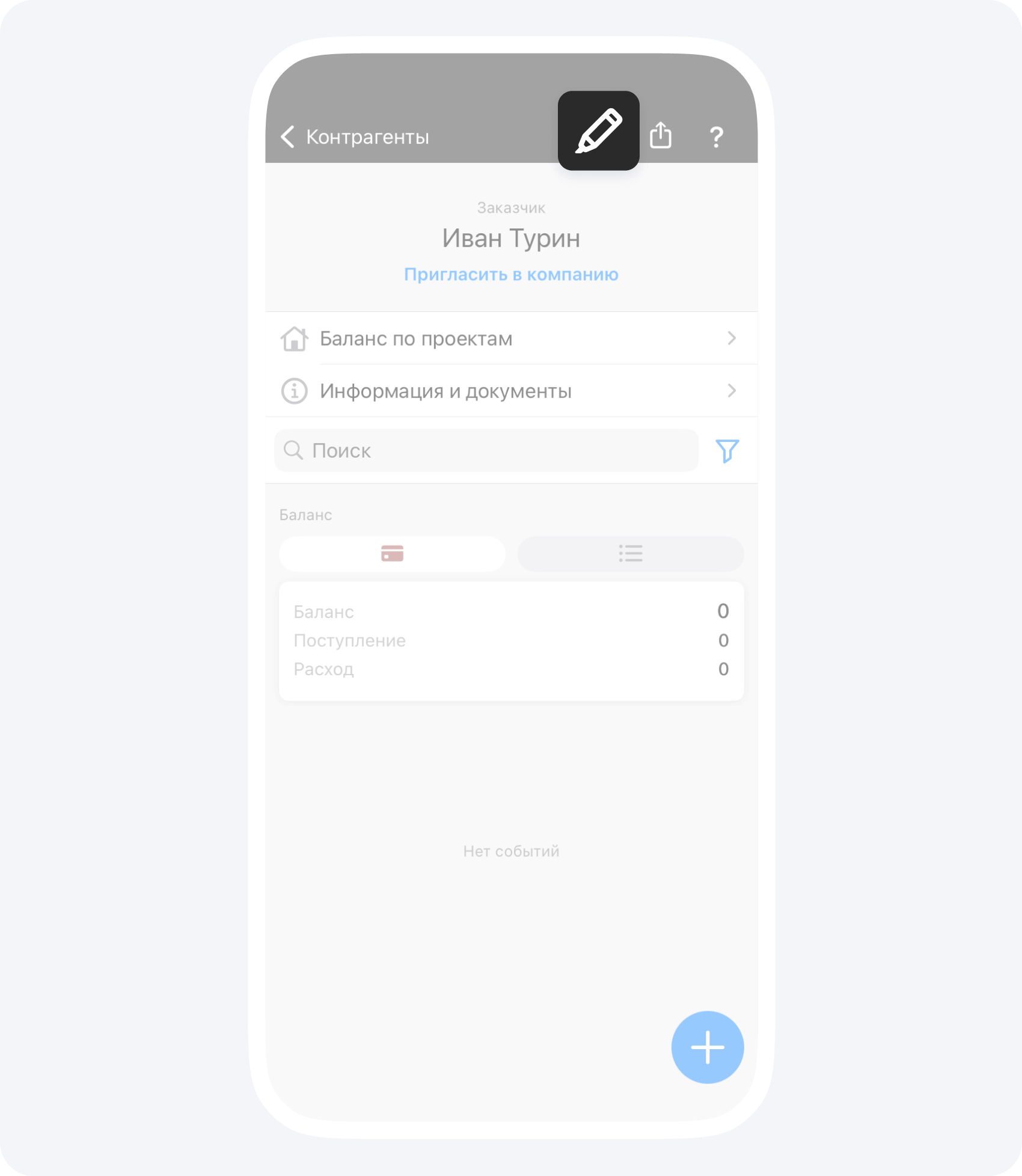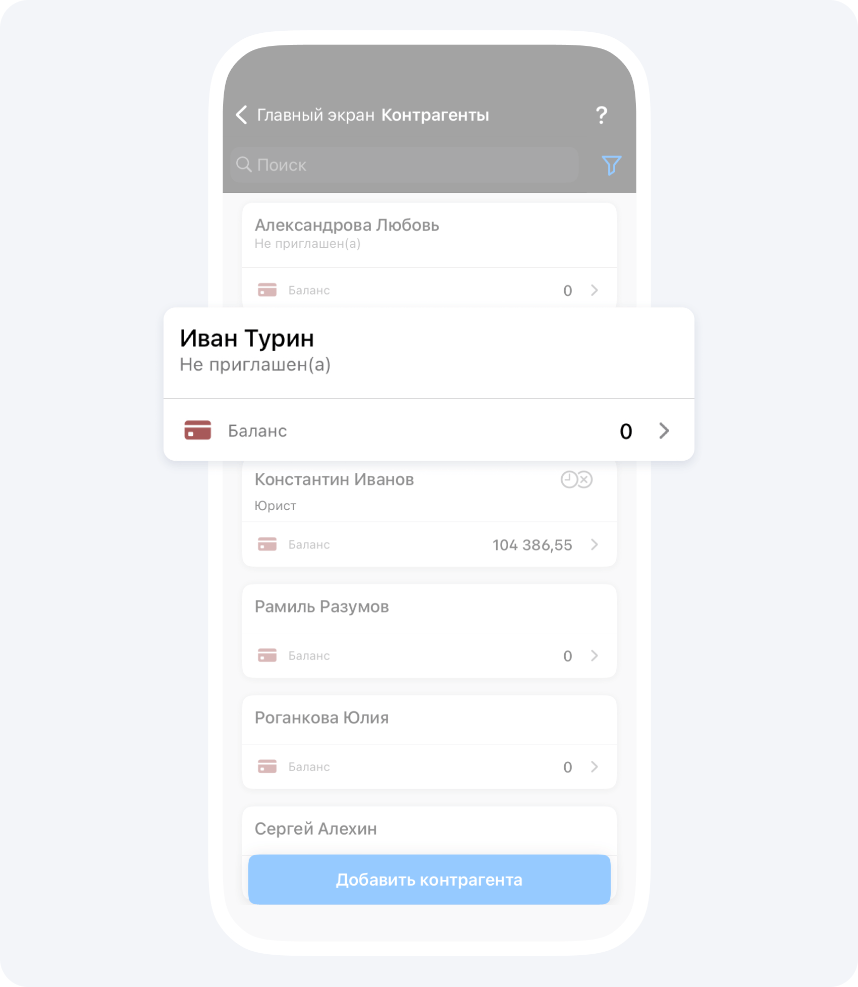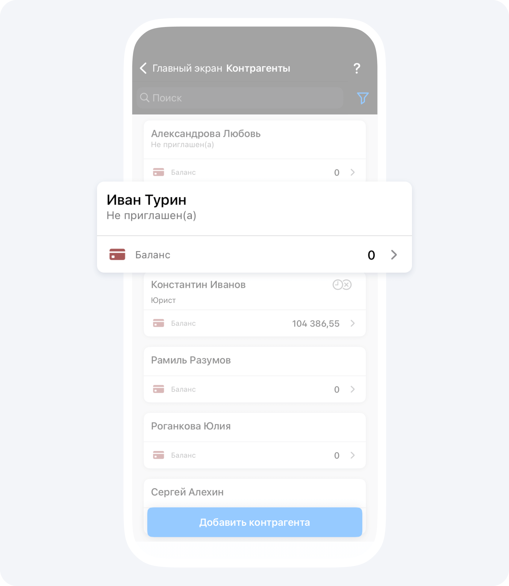 - На главном экране приложения зайдите в раздел Контрагенты и выберите контрагента.