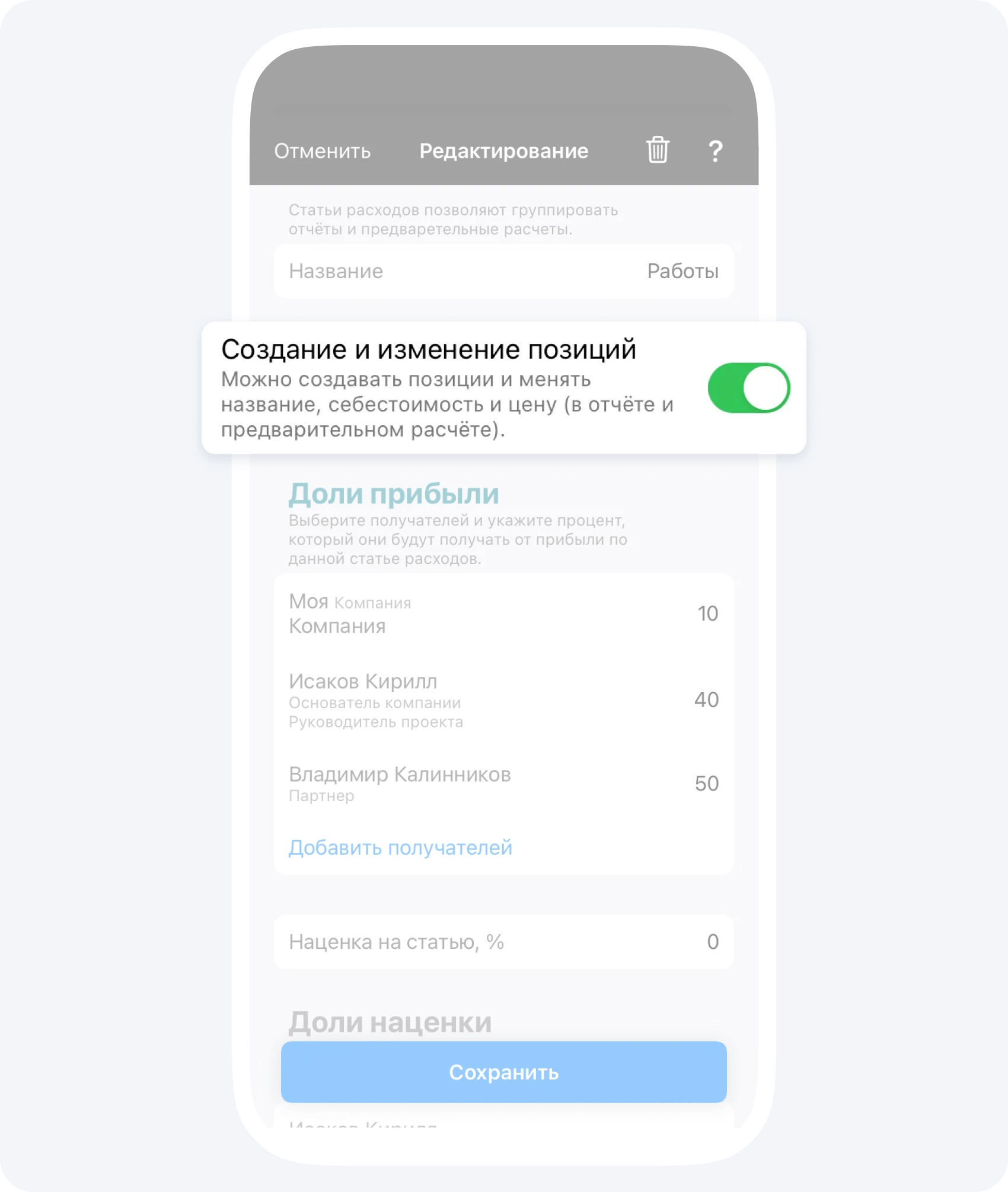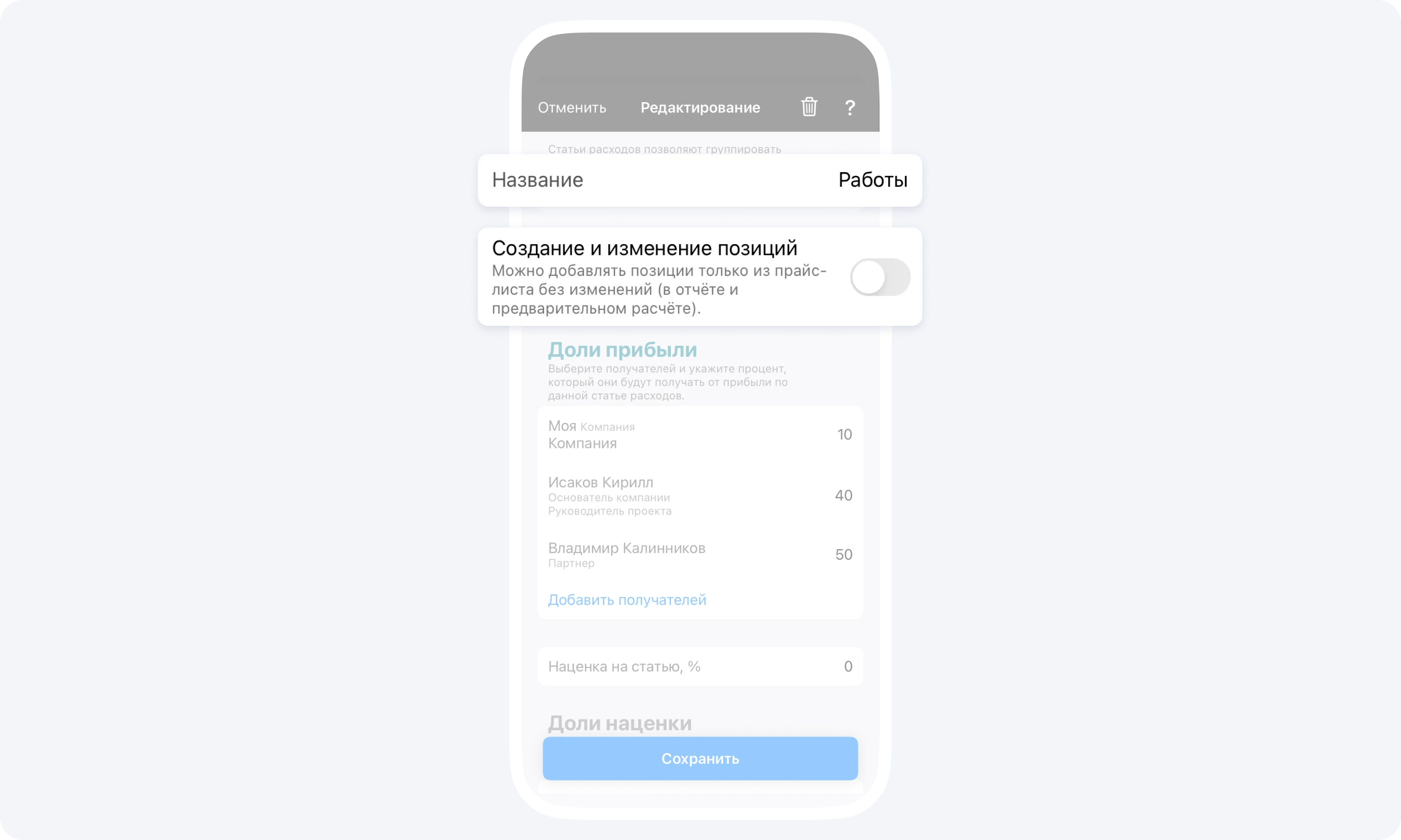 - Переведите переключатель в выключенное положение, если хотите ограничить возможность подрядчиками создавать новые позиции