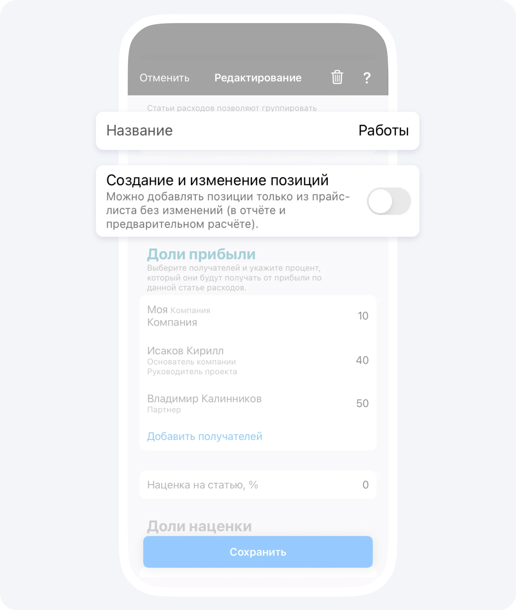 Как ограничить возможность подрядчикам создавать новые позиции и изменять цены