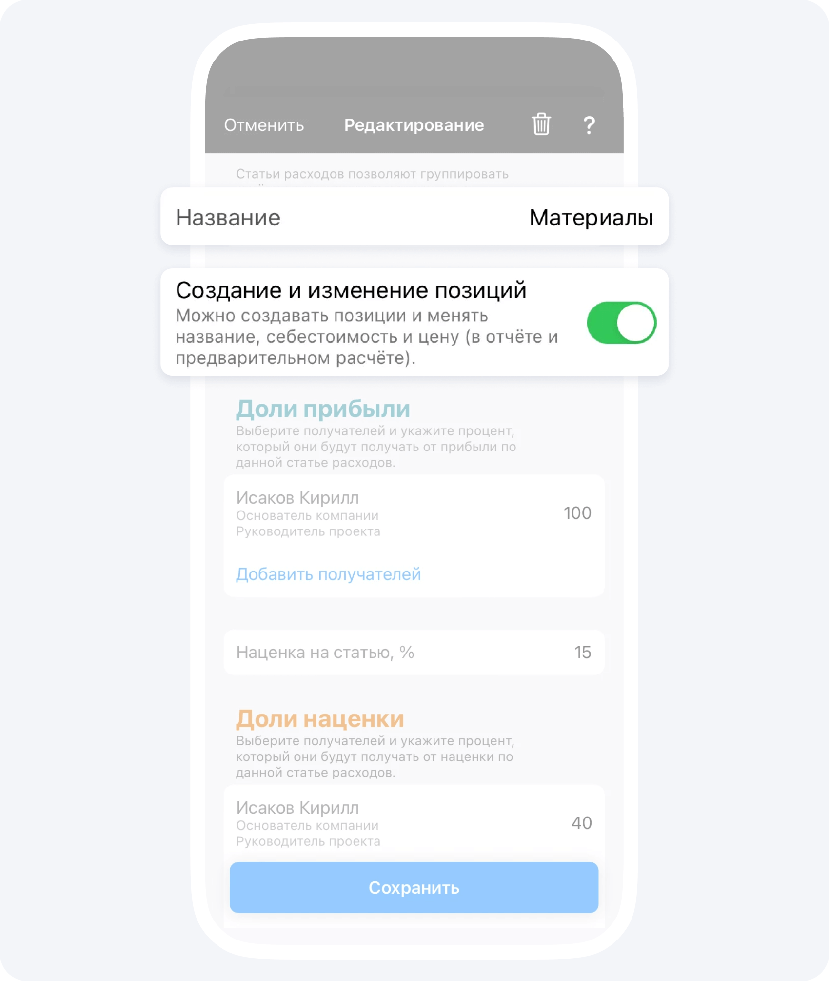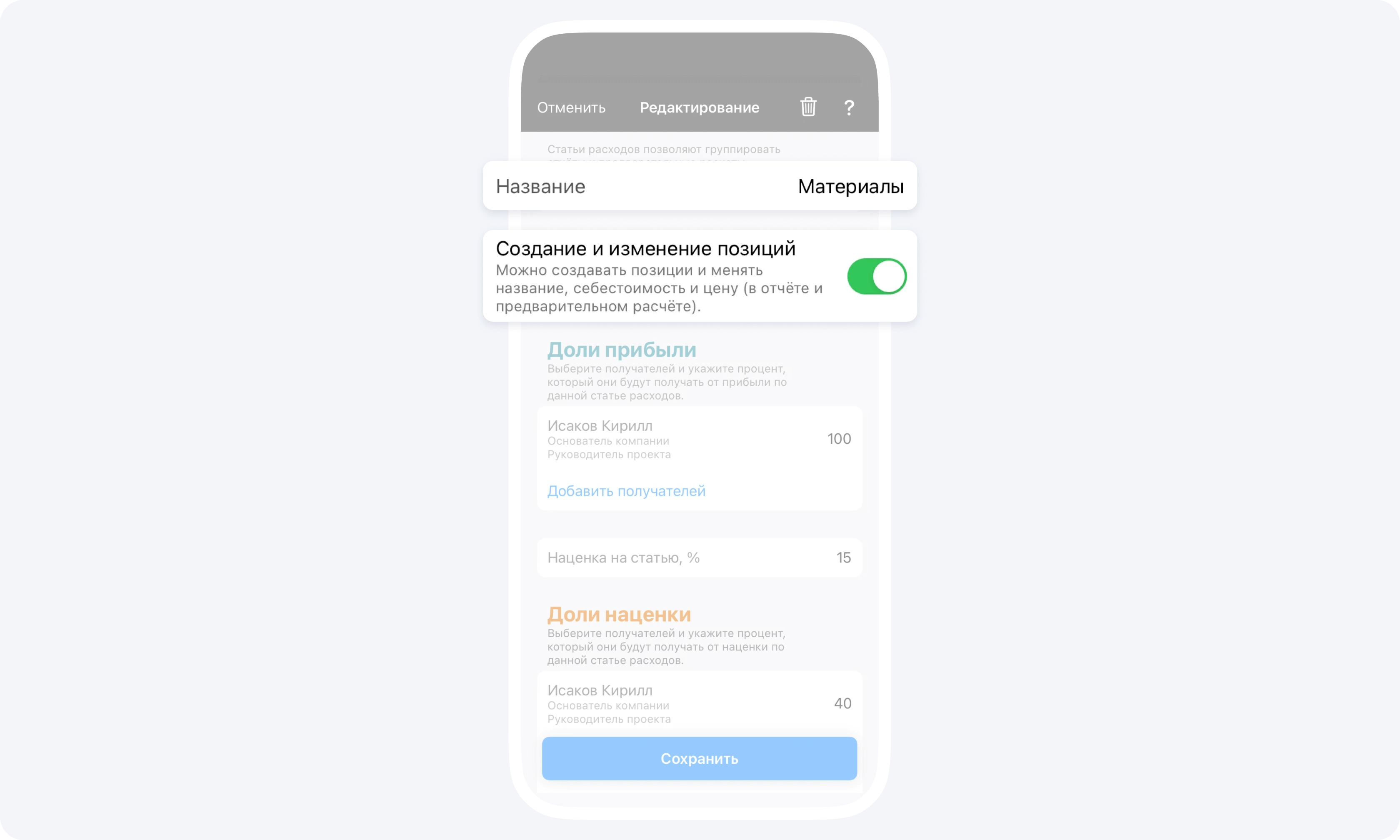 - Выберите статью расходов и перейдите в режим редактирования