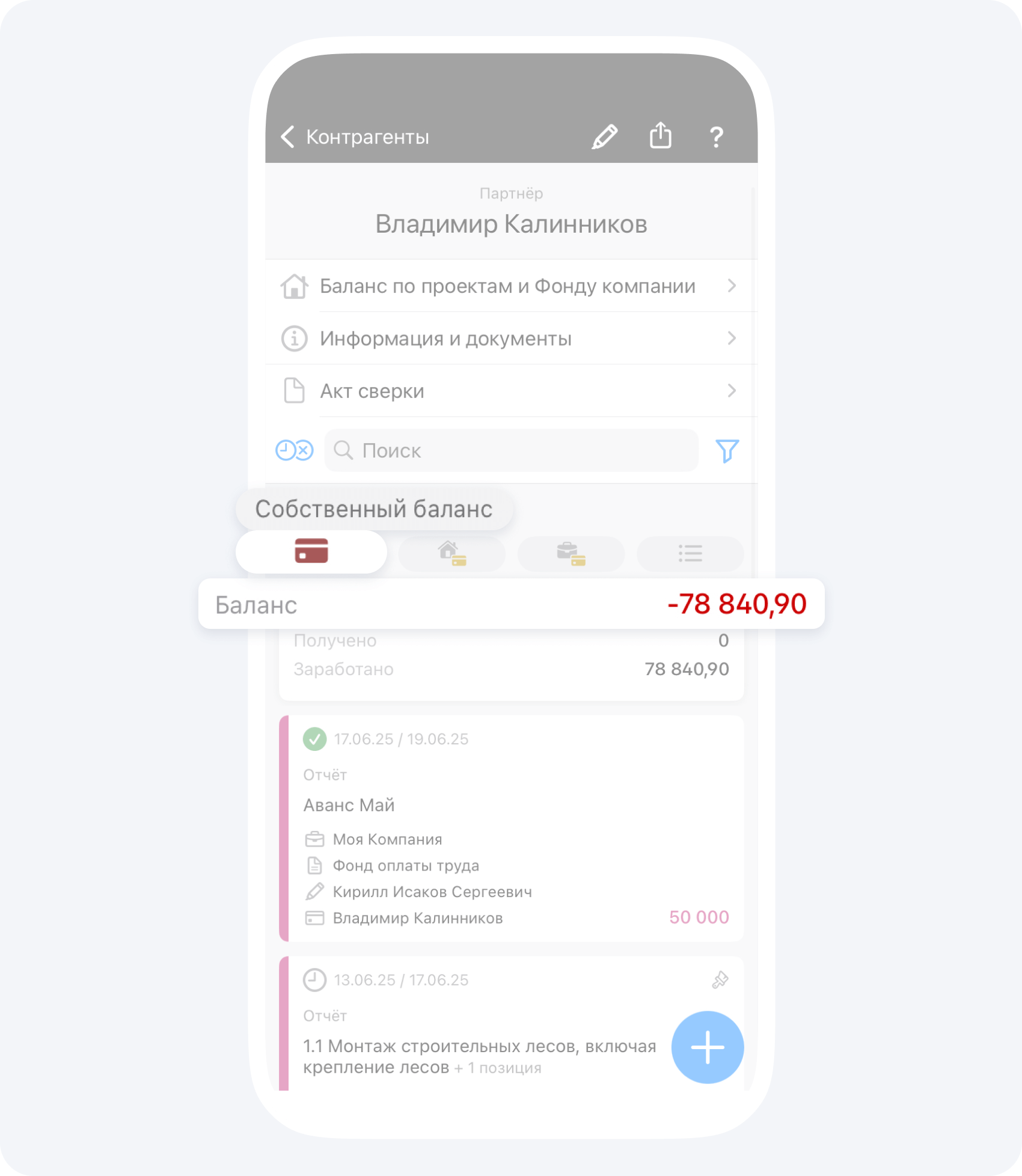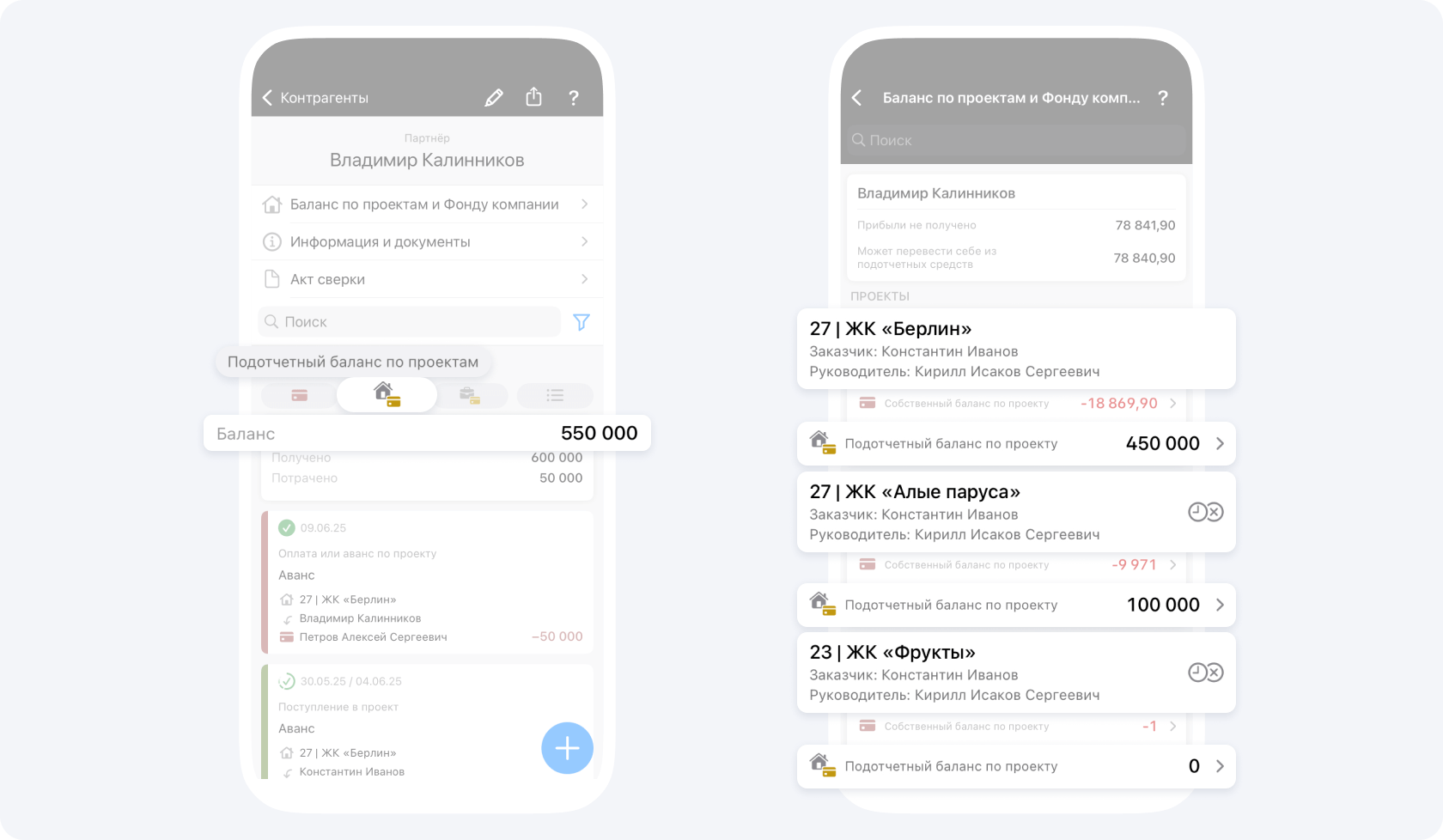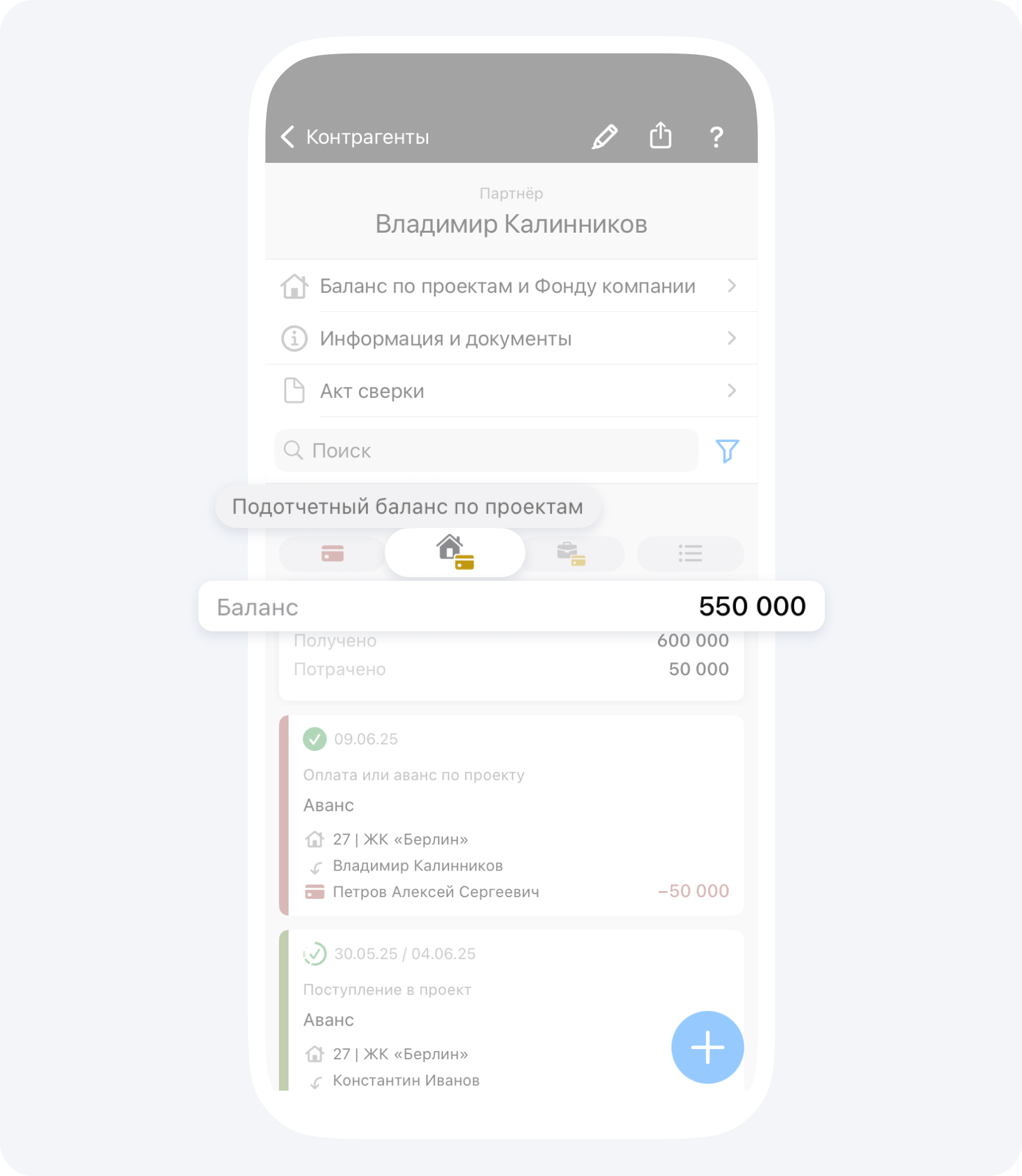 На подотчётном балансе по проектам отображаются средства сторонних контрагентов, находящиеся в вашем распоряжении или в распоряжении ваших партнёров.