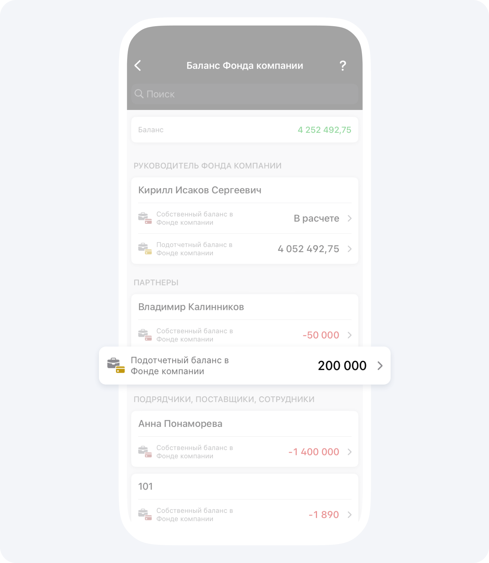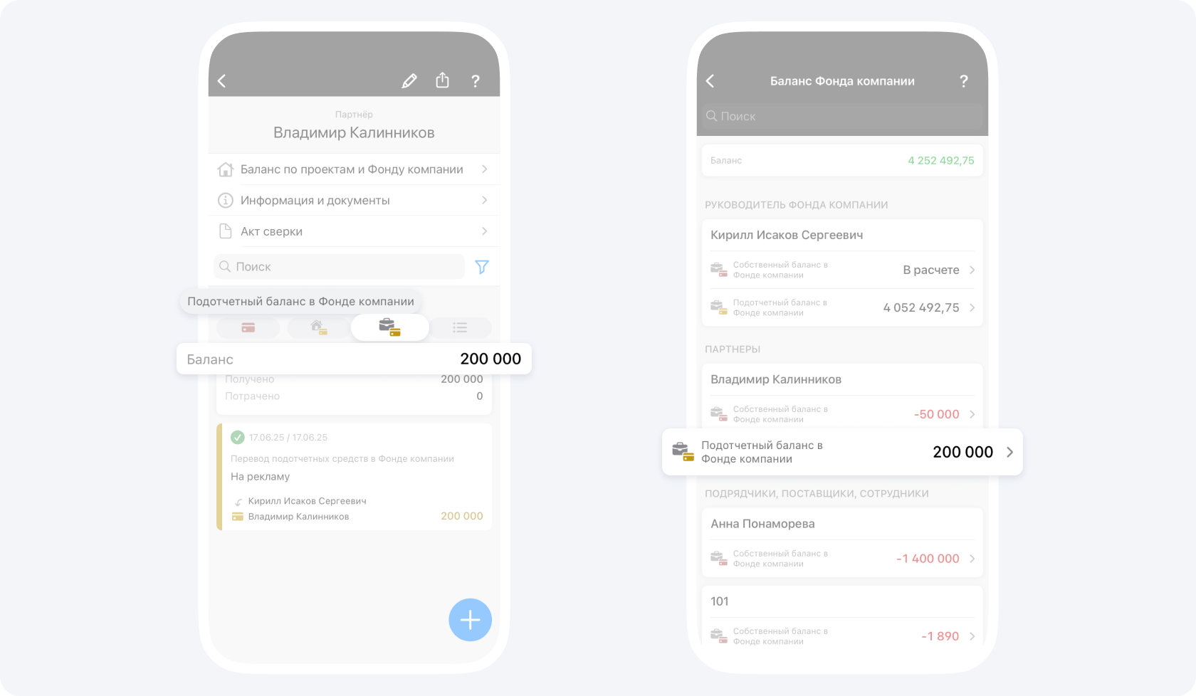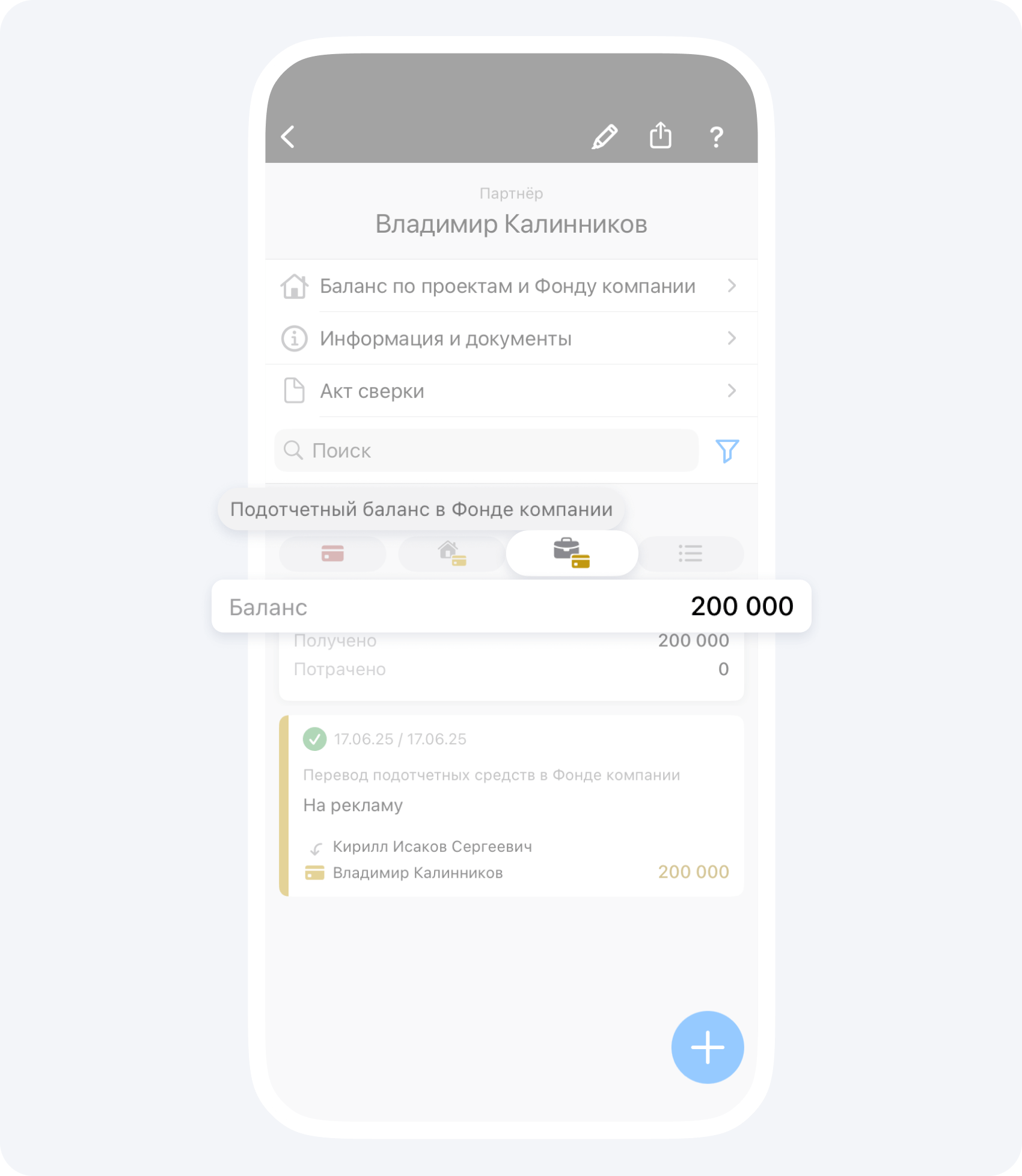 Подотчётный баланс в Фонде компании отражает средства, за расходование которых вы несёте ответственность. Эти средства могут использоваться на внутренние нужды компании — аренду офиса, уплату налогов, рекламу и другие операционные расходы.