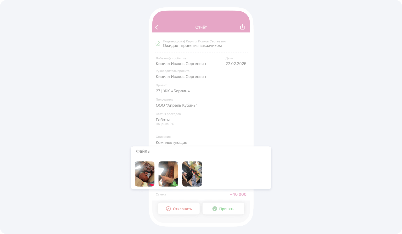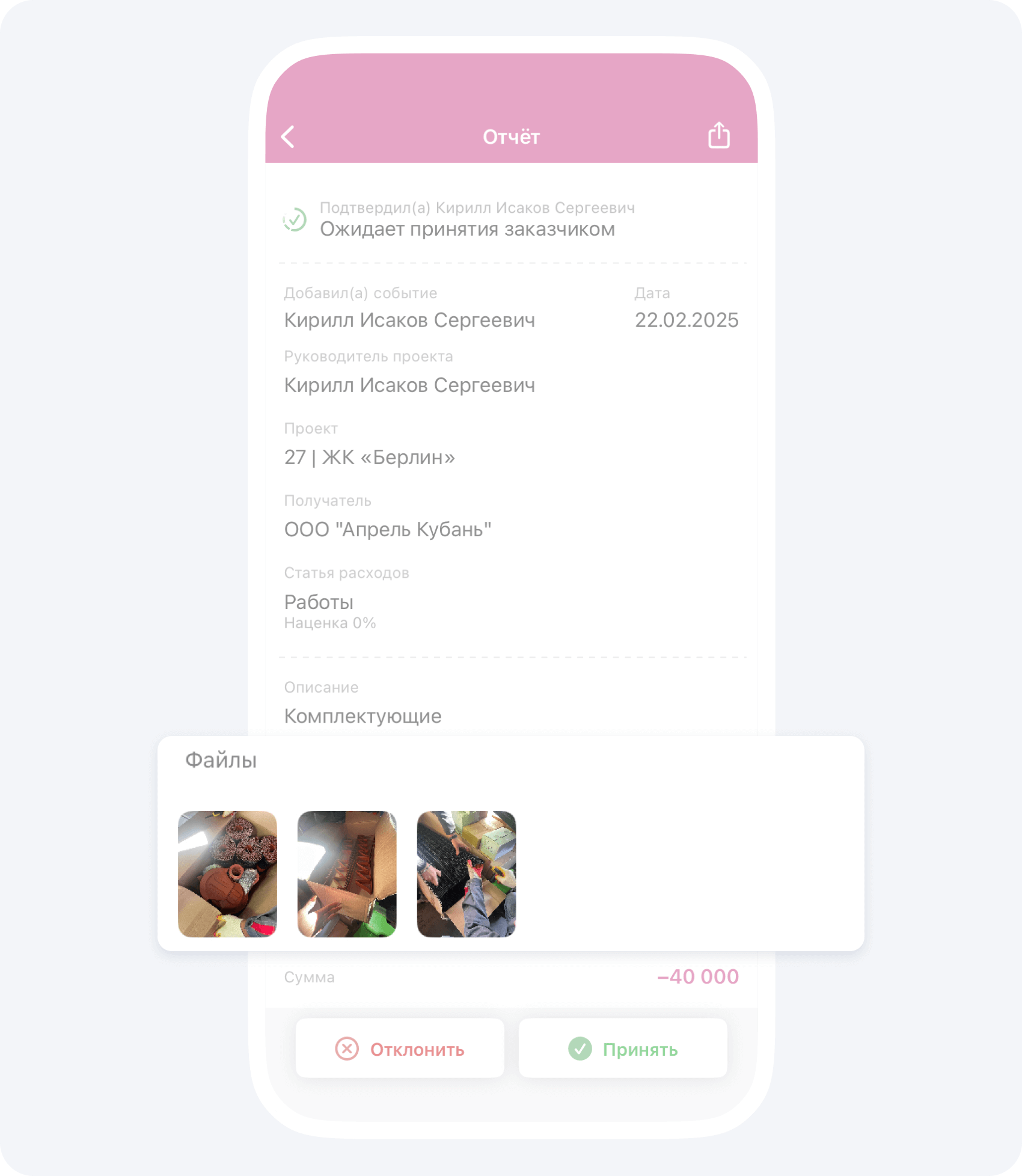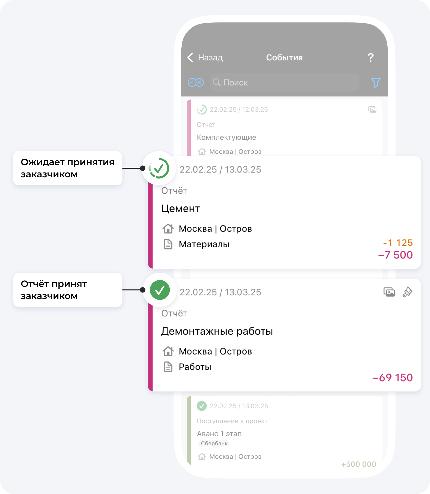 Получая отчеты от подрядчика в приложении, заказчик может не звонить подрядчику по любому вопросу и не ездить на объект каждую неделю. В каждом событии «Отчет» он увидит фото, подтверждающее, что например, материал закуплен, доставлен на объект заказчика или что работы выполнены. Так экономится время на коммуникацию!