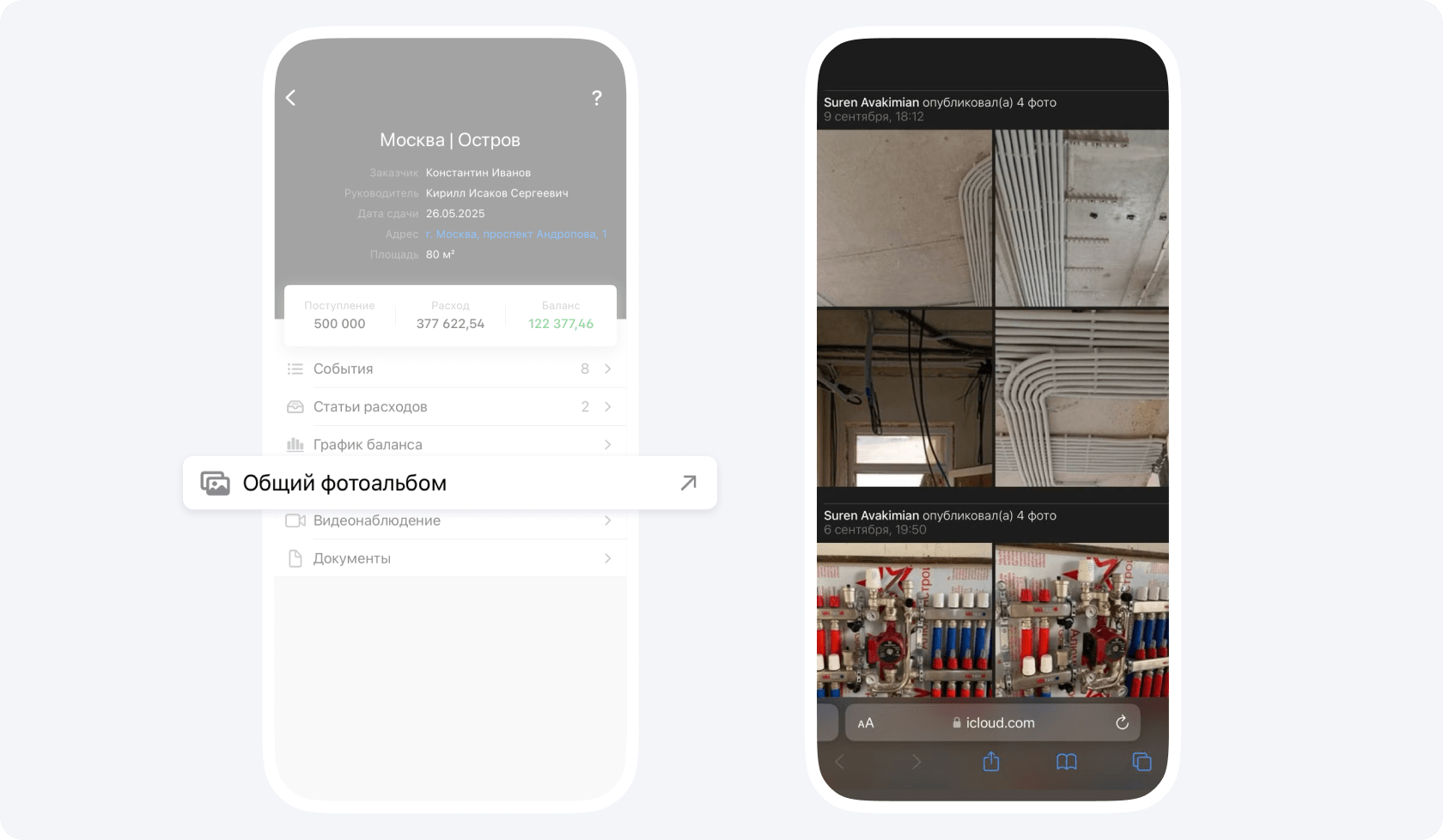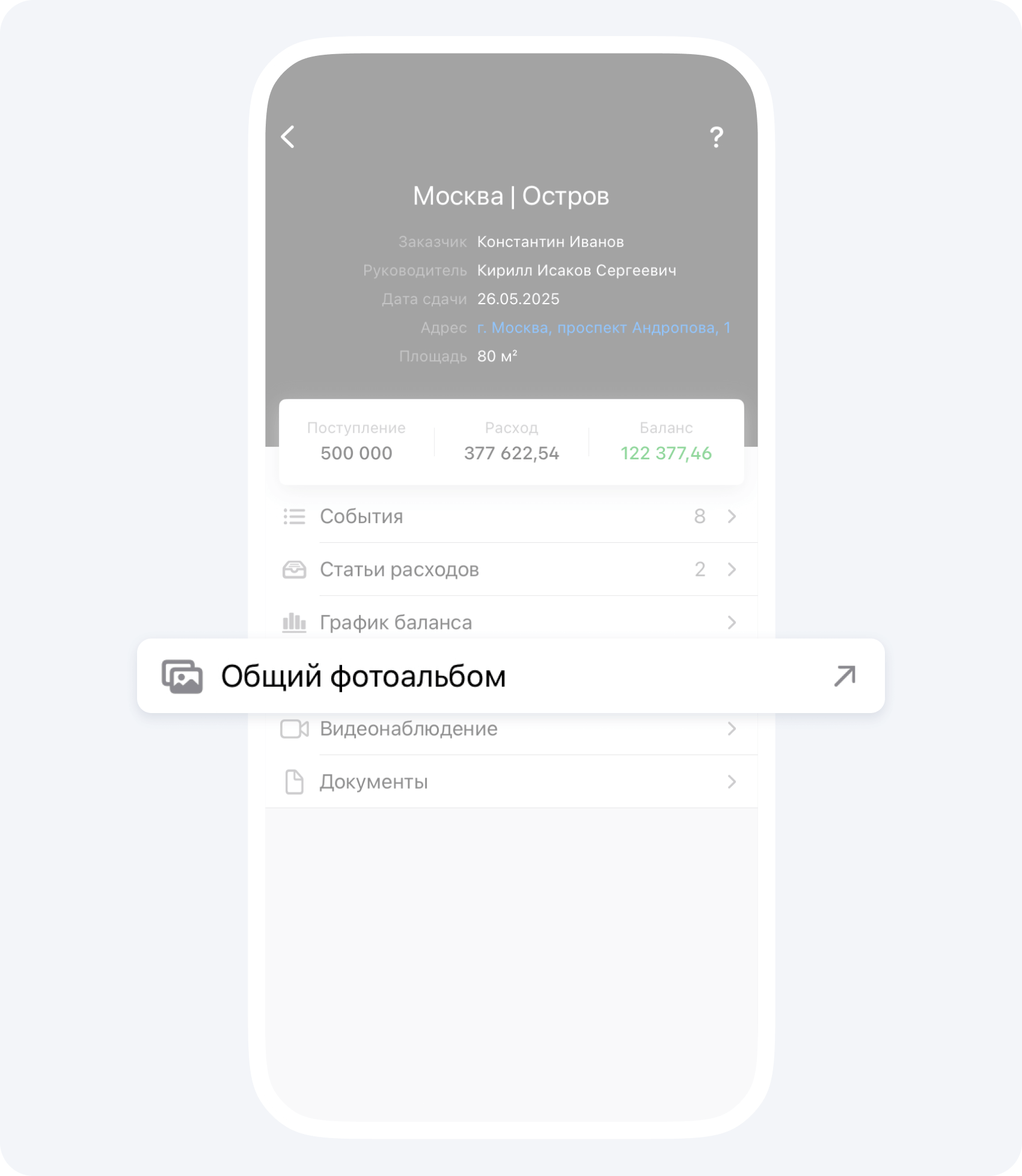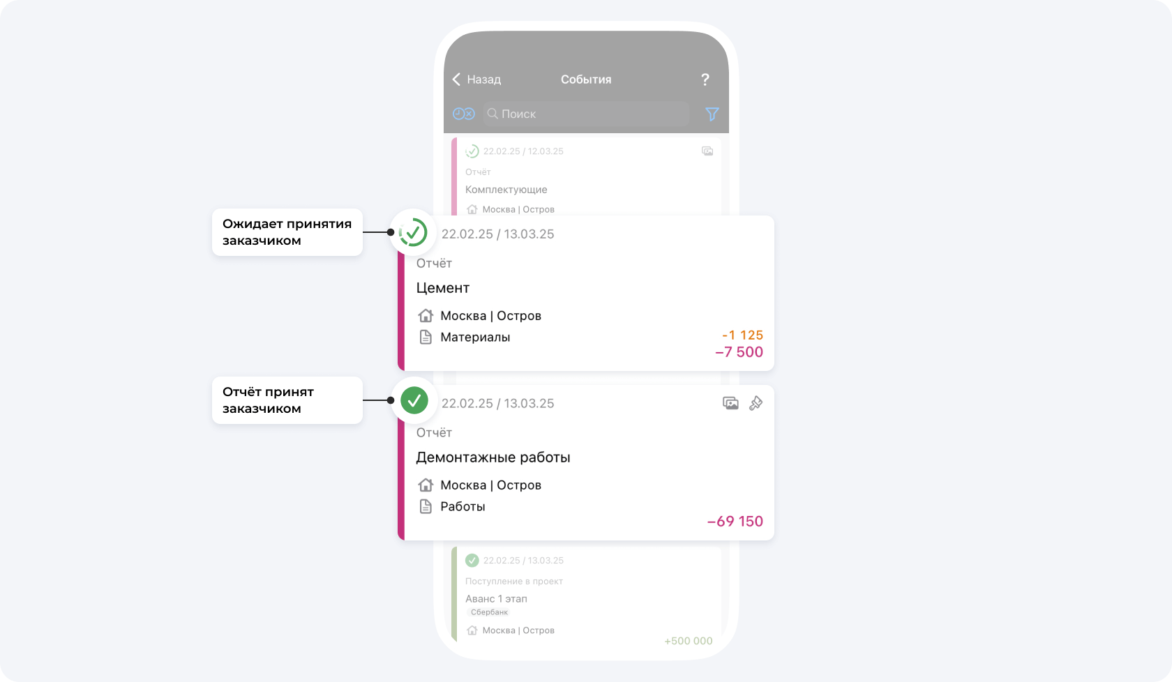 Получая отчеты от подрядчика в приложении, заказчик может не звонить подрядчику по любому вопросу и не ездить на объект каждую неделю. В каждом событии «Отчет» он увидит фото, подтверждающее, что например, материал закуплен, доставлен на объект заказчика или что работы выполнены. Так экономится время на коммуникацию!