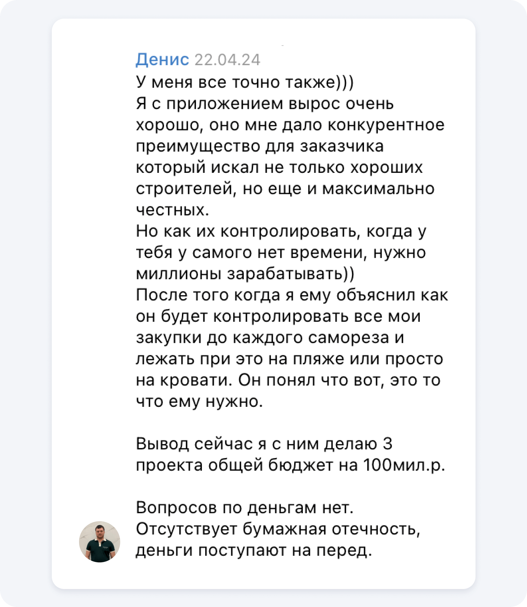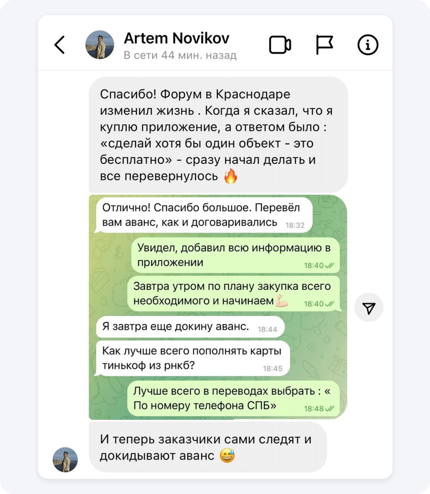 Заказчики психологически чувствуют, что с приложением часть ответственности за качество и скорость работ на объекте лежит на них: от того, насколько быстро они внесут аванс, зависит, как скоро бригада перейдет на следующий этап.