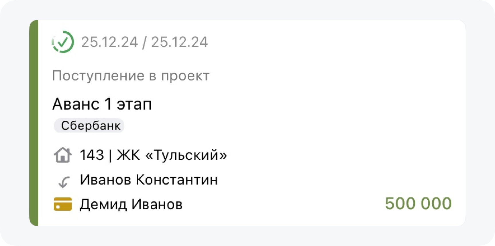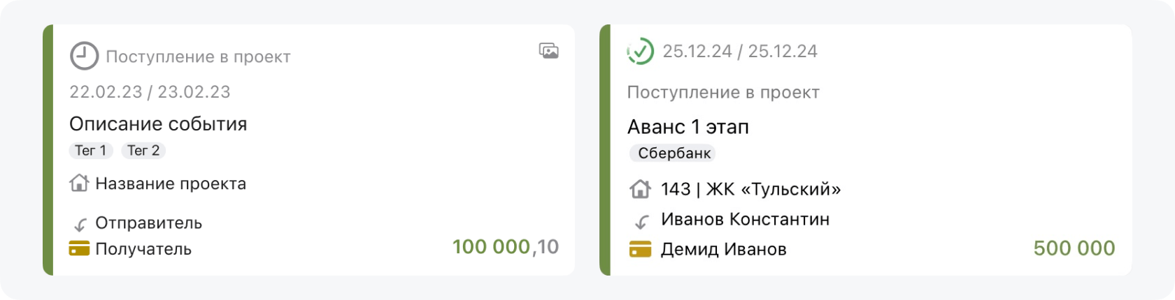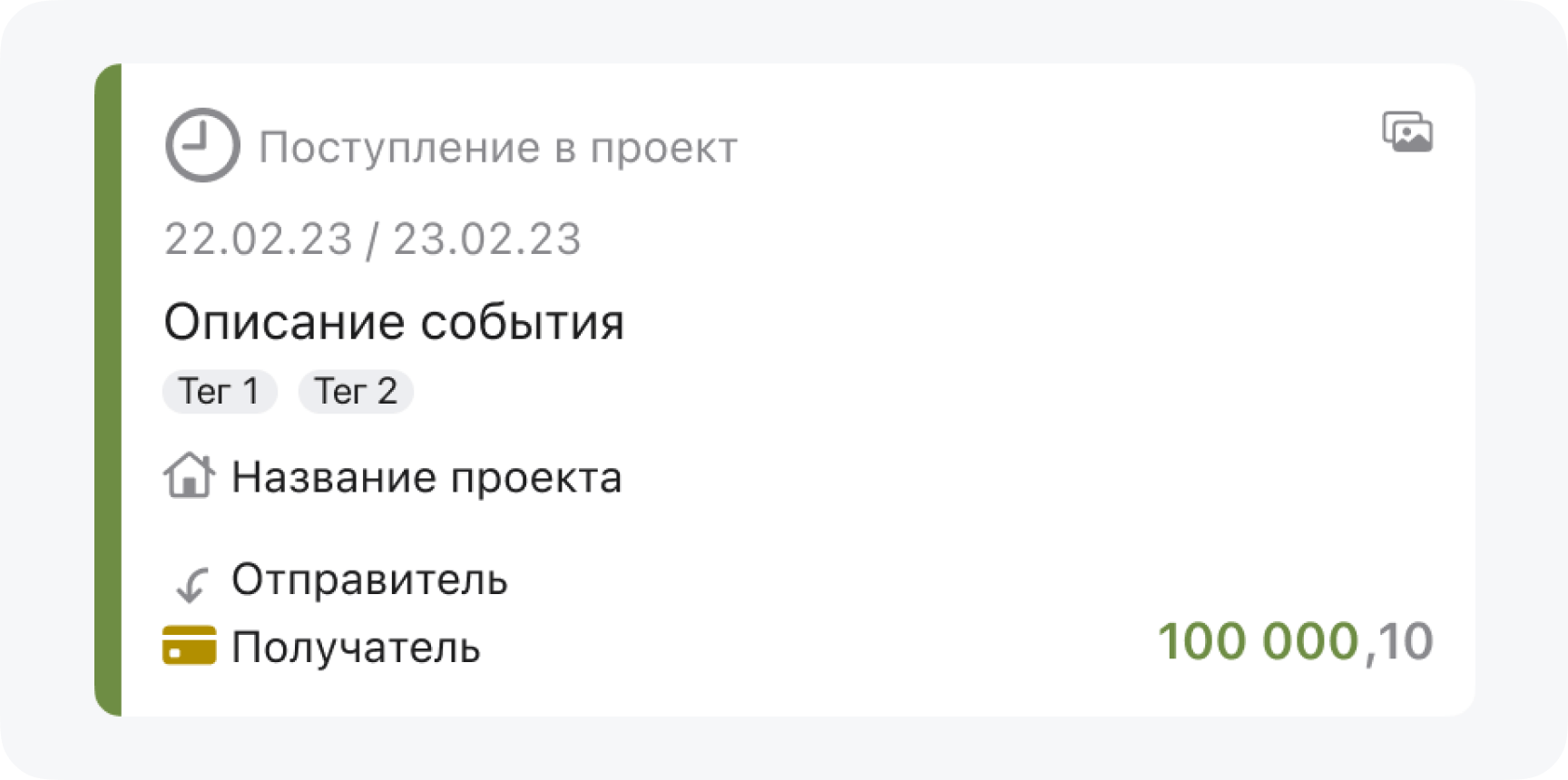 После создания и подтверждения события, сумма денежных средств зачислится на баланс проекта и подотчётный баланс контрагента, который создал событие Поступление.