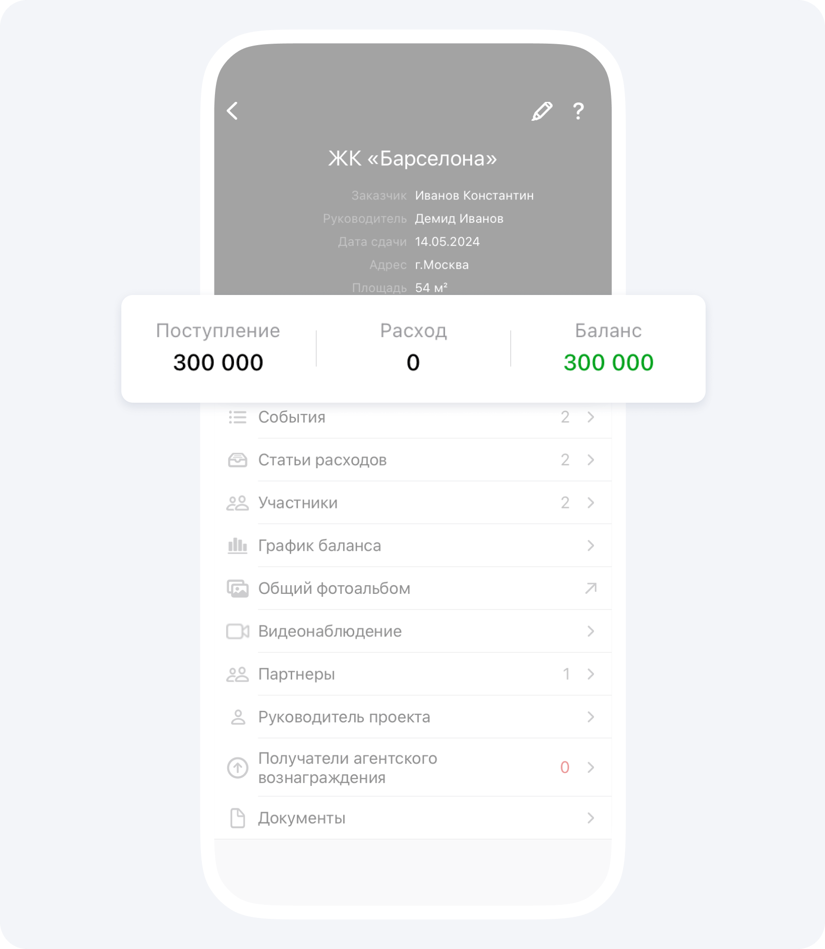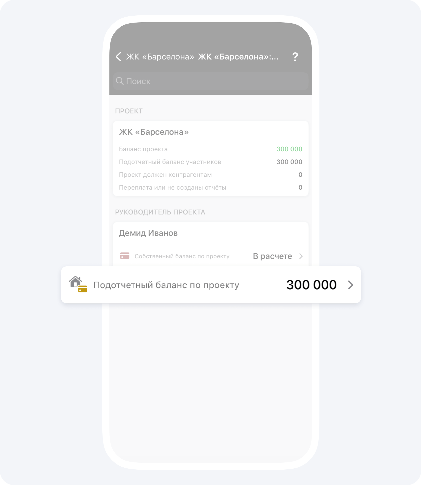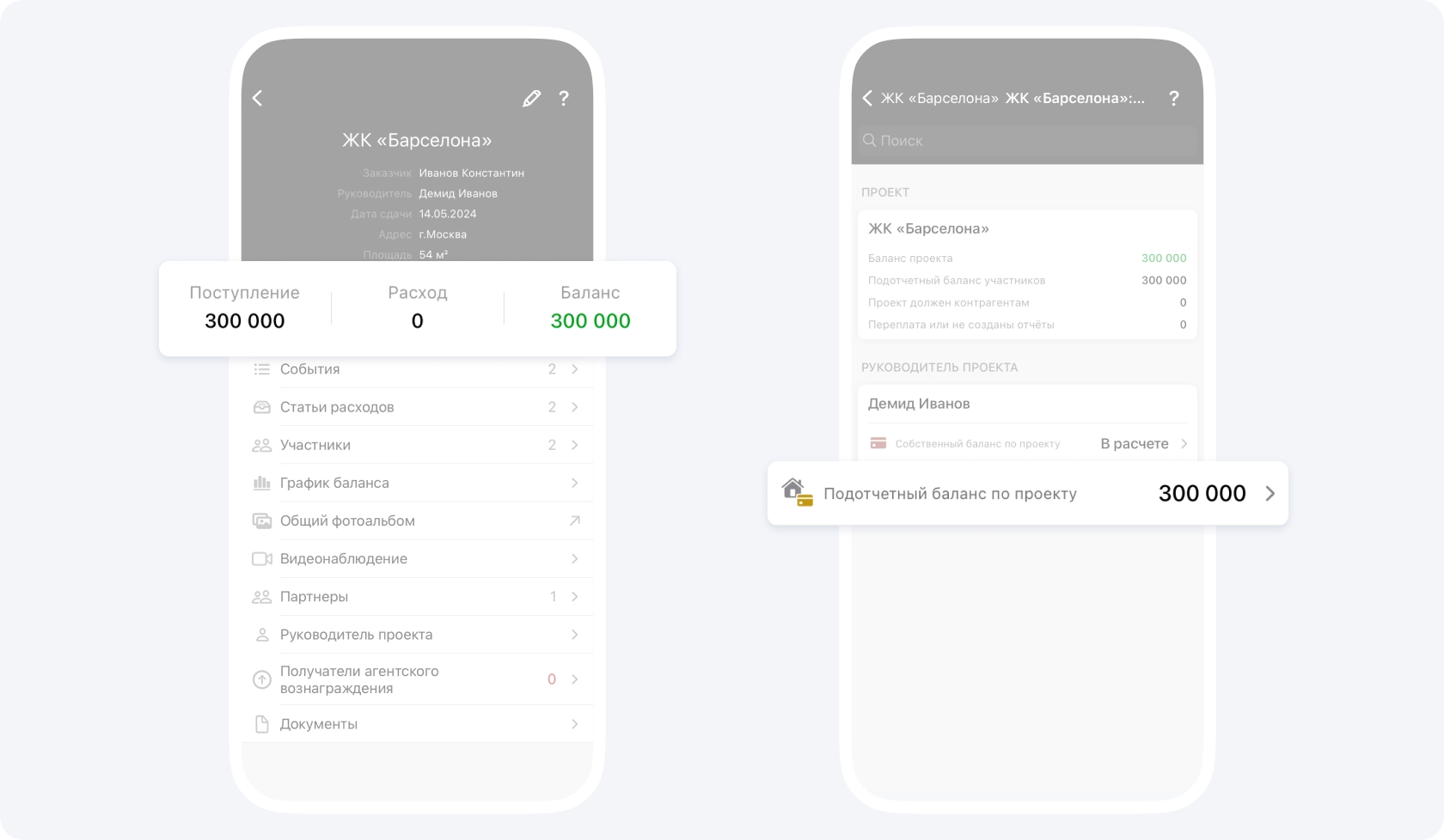 После создания и подтверждения события, сумма денежных средств зачислится на баланс проекта и подотчётный баланс контрагента, который создал событие Поступление.
