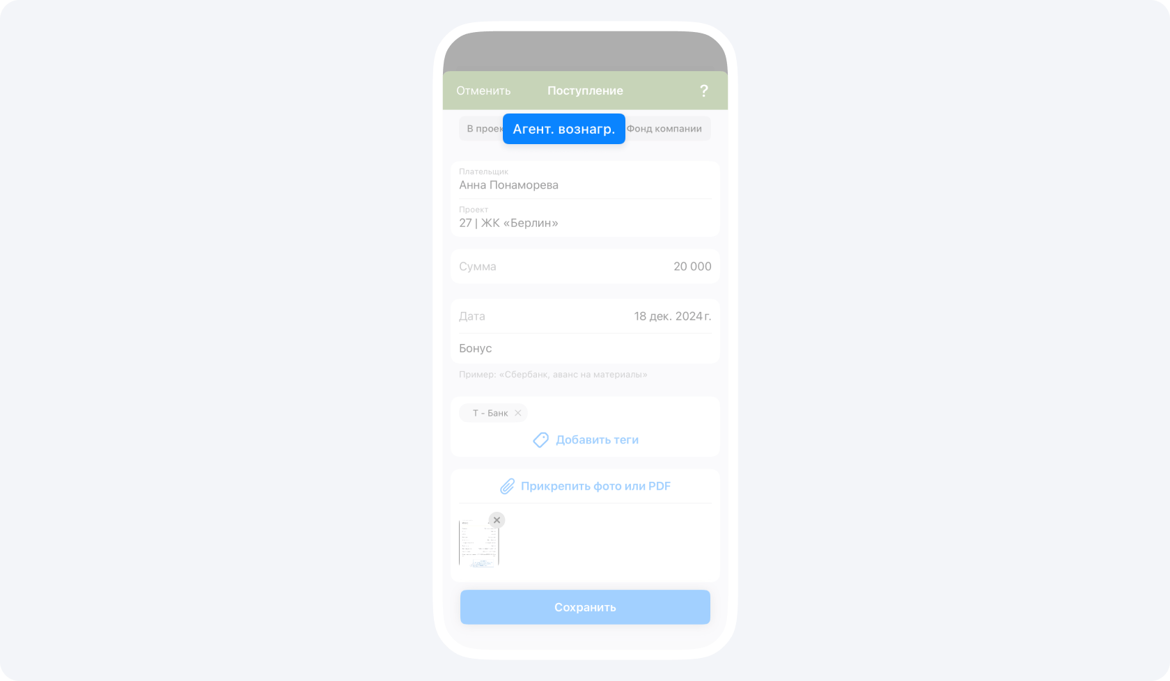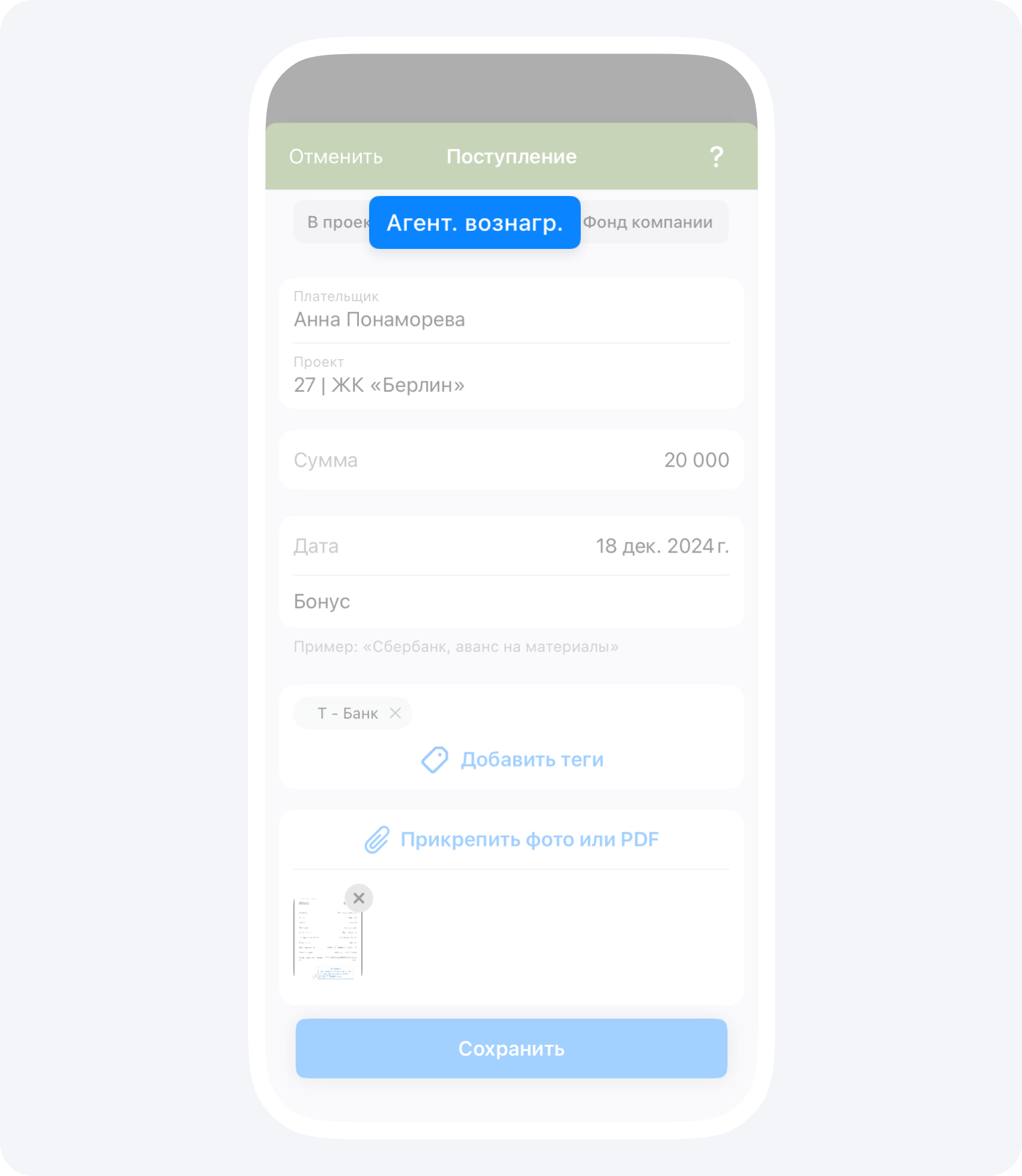 Помимо внесения авансового платежа от заказчика по проекту, с помощью события Поступления вы можете создать Агентское вознаграждение. Для этого, при создании события Поступление необходимо выбрать вкладку Агент. вознагр.