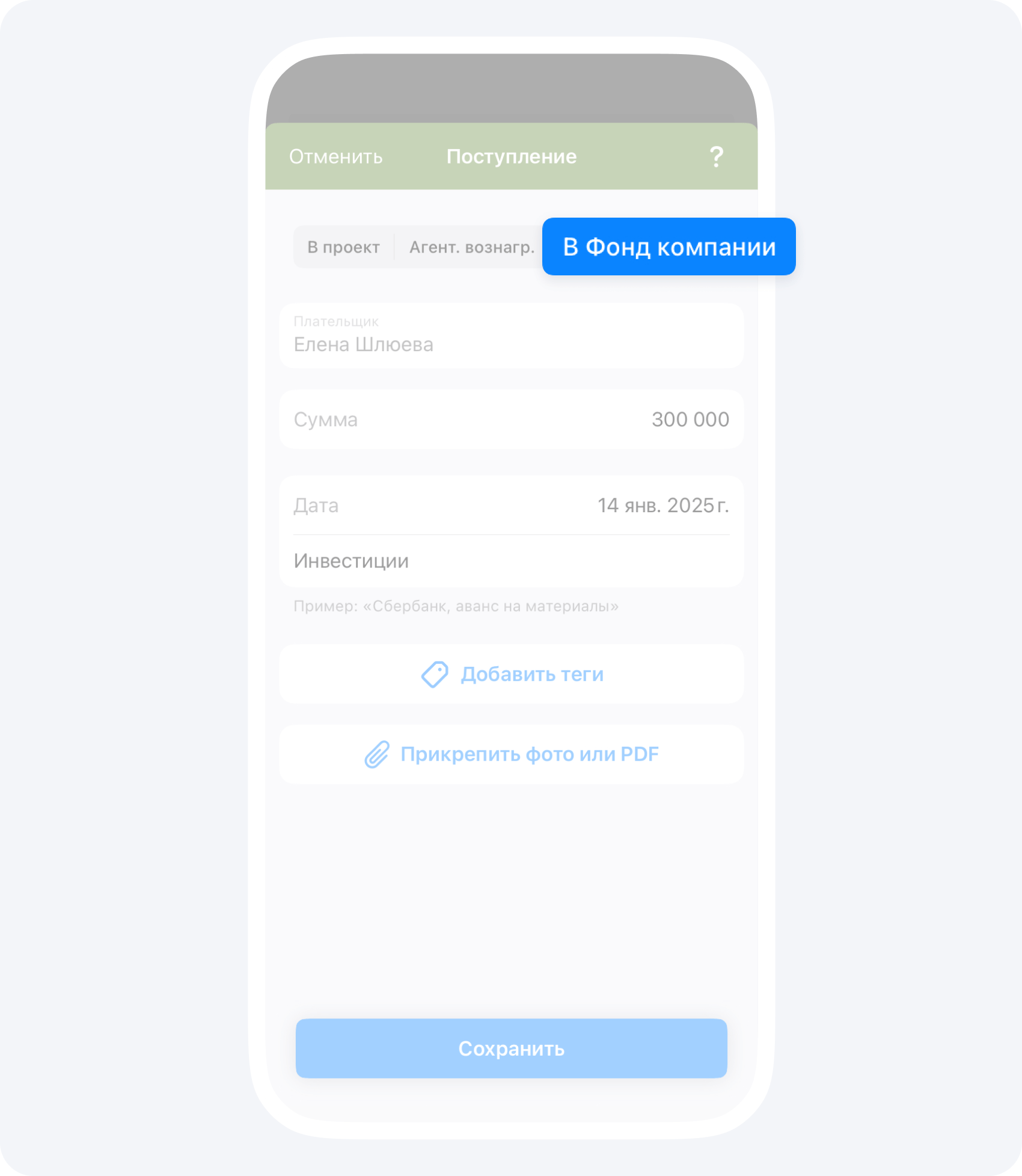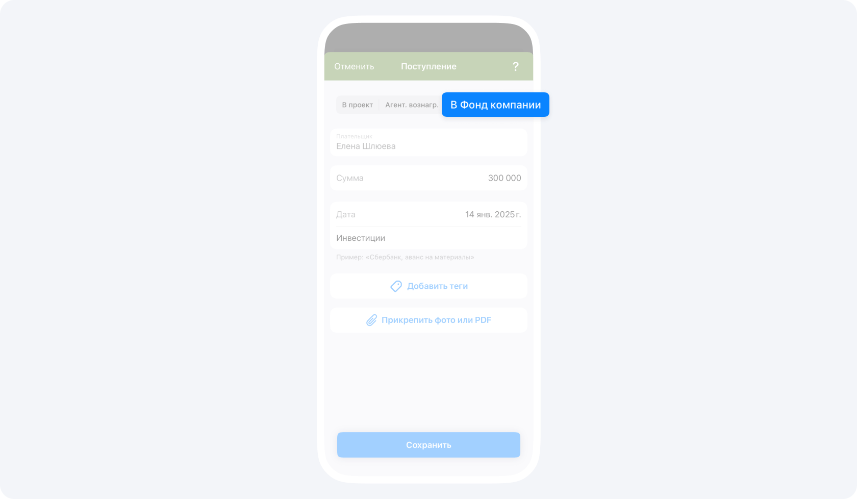 С помощью события Поступление вы можете создать поступление денежных средств в Фонд Компании, для этого при создании события Поступление необходимо выбрать вкладку в Фонд компании.