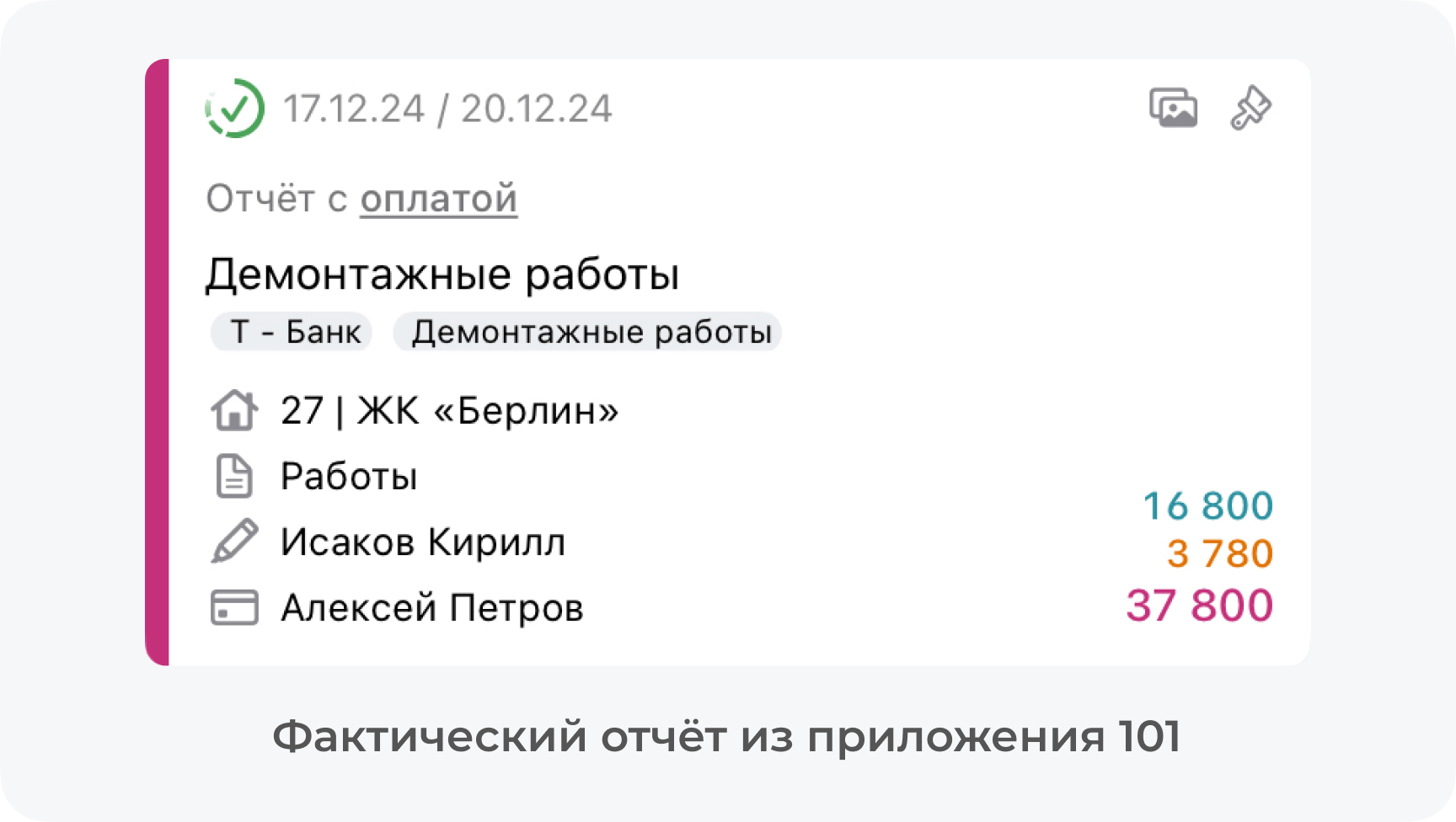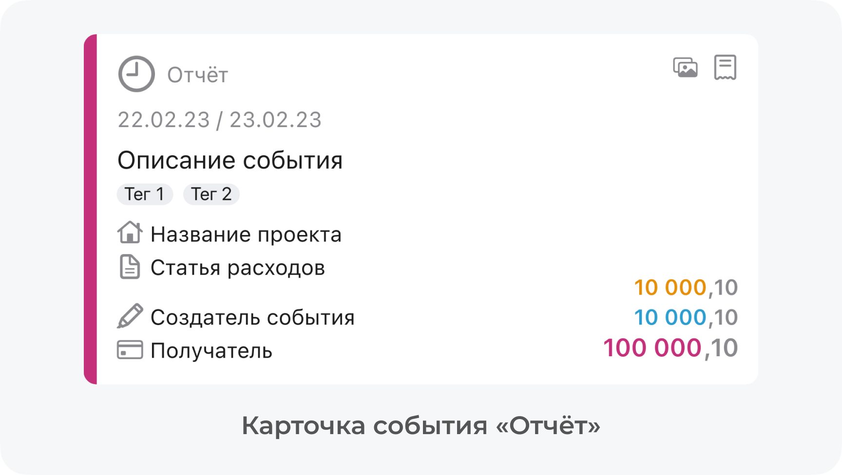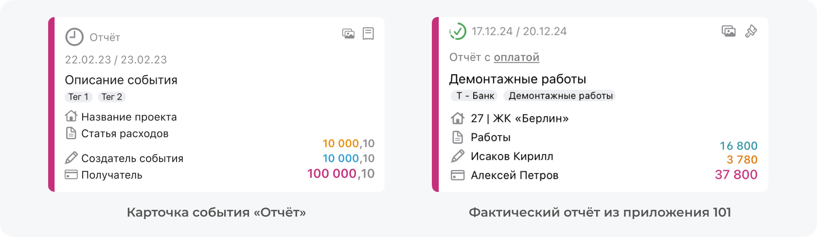 Розовая цифра в событии Отчёт — сумма для заказчика за выполнение работ либо закупку материалов.