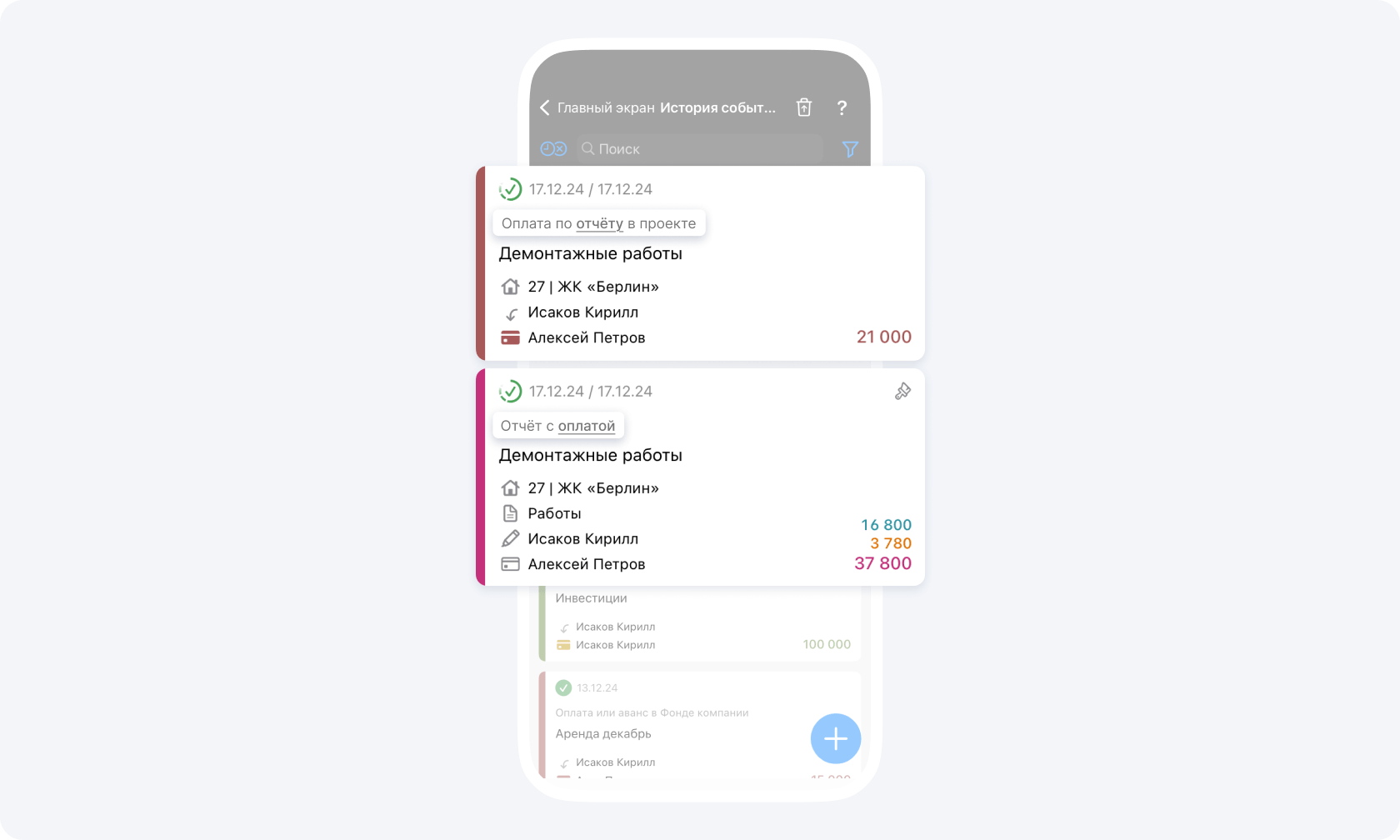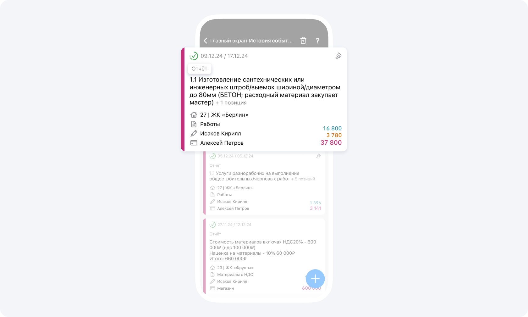 Событие Отчёт — подтверждает для заказчика, что работы выполнены или материалы на его объект закуплены.
