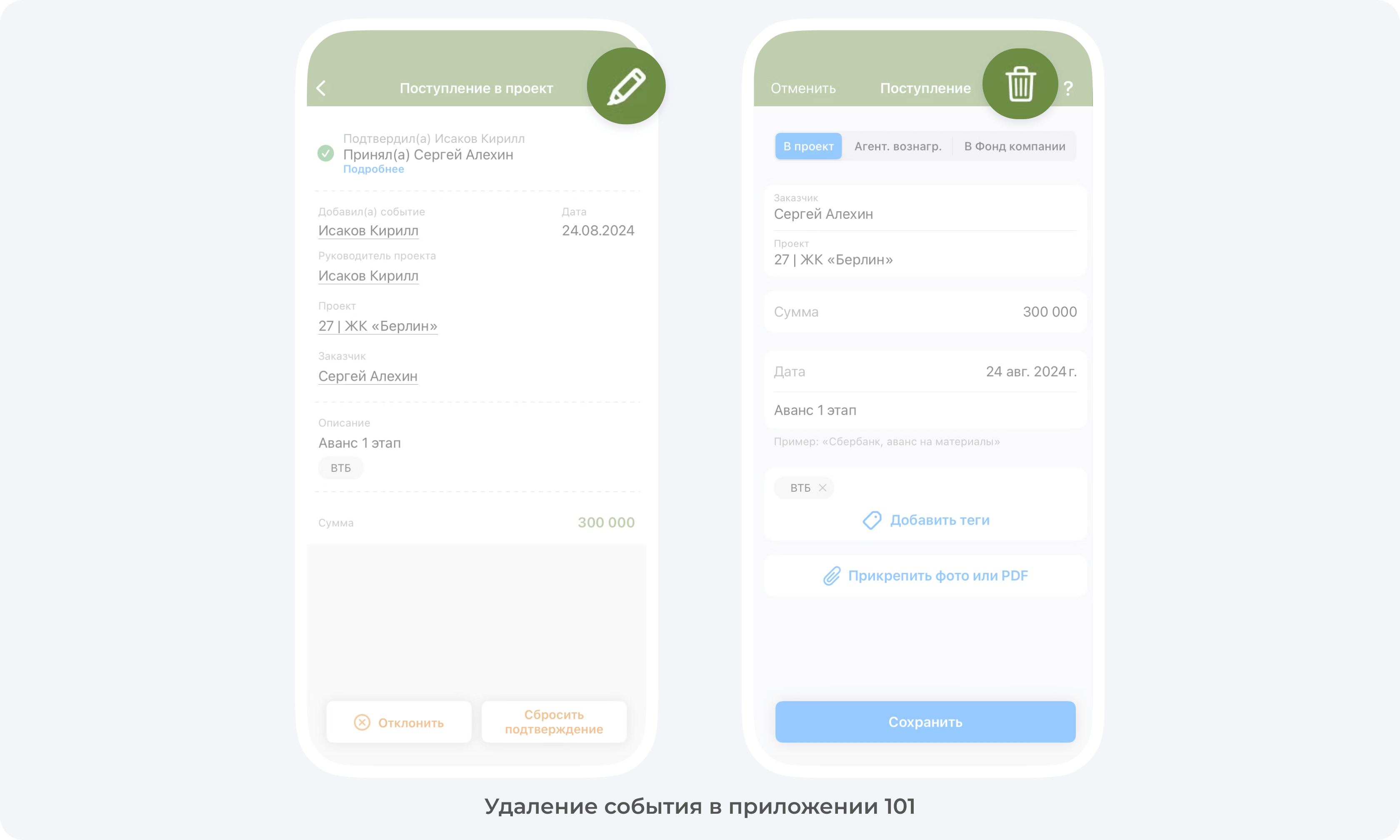 Чтобы удалить событие, зайдите на главном экране в раздел История событий либо в раздел События в карточке проекта.