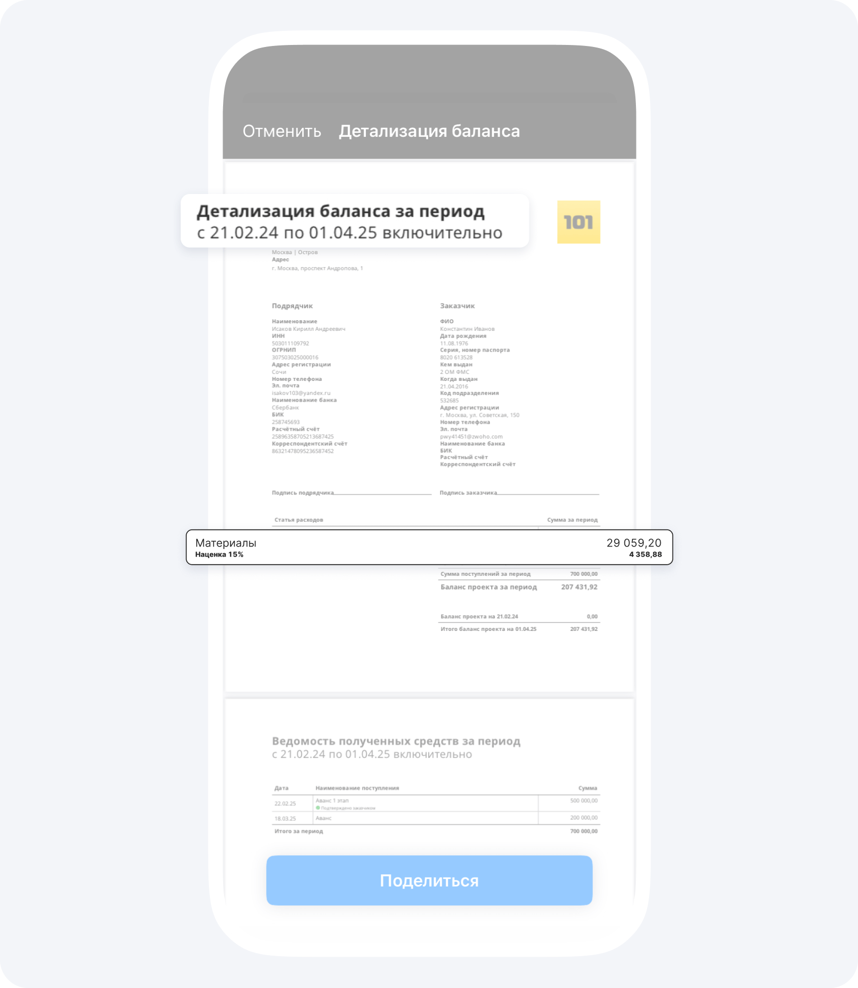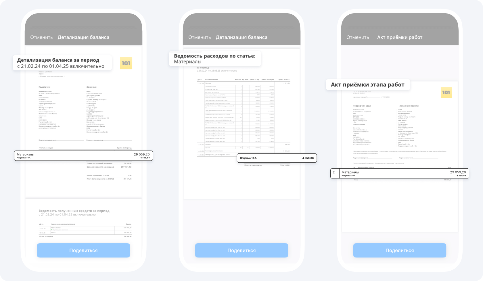 3. В Разделе Документы: в «Детализации баланса по проекту», «Ведомости расходов по статье», «Акте приемки работ»