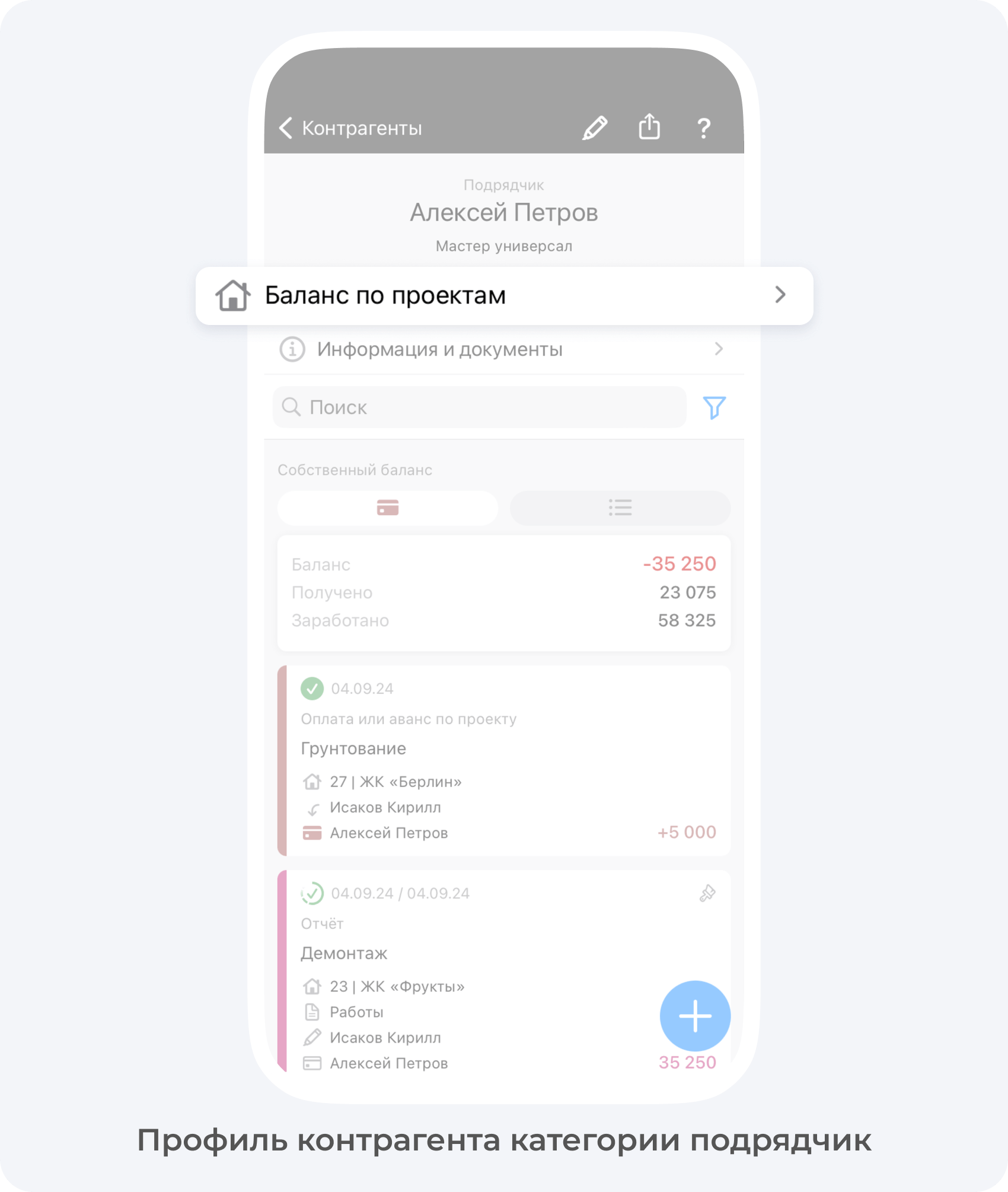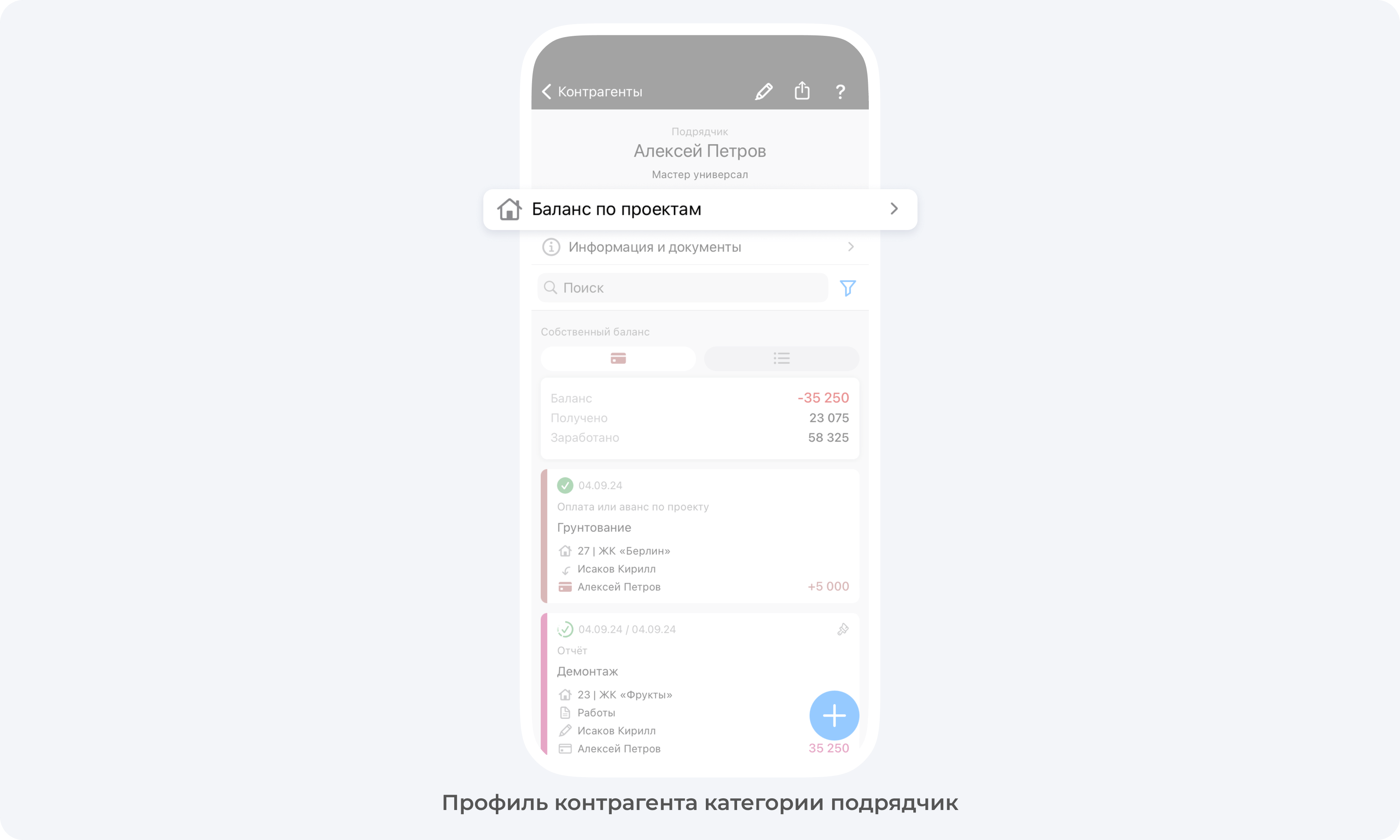 В данном разделе отображается перечень всех проектов, по которым данный контрагент отчитывался за выполнение работ или закупку материалов, а также актуальный баланс контрагента по каждому проекту.