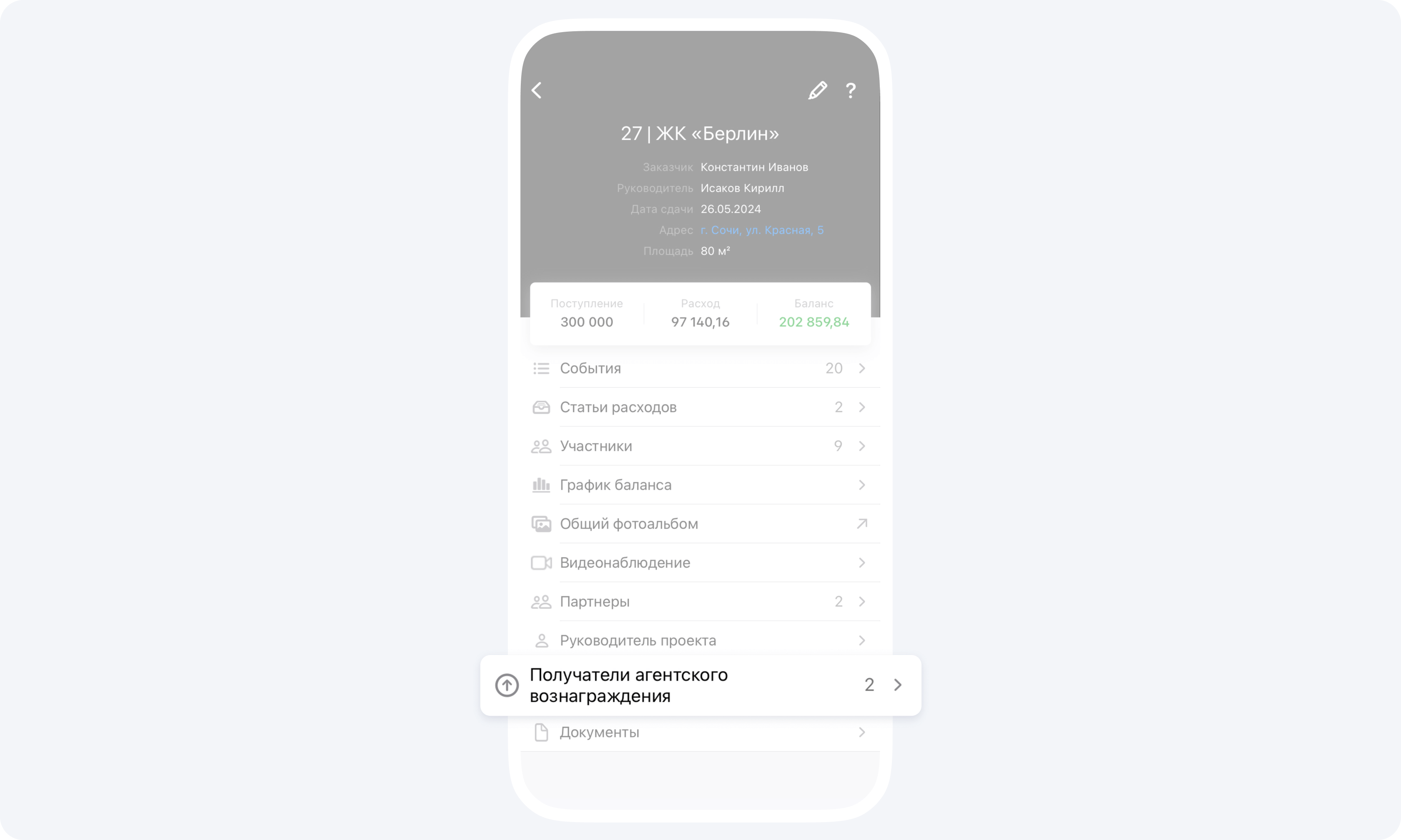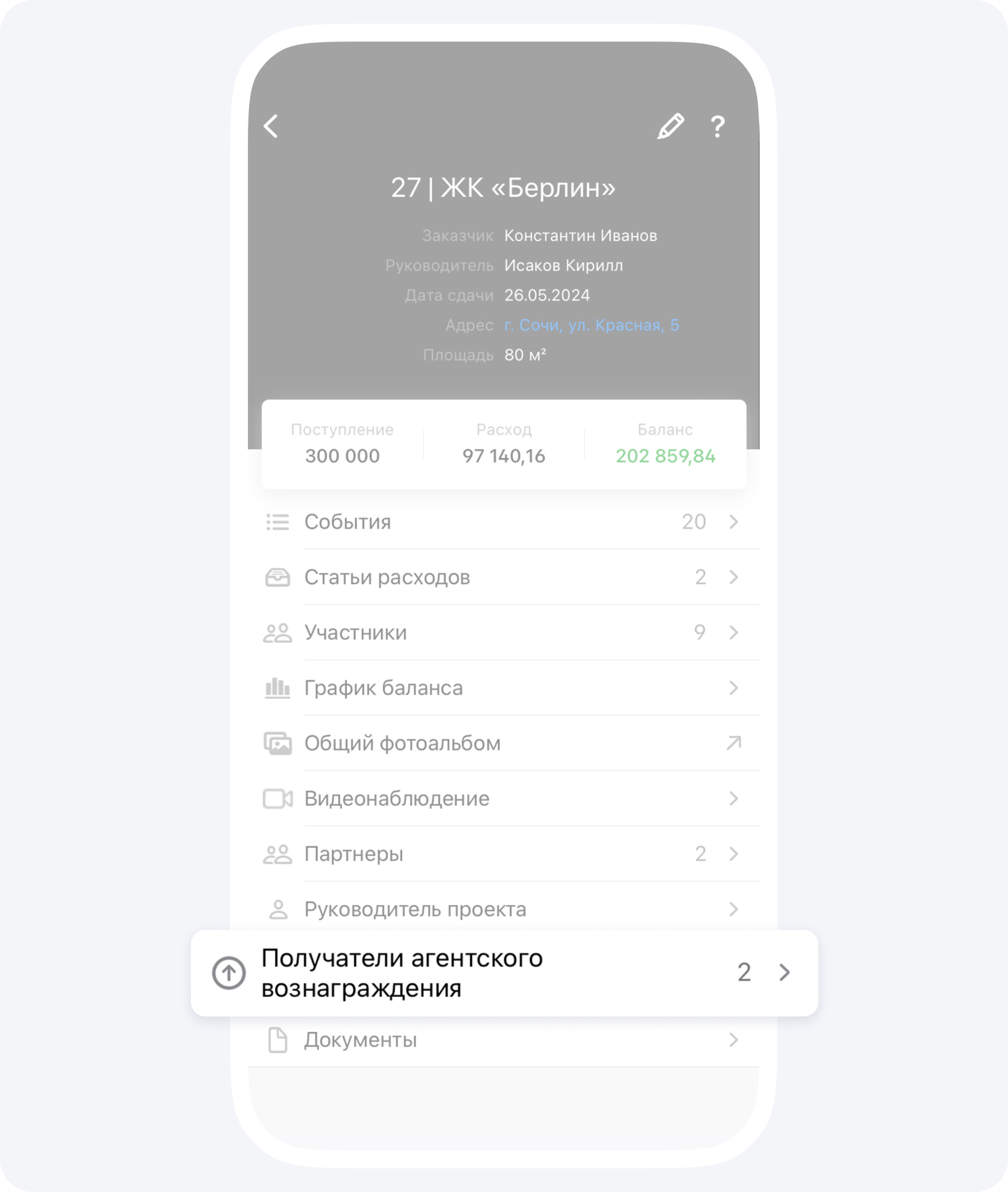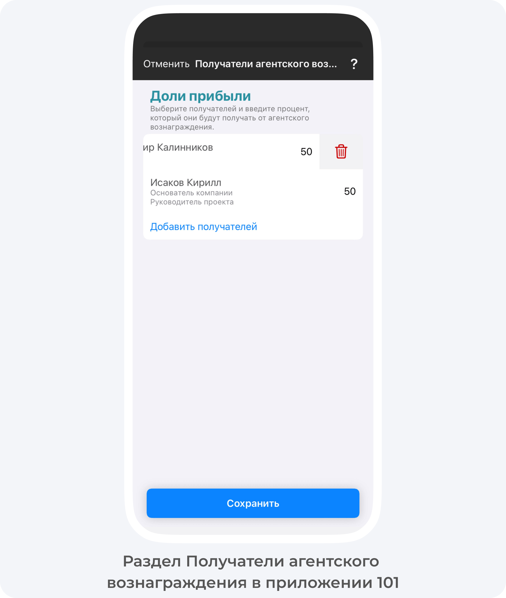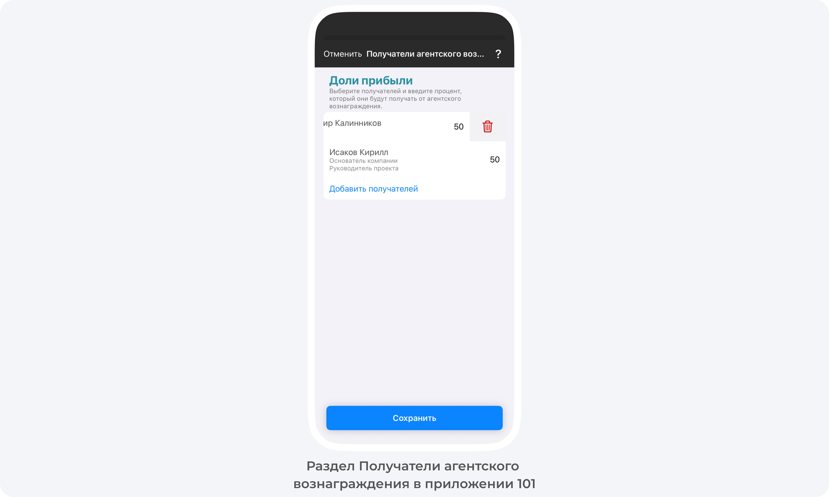 1. Зайдите в раздел Проекты и выберите проект 2. В карточке проекта зайдите в раздел Получатели агентского вознаграждения 3. Нажмите в поле Добавить получателей, выберите контрагента из списка, если необходимого контрагента нет, добавьте нового контрагента. Укажите процент, который он будет получать