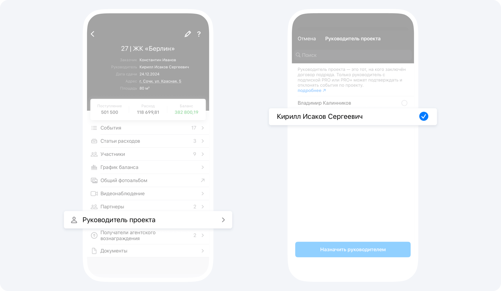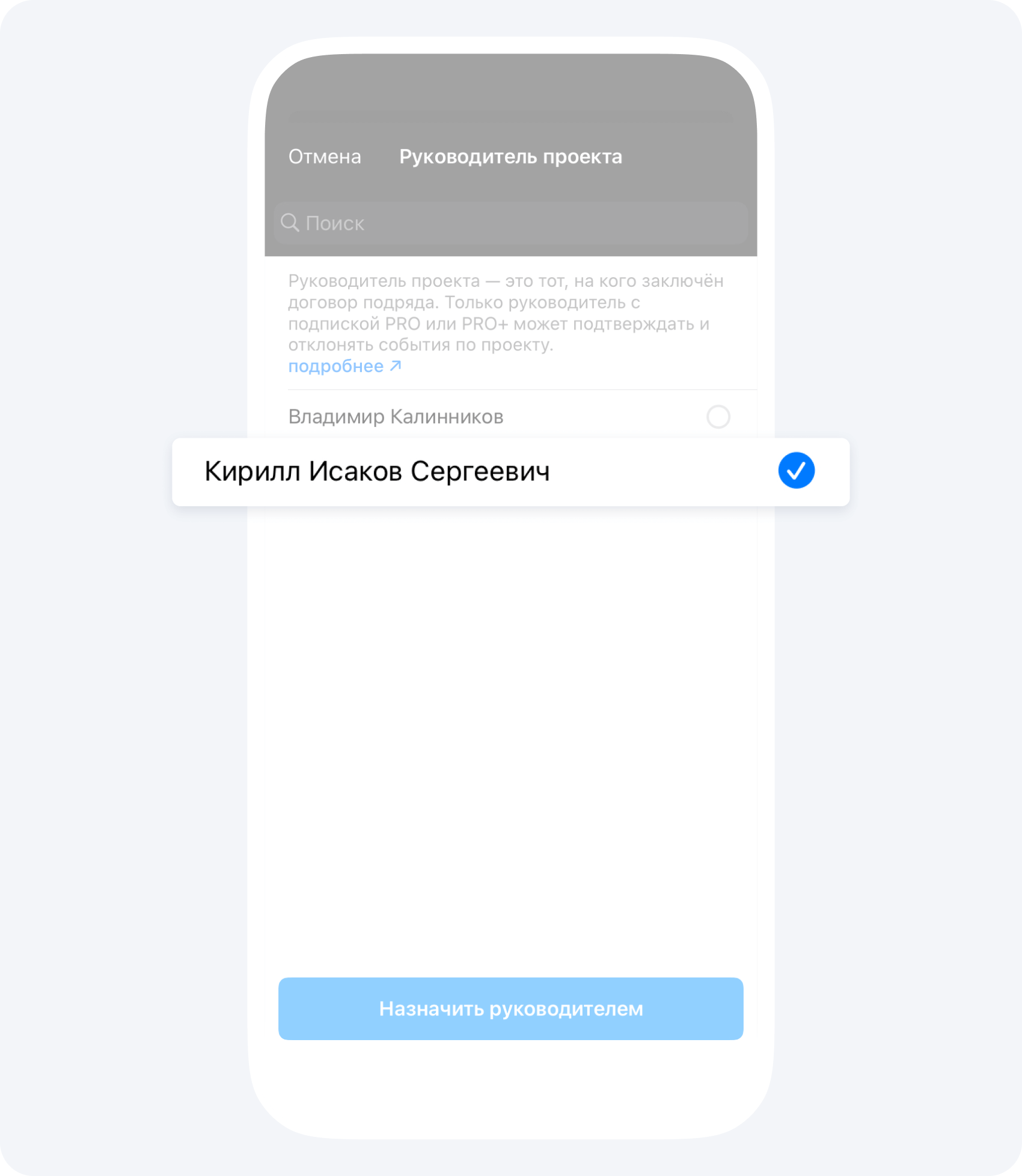 Чтобы назначить Руководителя проекта:
