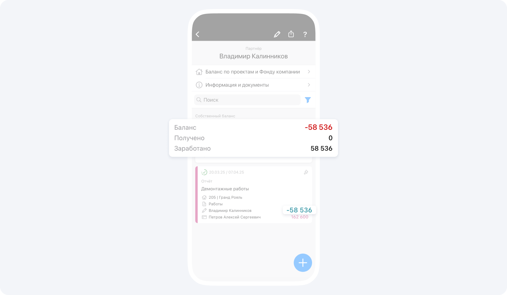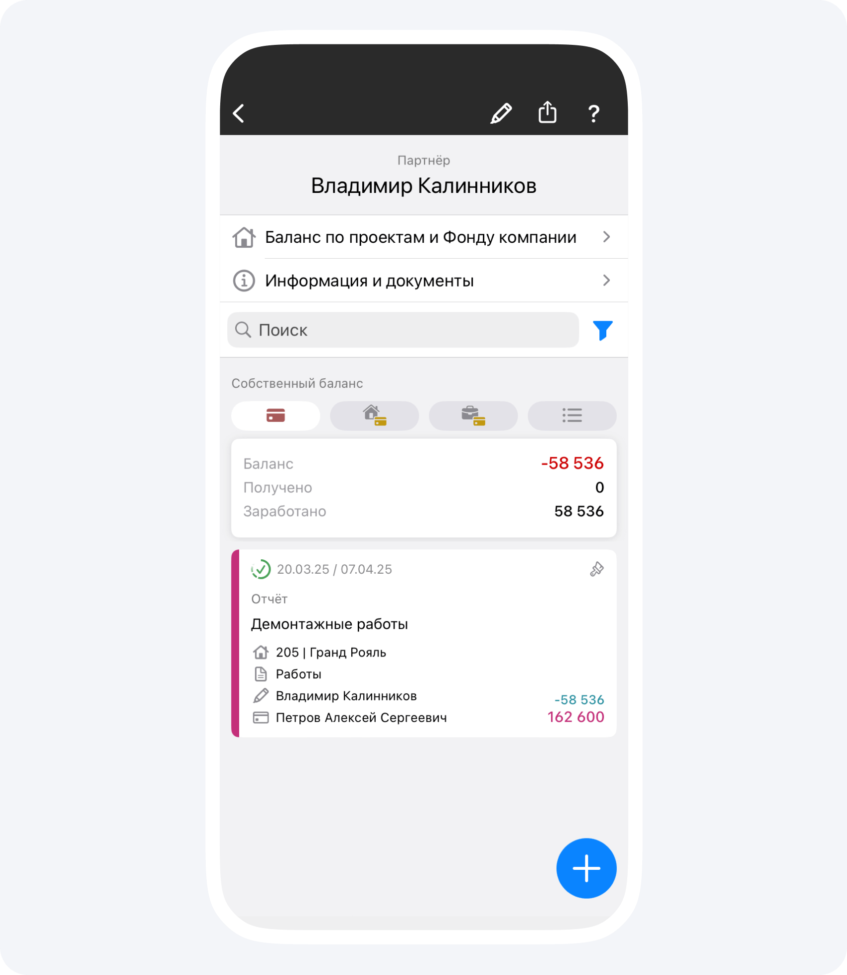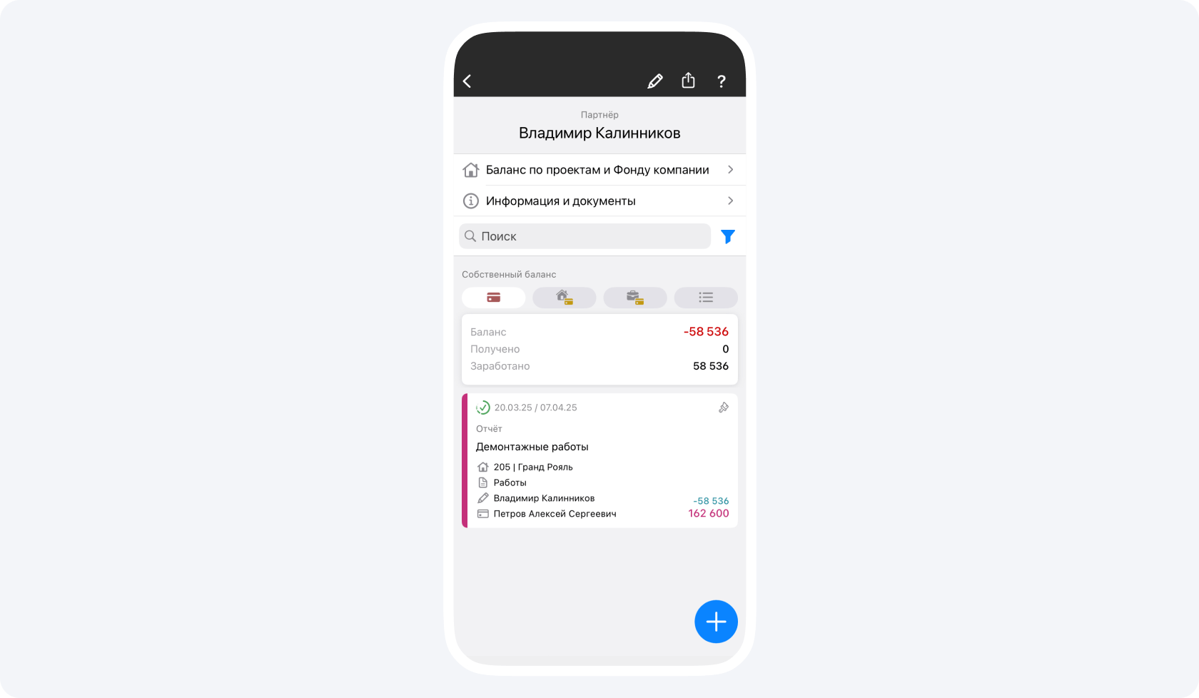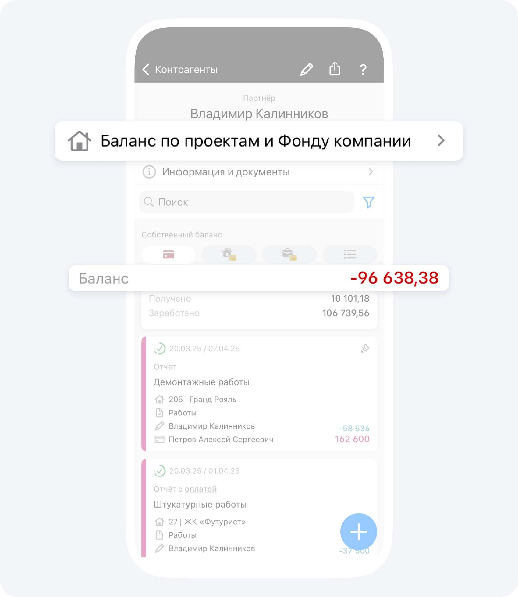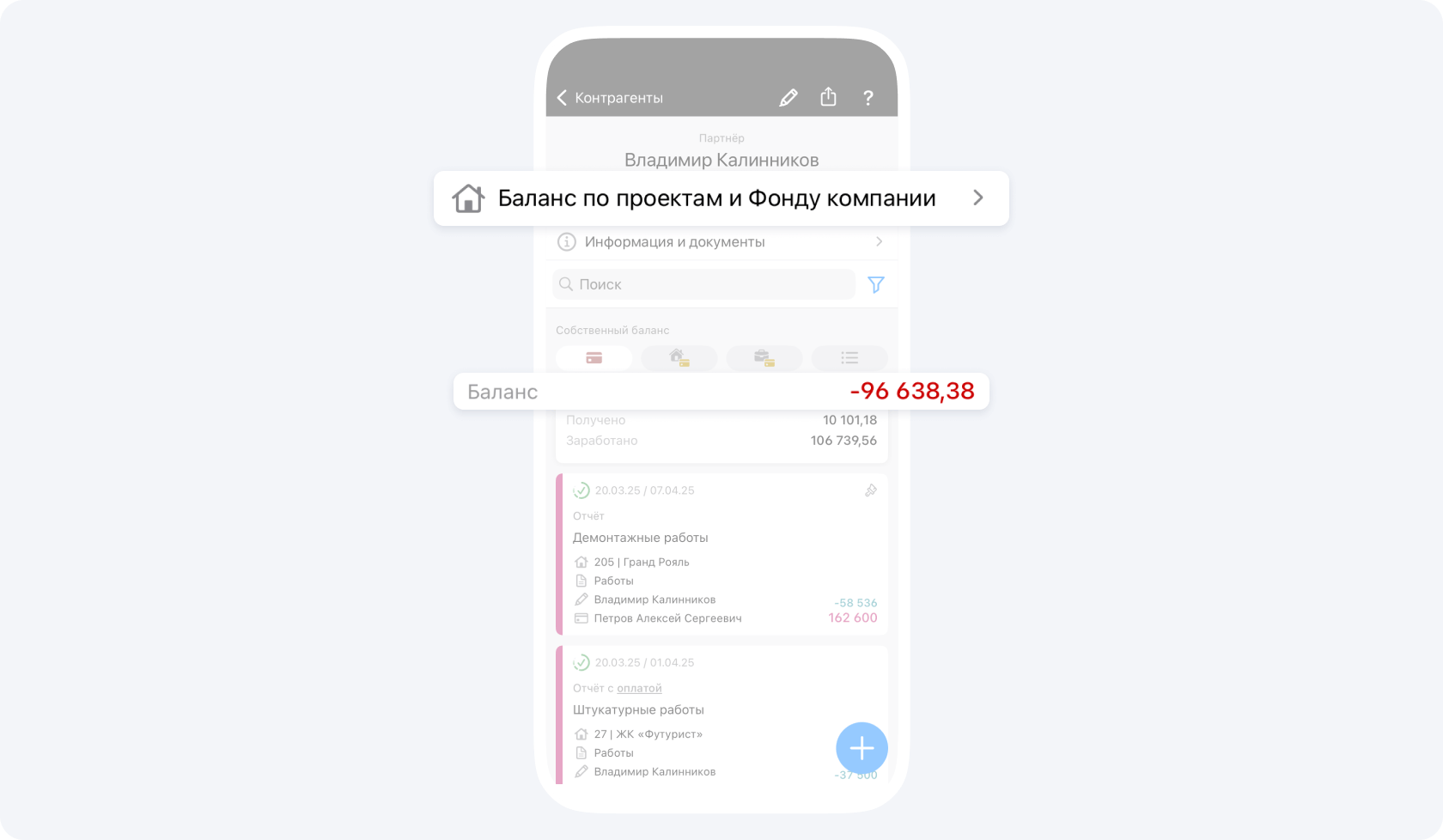 На данном экране вы видите общий баланс контрагента по всем проектам, в которых он участвует.