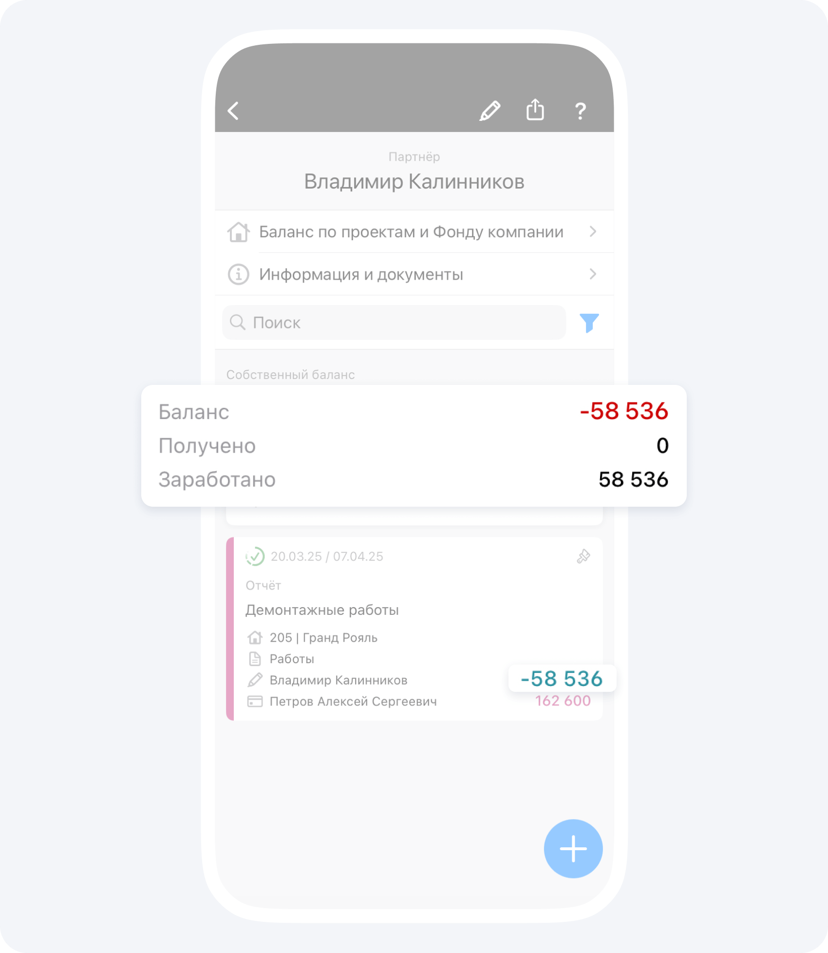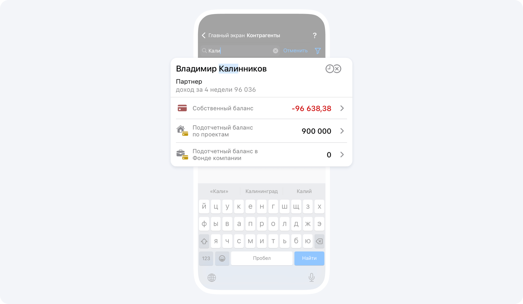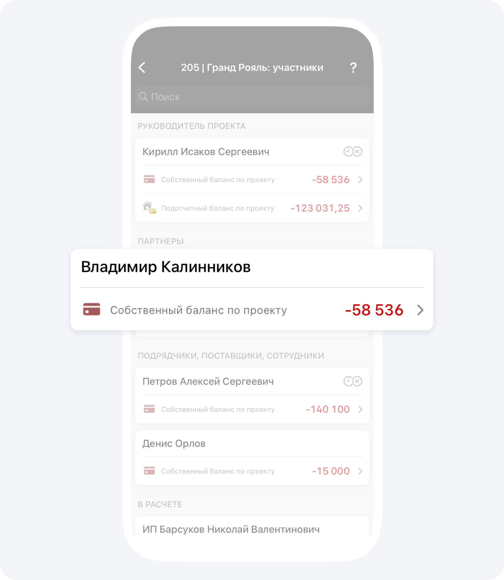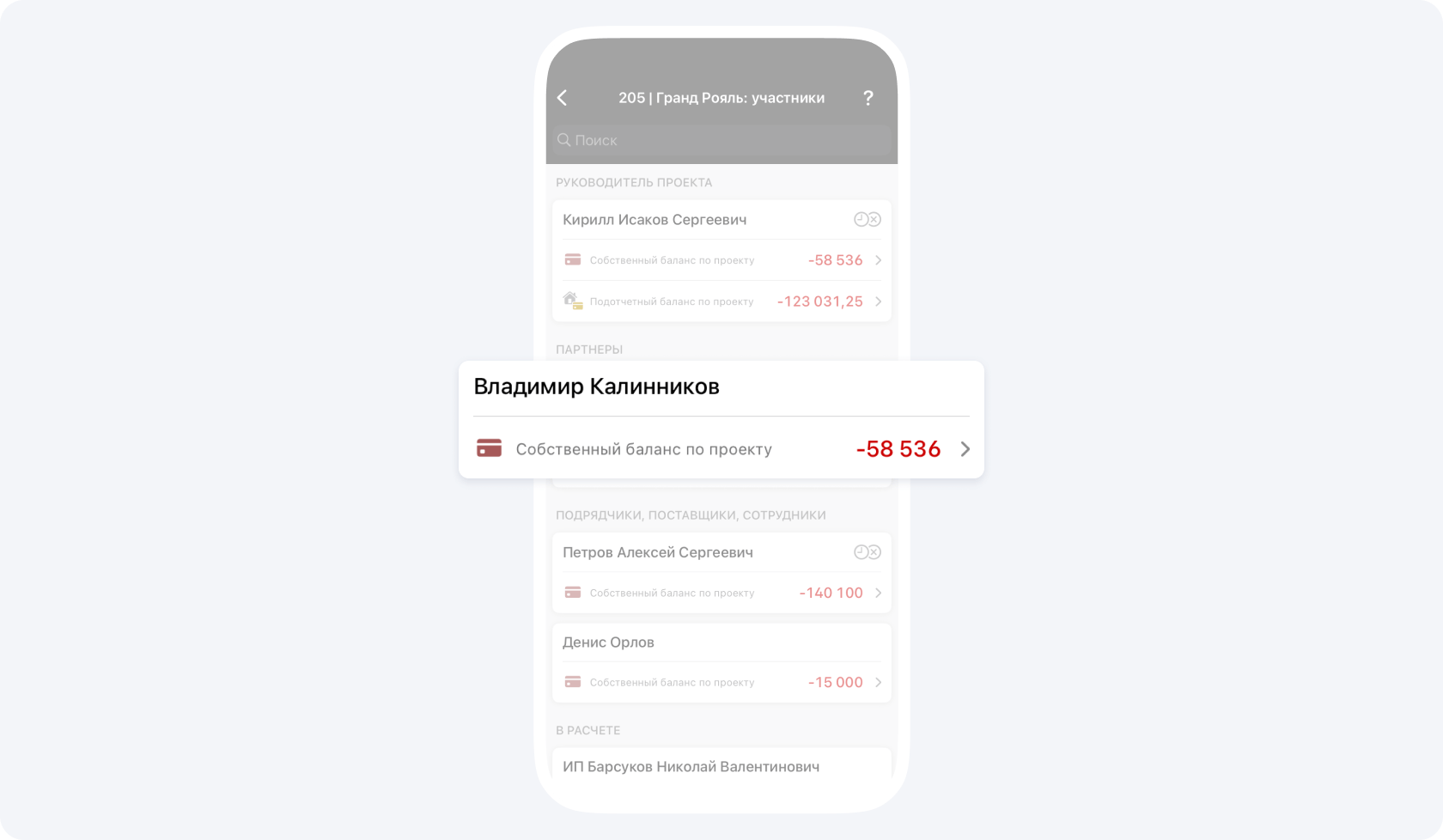 На данном экране вы видите общий баланс контрагента по всем проектам, в которых он участвует.