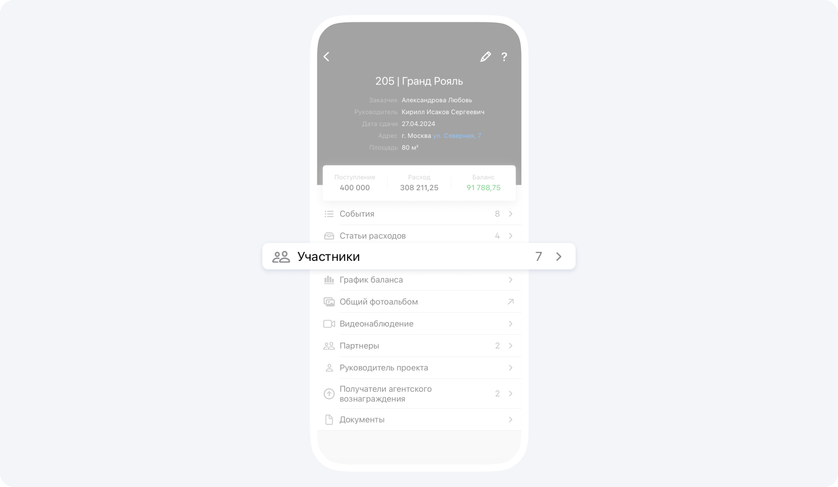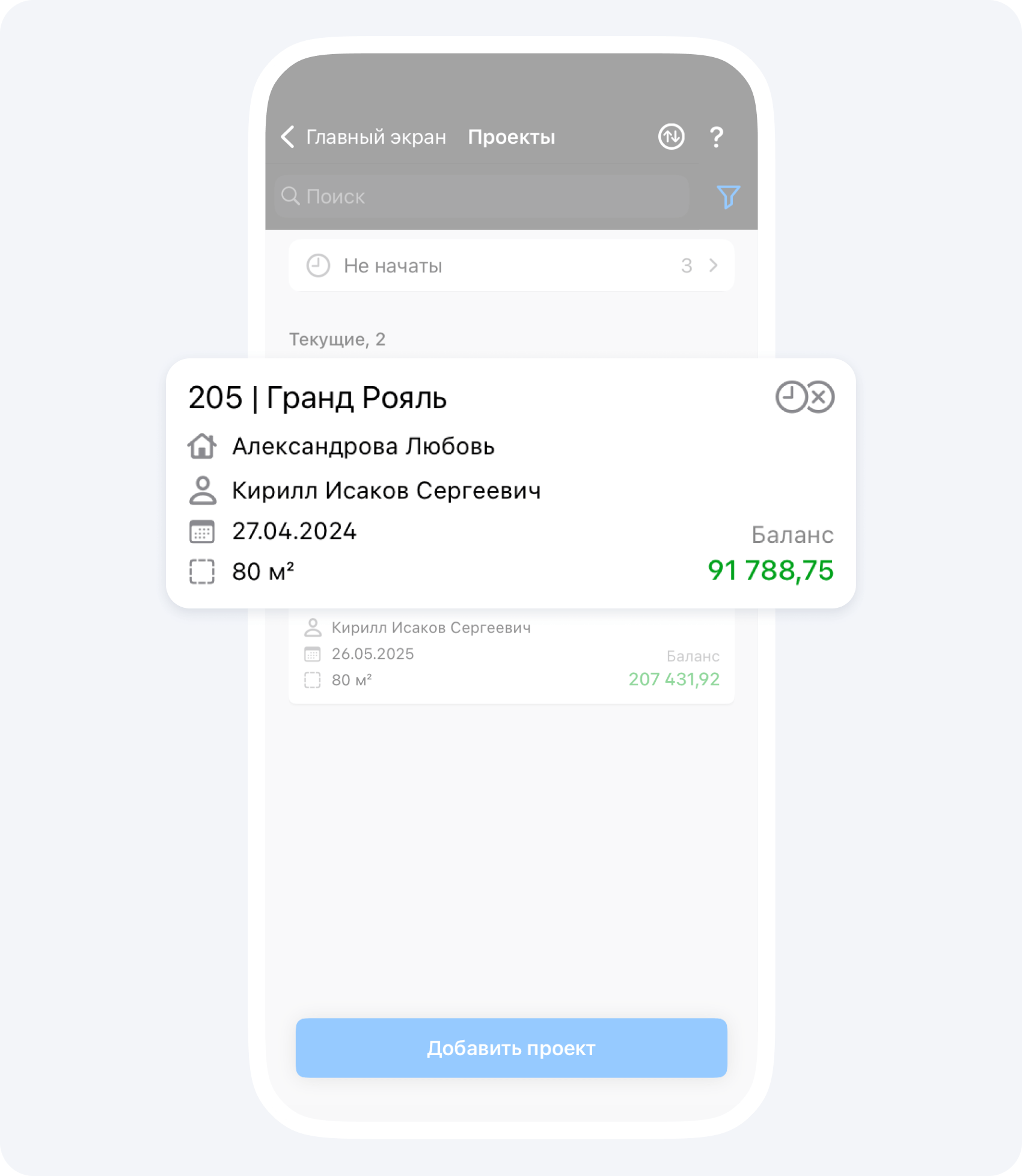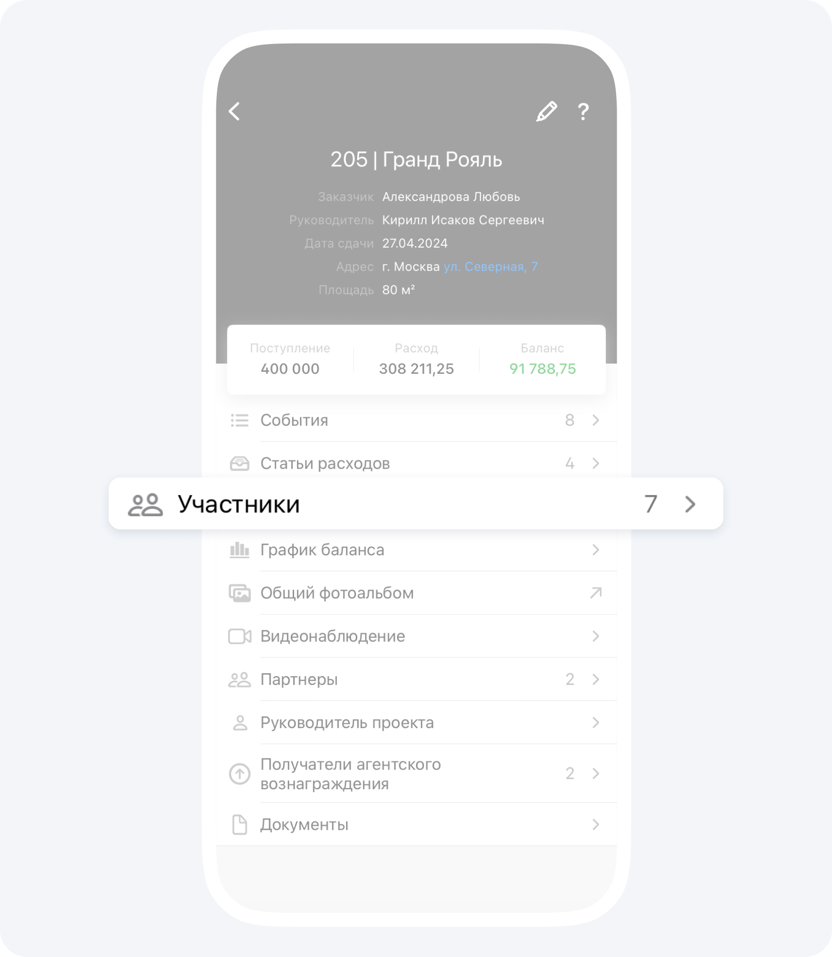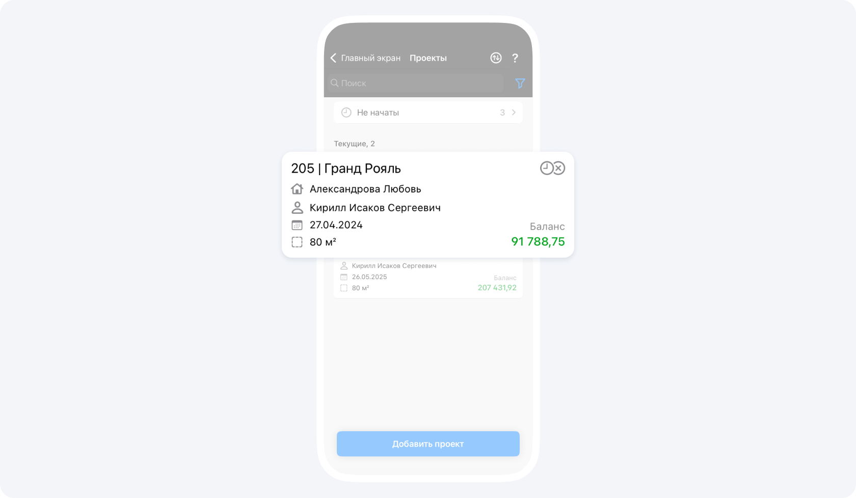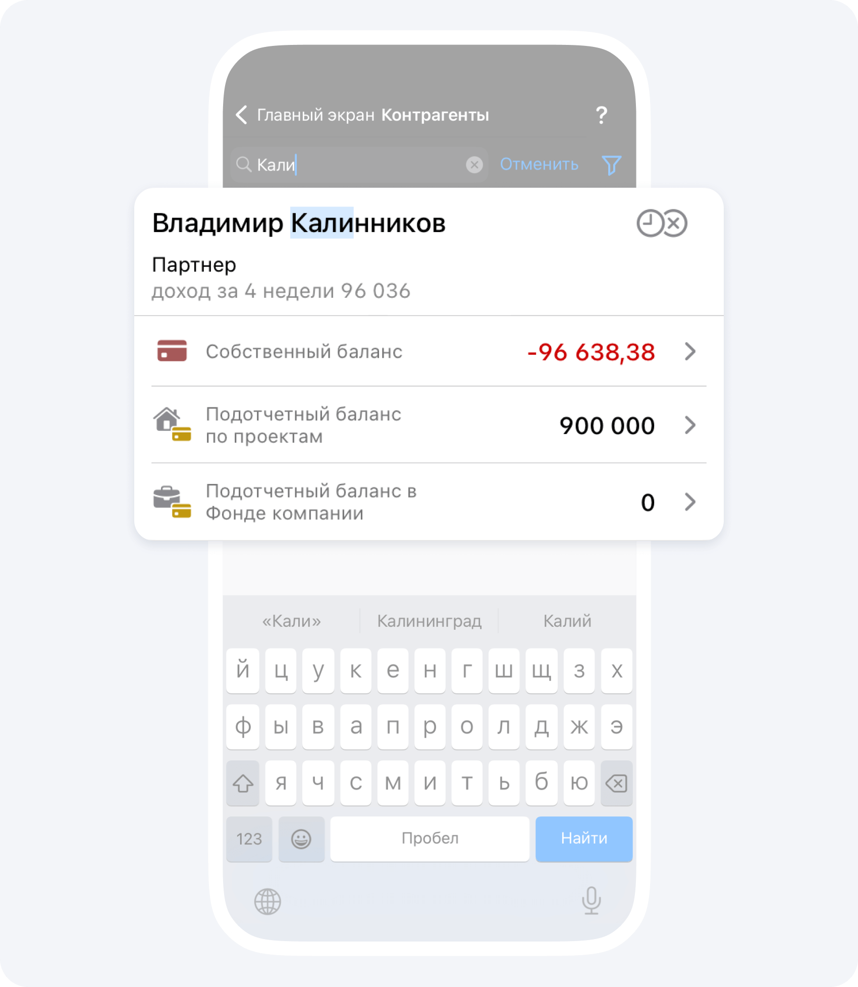 На данном экране вы видите общий баланс контрагента по всем проектам, в которых он участвует.