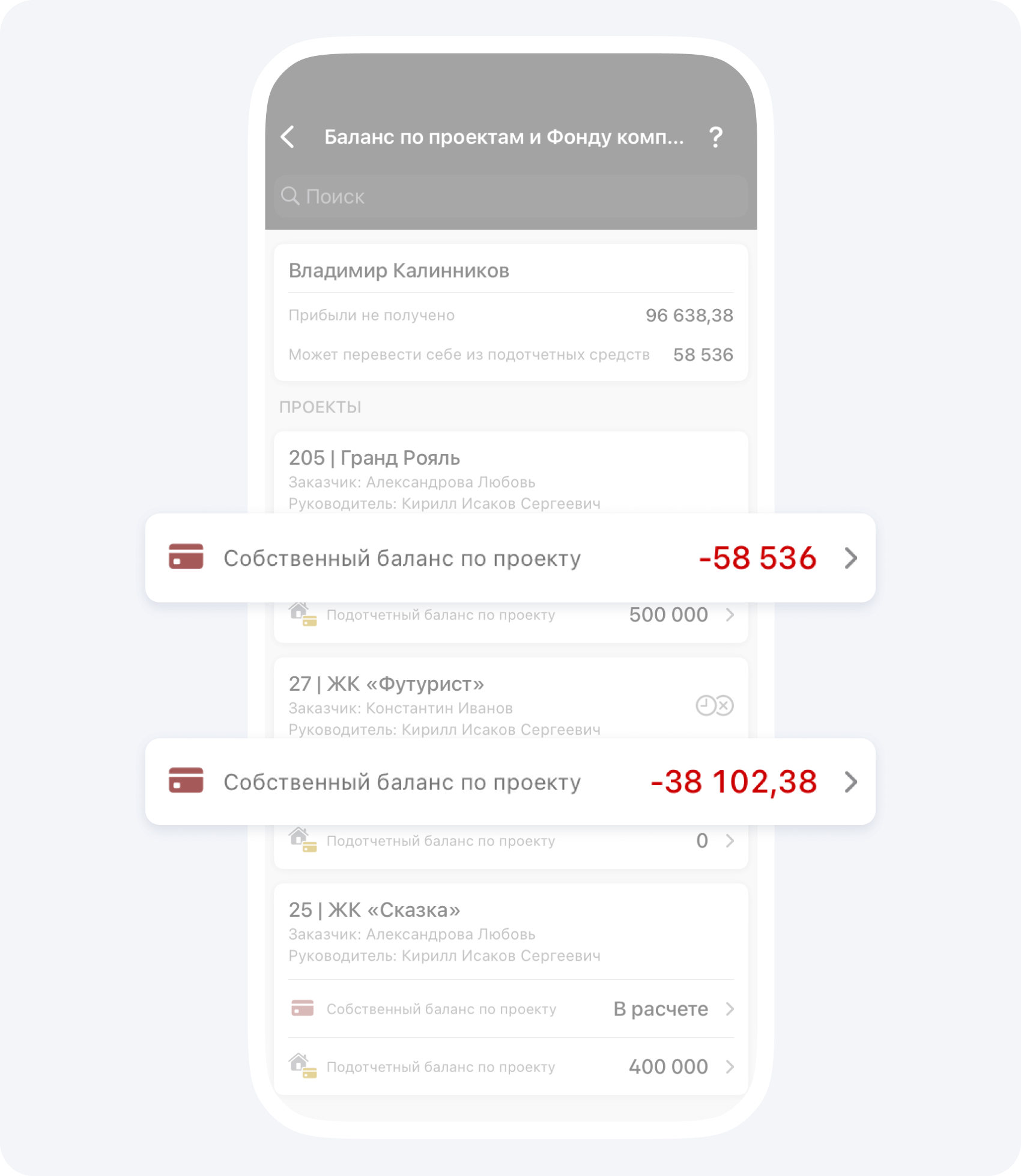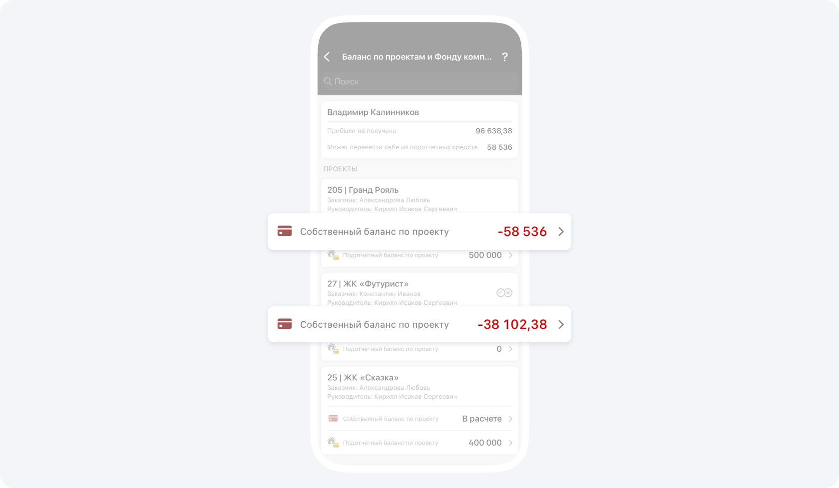 Чтобы узнать баланс контрагента по конкретному проекту зайдите в раздел Баланс по проектам и Фонду компании и выберите интересующий вас проект.