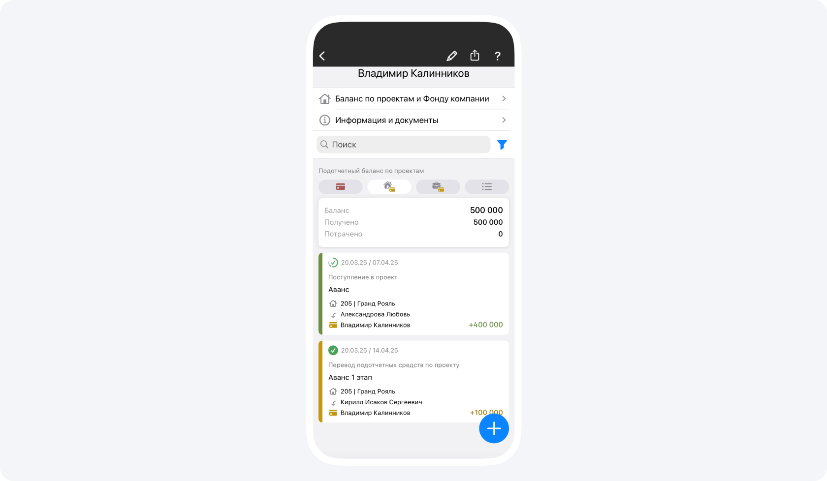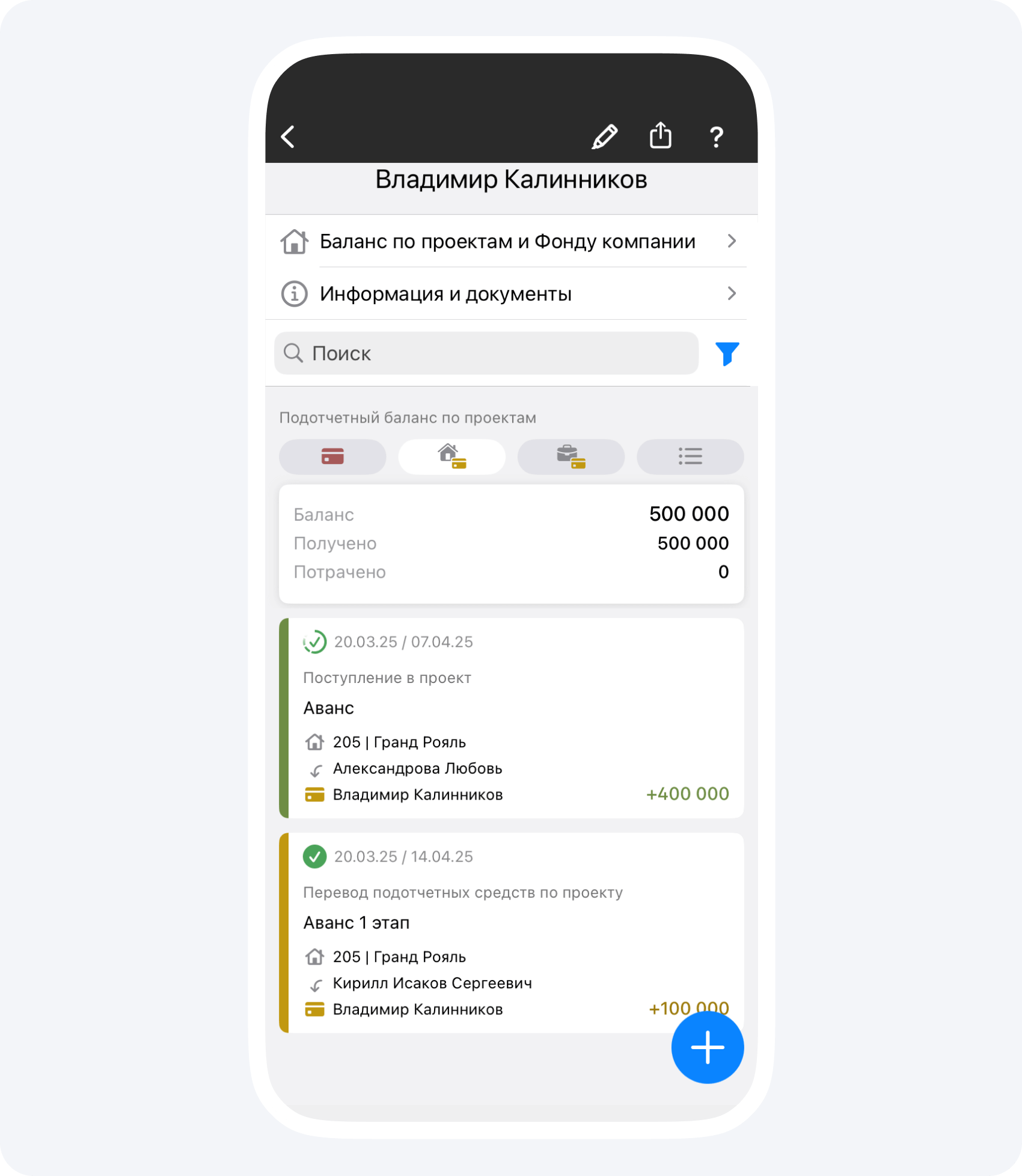 - Получено — сумма всех переводов и поступлений вам в подотчет по проекту