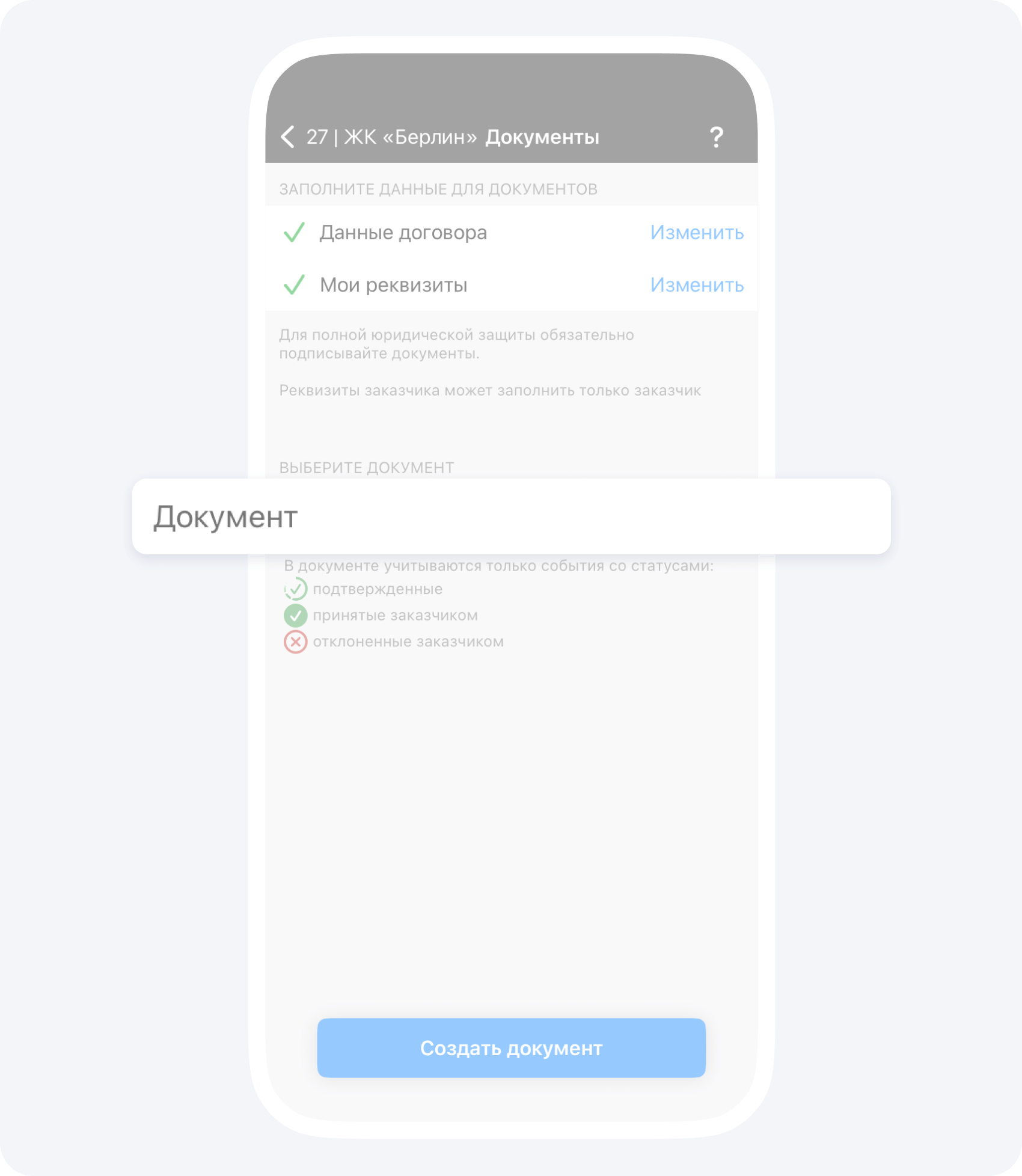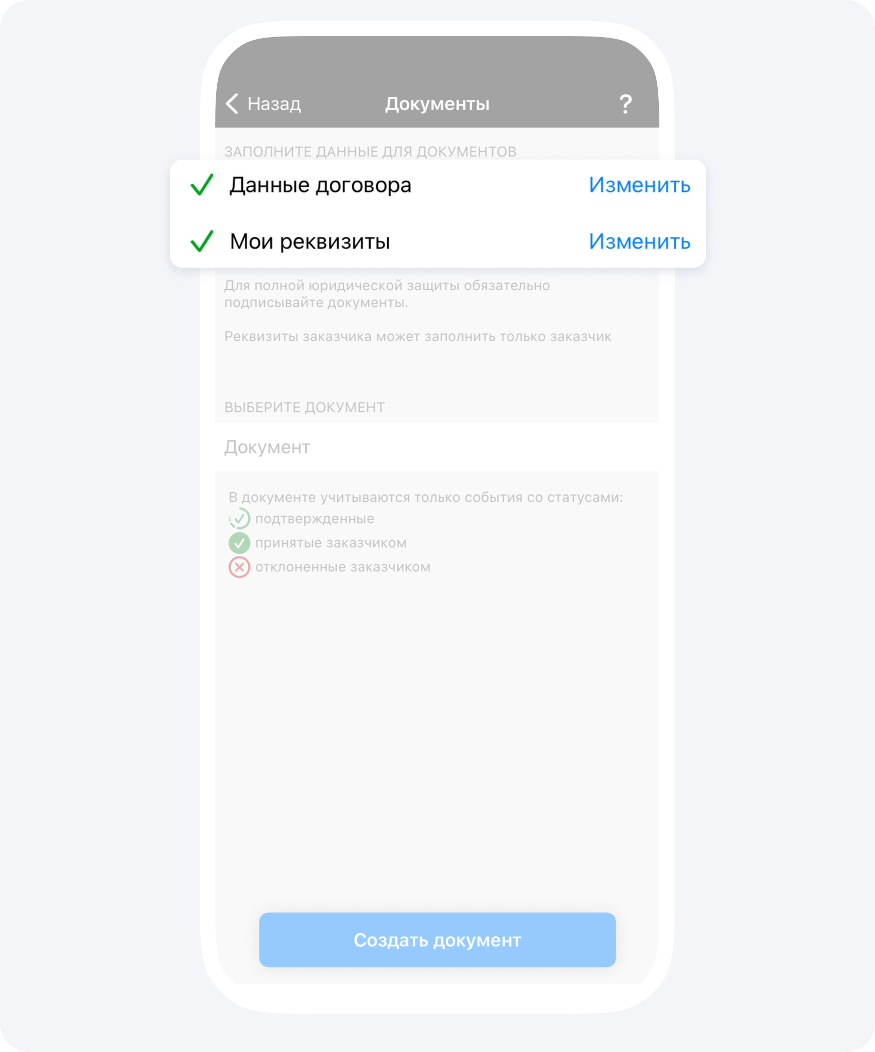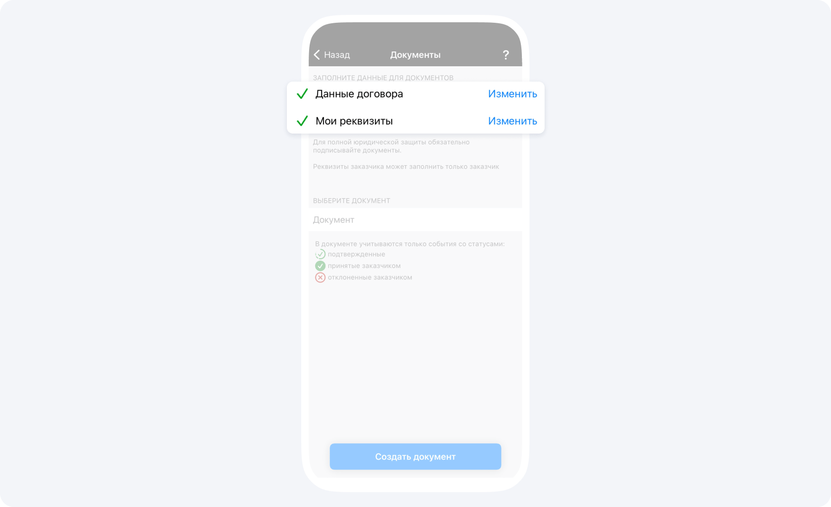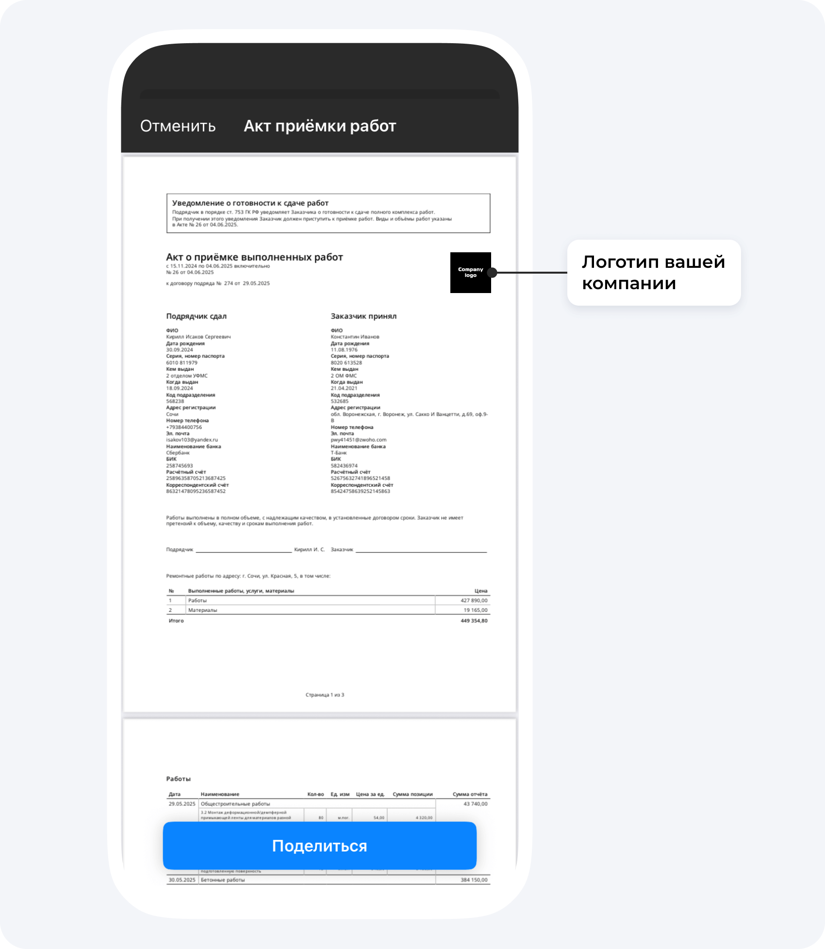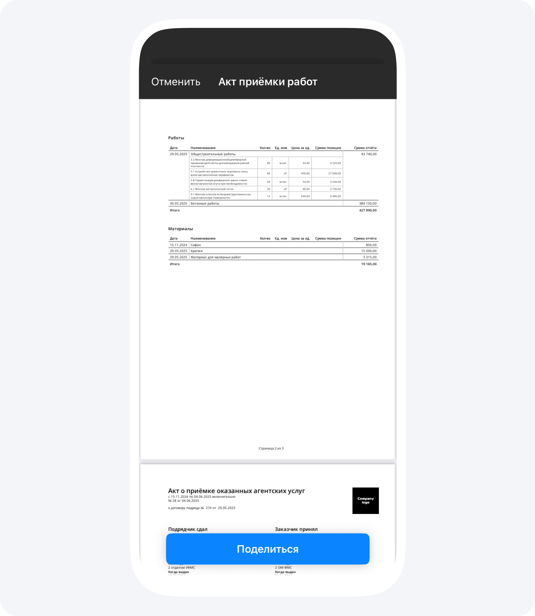Чтобы отправить документ заказчику, нажмите кнопку Поделиться и в открывшемся окне выберите удобный мессенджер.
