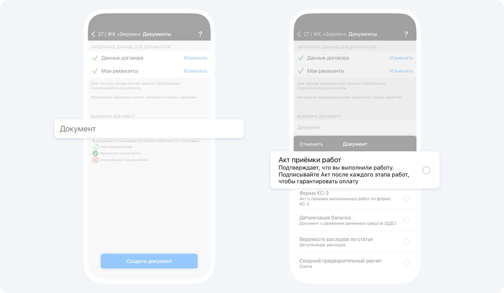 - Нажмите в поле Документ, в открывшемся окне выберите Акт приёмки работ.