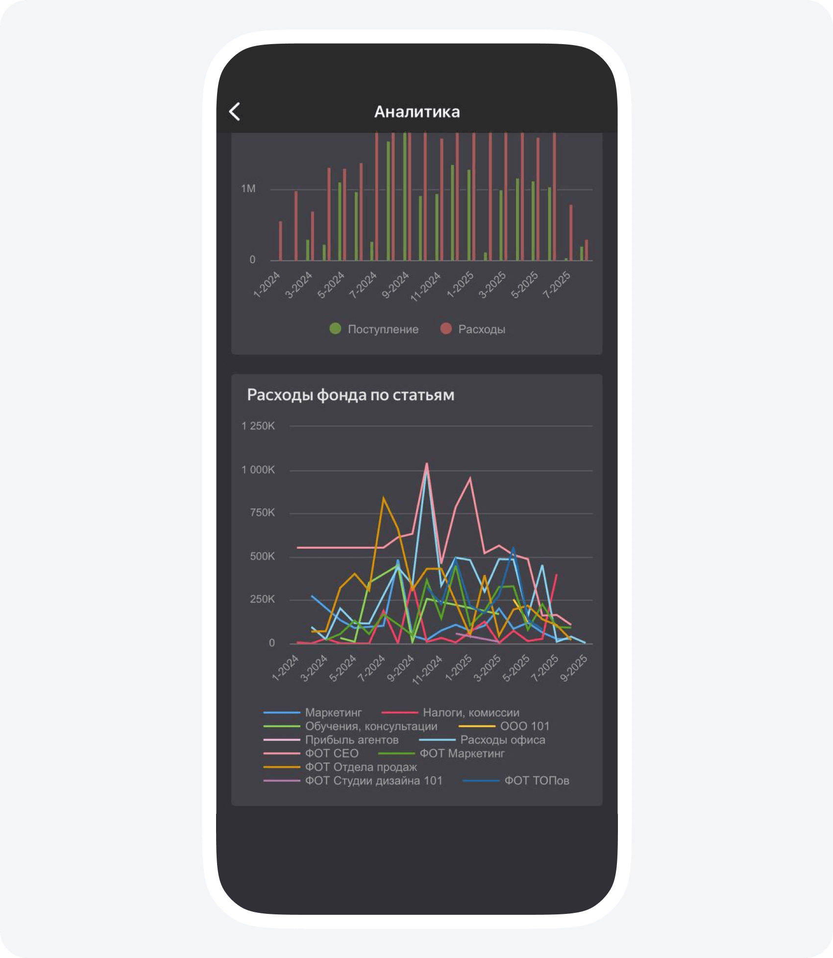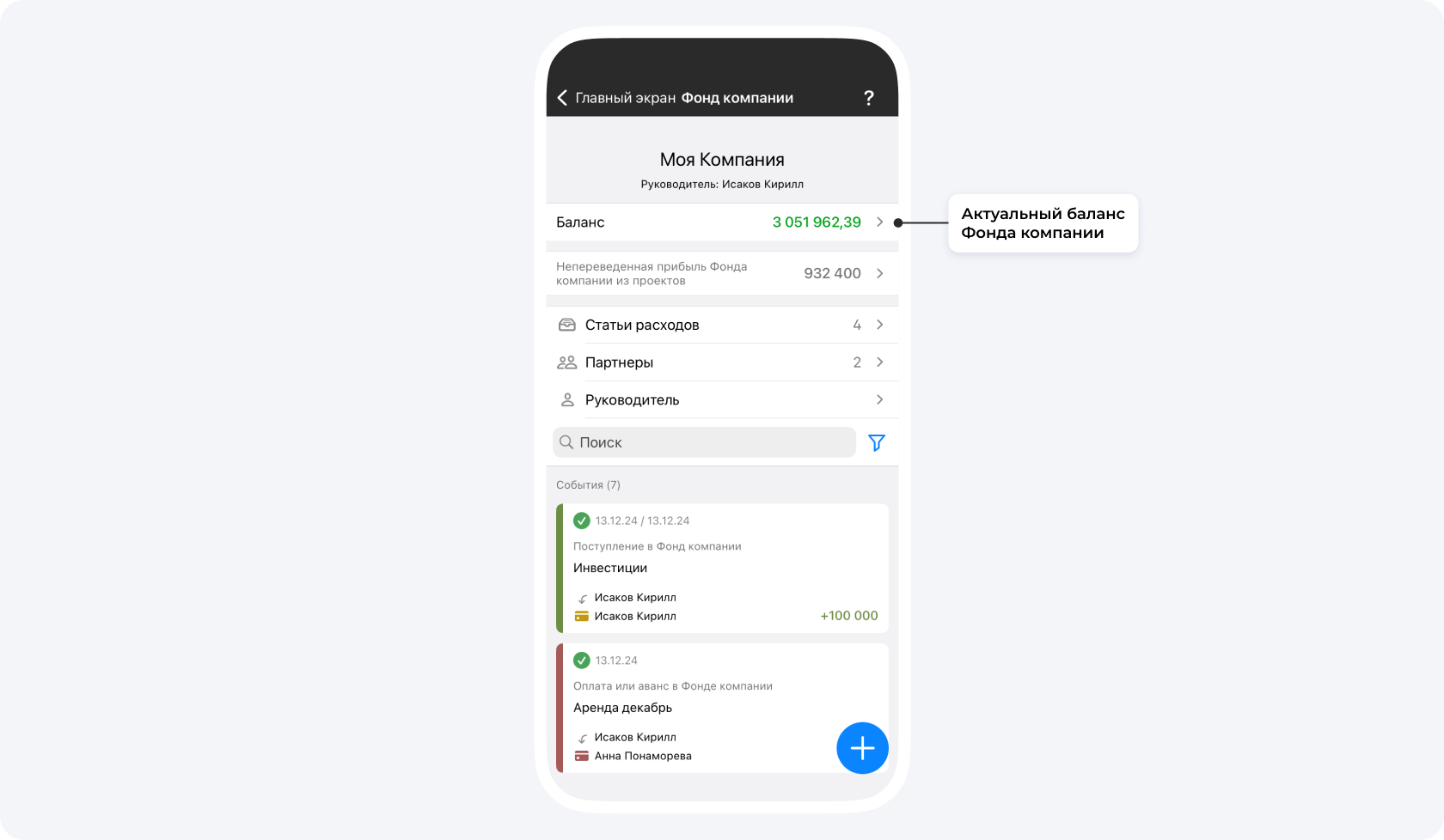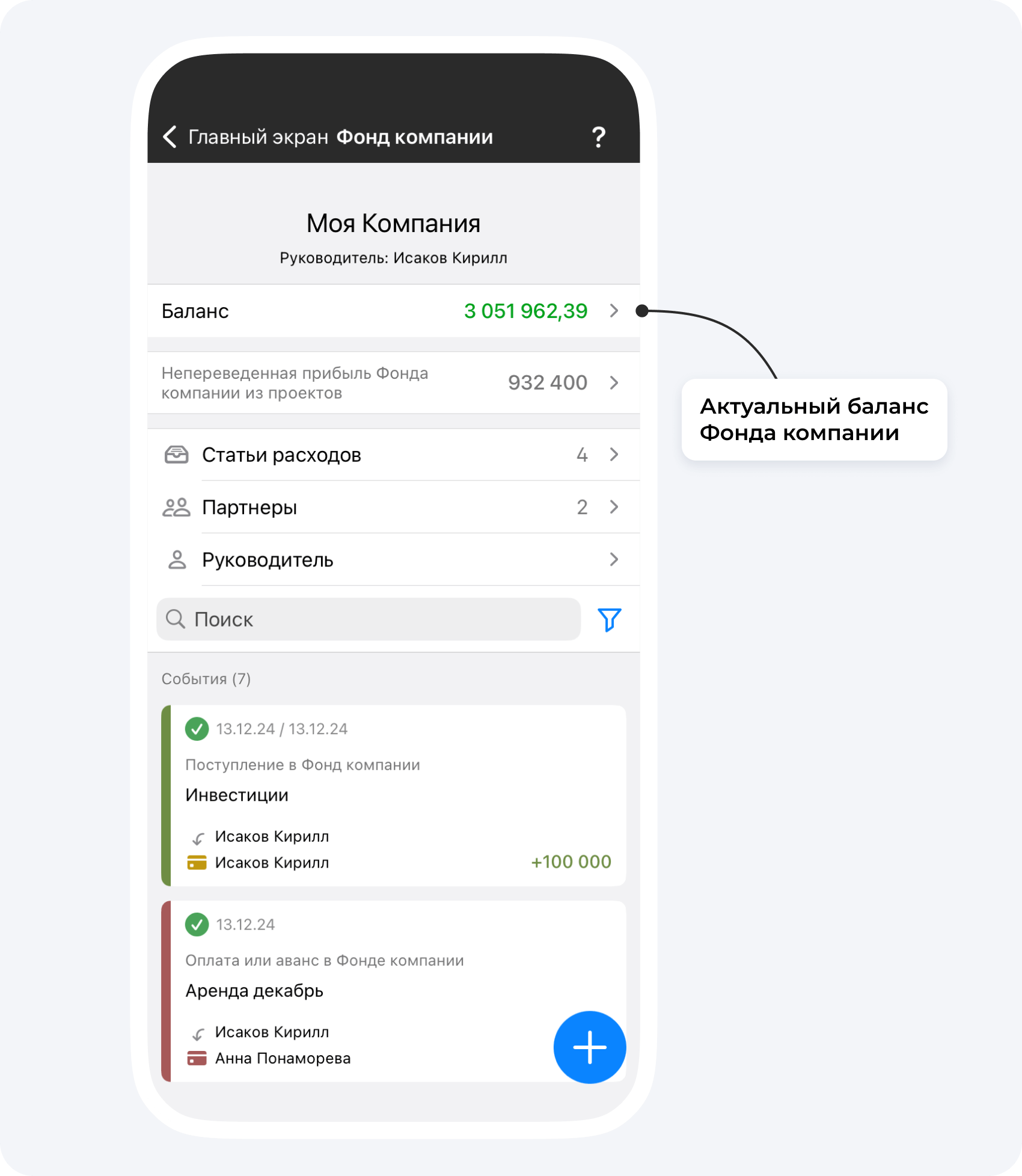 Воспринимайте фонд как еще один проект, в котором вы ведете учет. В Приложении 101 вы можете добавить фонд (расходы на компанию) в распределение прибыли. И у каждого контрагента, с подотчета которого были переведены средства, будет свой актуальный баланс в фонде, чтобы всегда знать, у кого на руках находятся деньги.
