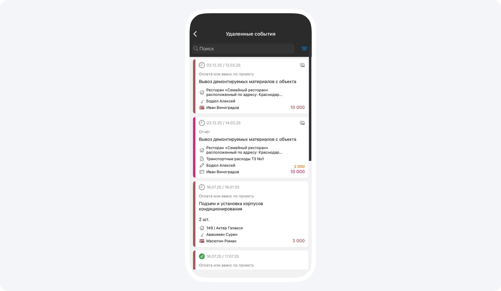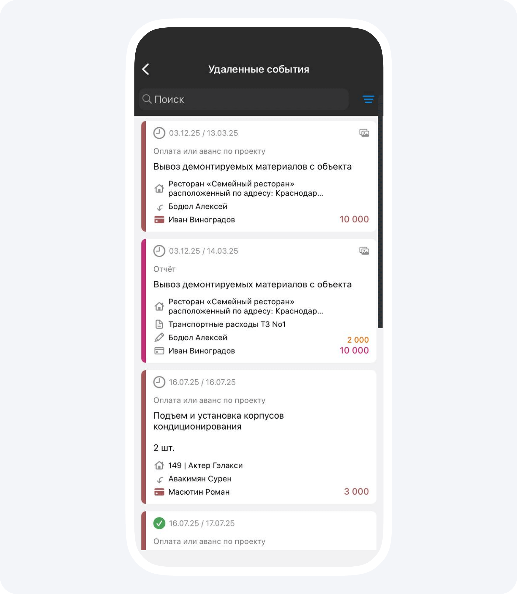 В разделе История событий на главном экране приложения вы можете просмотреть и восстановить любое удаленное событие в вашем аккаунте.