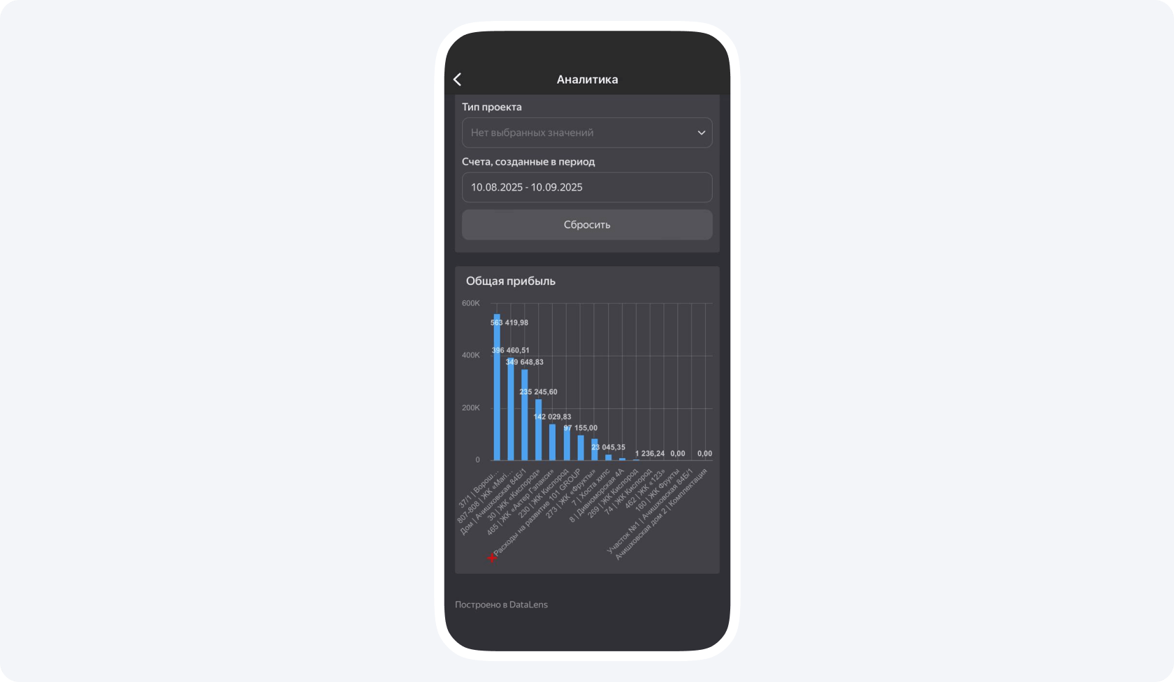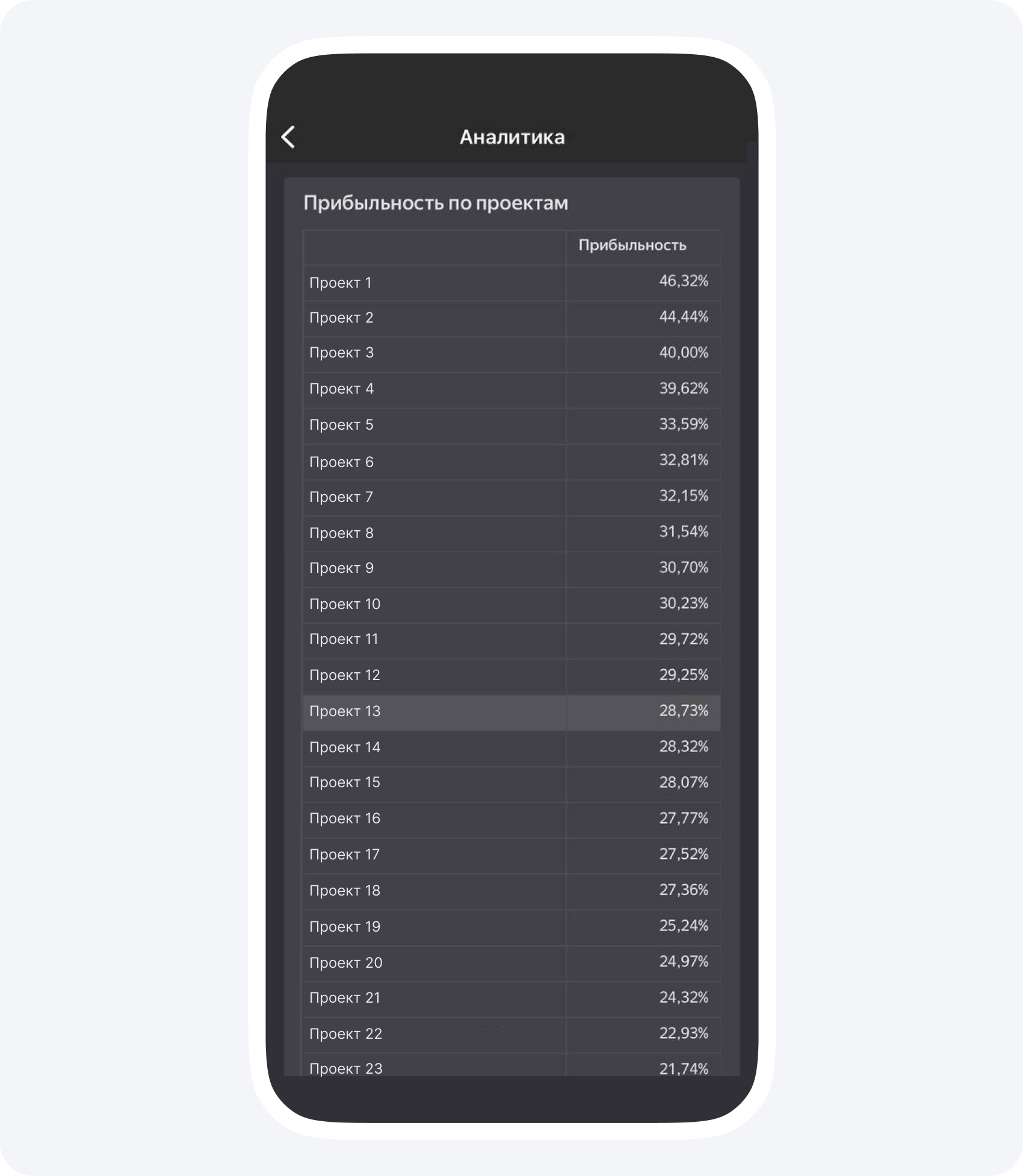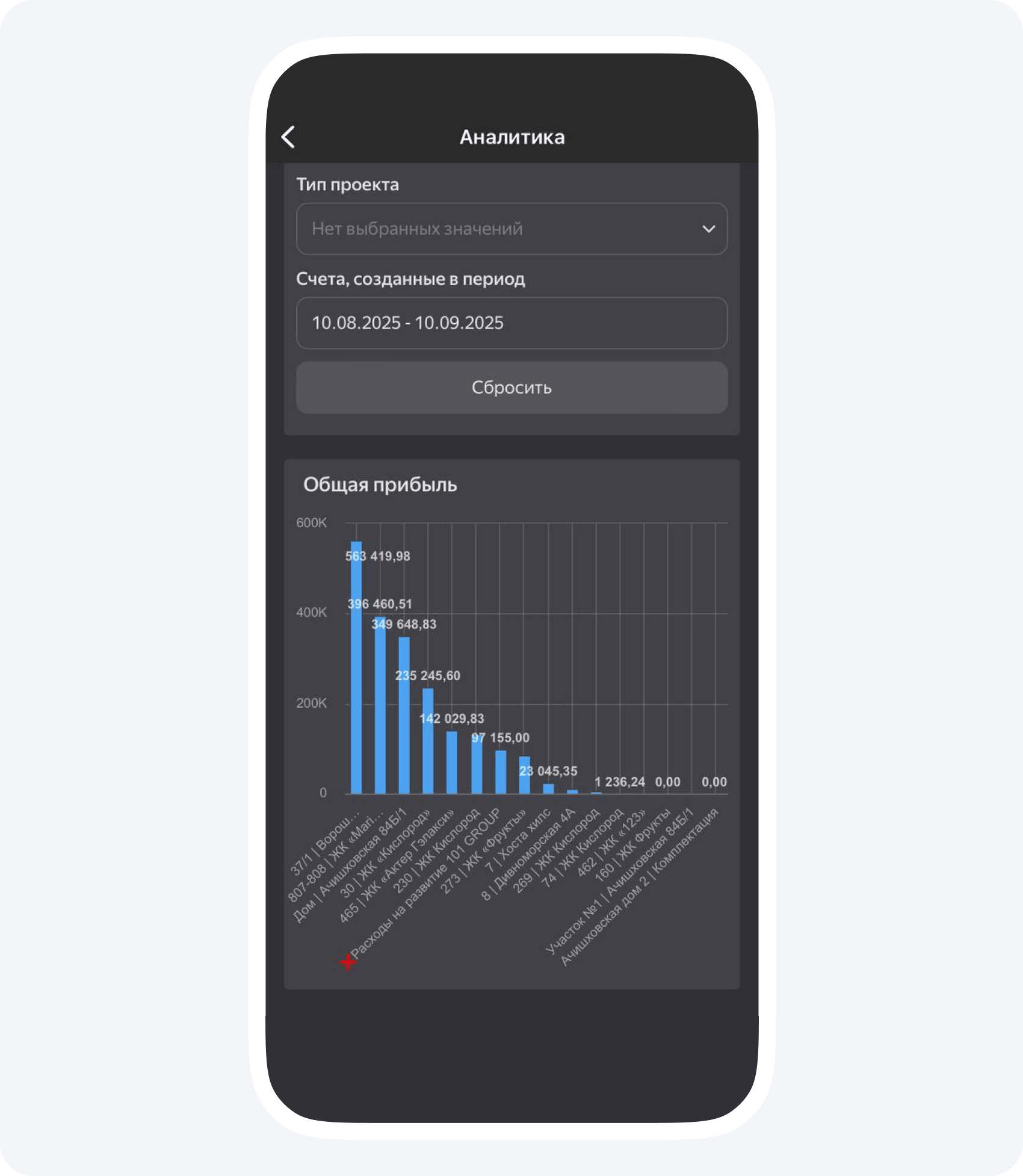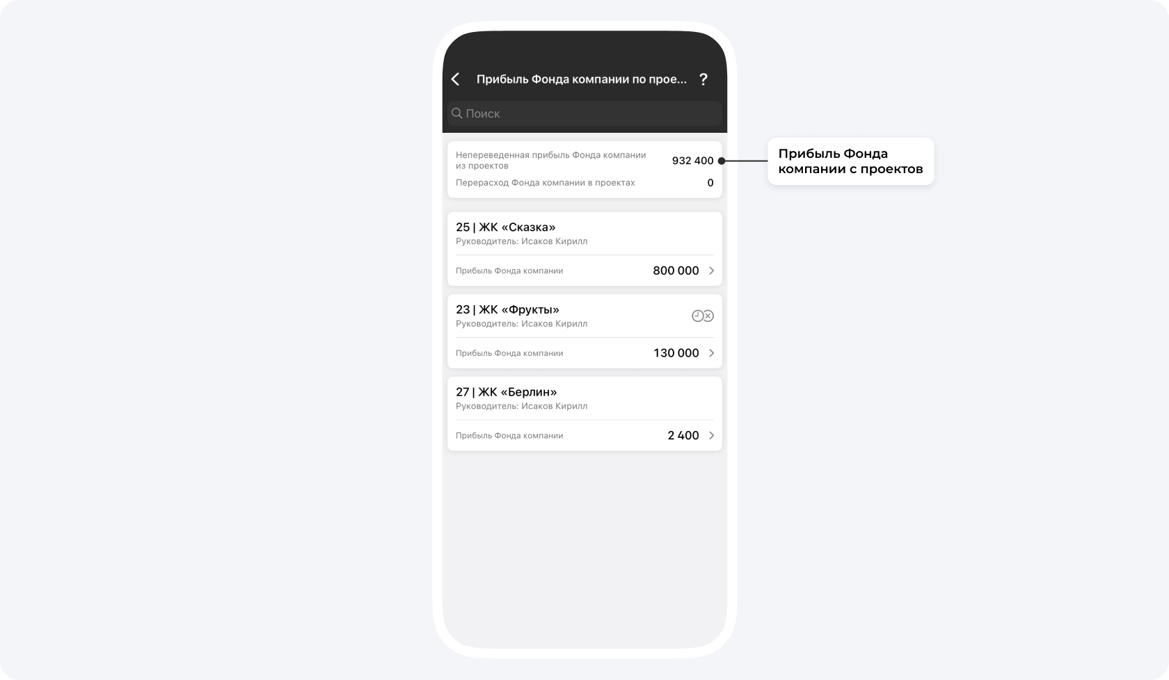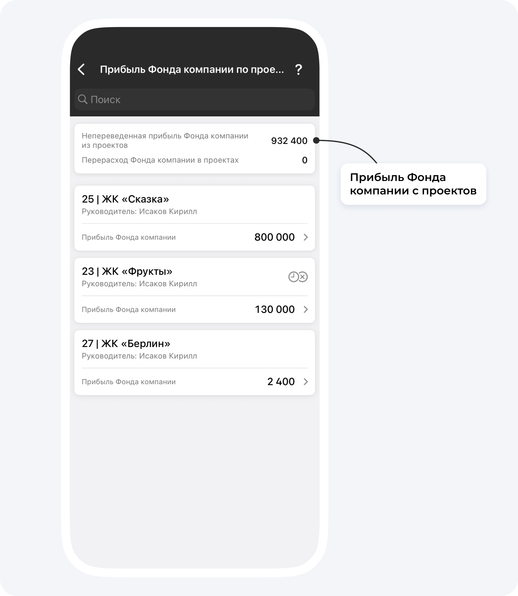 Вне зависимости от того, добавлены ли вы в проект, как руководитель компании вы будете видеть сумму прибыли, которую заработала компания с каждого проекта.